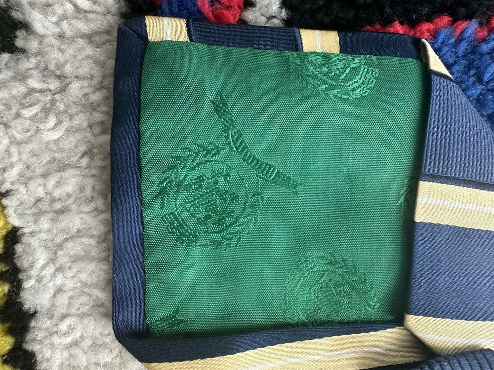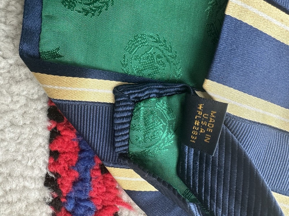 This Vintage Tommy Hilfiger Men's Silk Classic Neck Tie is a stylish accessory made in the USA. It features a geometric yellow and blue pattern with the iconic Tommy Hilfiger logo accents. Crafted from 100% silk fabric, this wide tie has a pointed style and is adjustable for a comfortable fit around the neck. The classic length of 59 inches and 3.5-inch width at the tip make it a versatile piece that adds a touch of American heritage to any man's outfit.