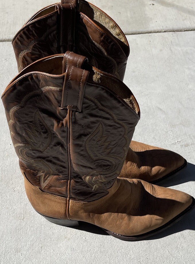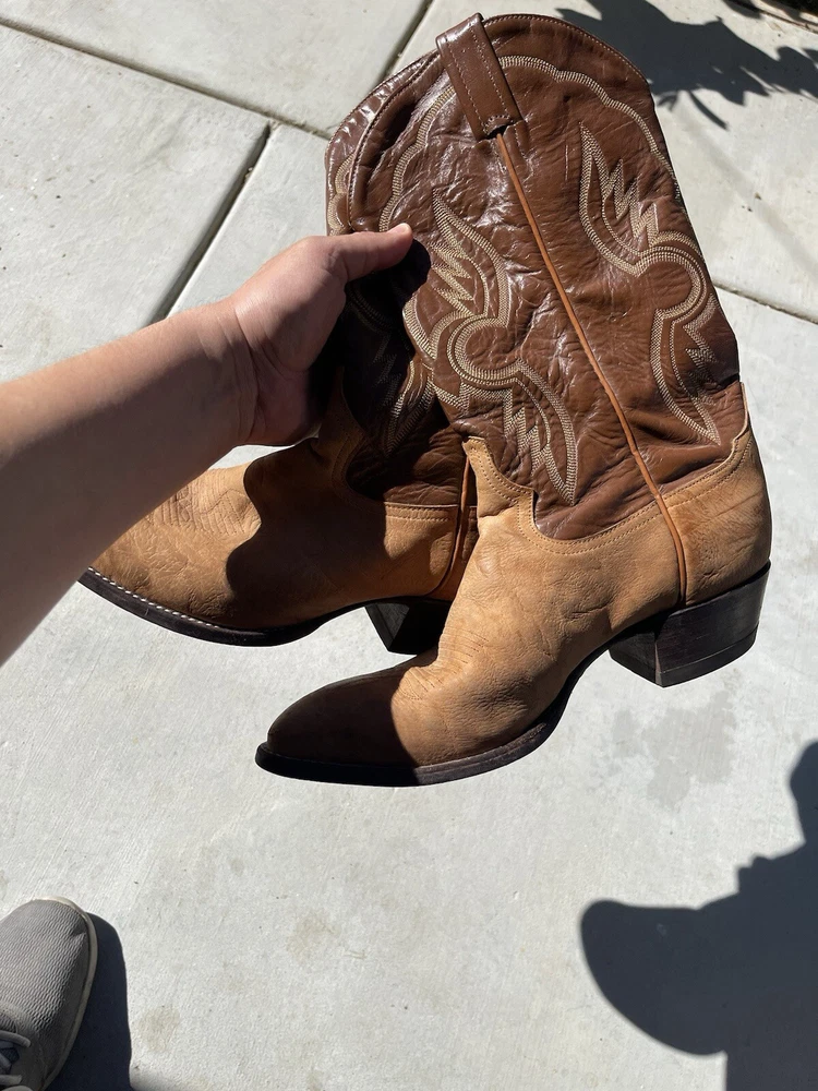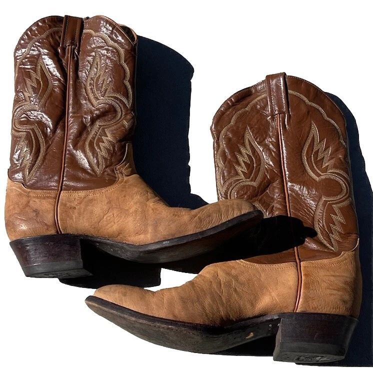 These vintage Tony Lama leather cowboy boots are a true gem for any western enthusiast. The dark brown and tan color combination, along with the men's size 9 fit, make them a perfect addition to any cowboy's wardrobe. The boots' outsole and upper material are both made of high-quality leather, ensuring both durability and style. The boots' brand, department, type, and model are all Tony Lama, men's, boots, and 1980s respectively. Their style is western, with a cowboy theme, and they were manufactured in the United States. These boots are perfect for anyone looking to add a touch of vintage style to their wardrobe.