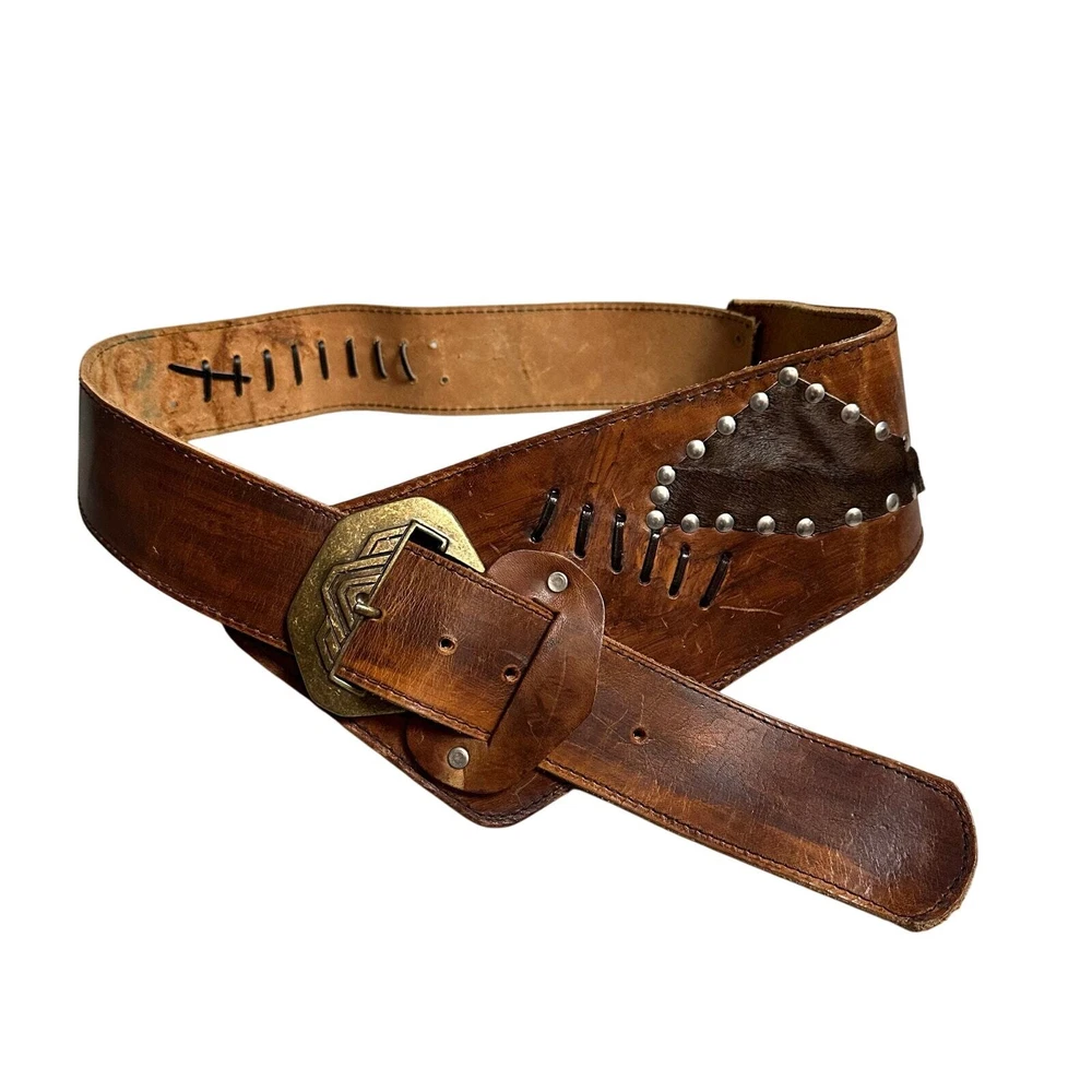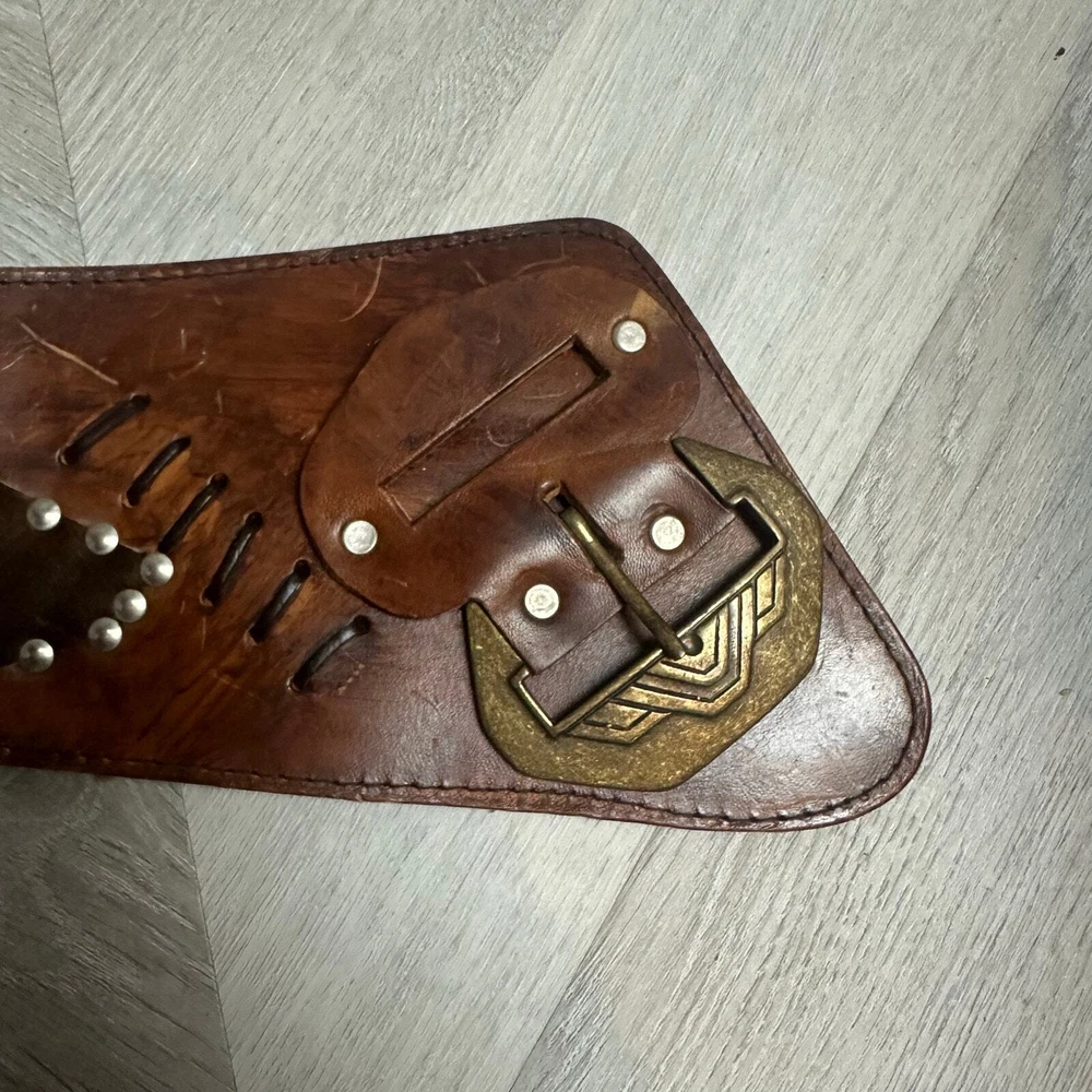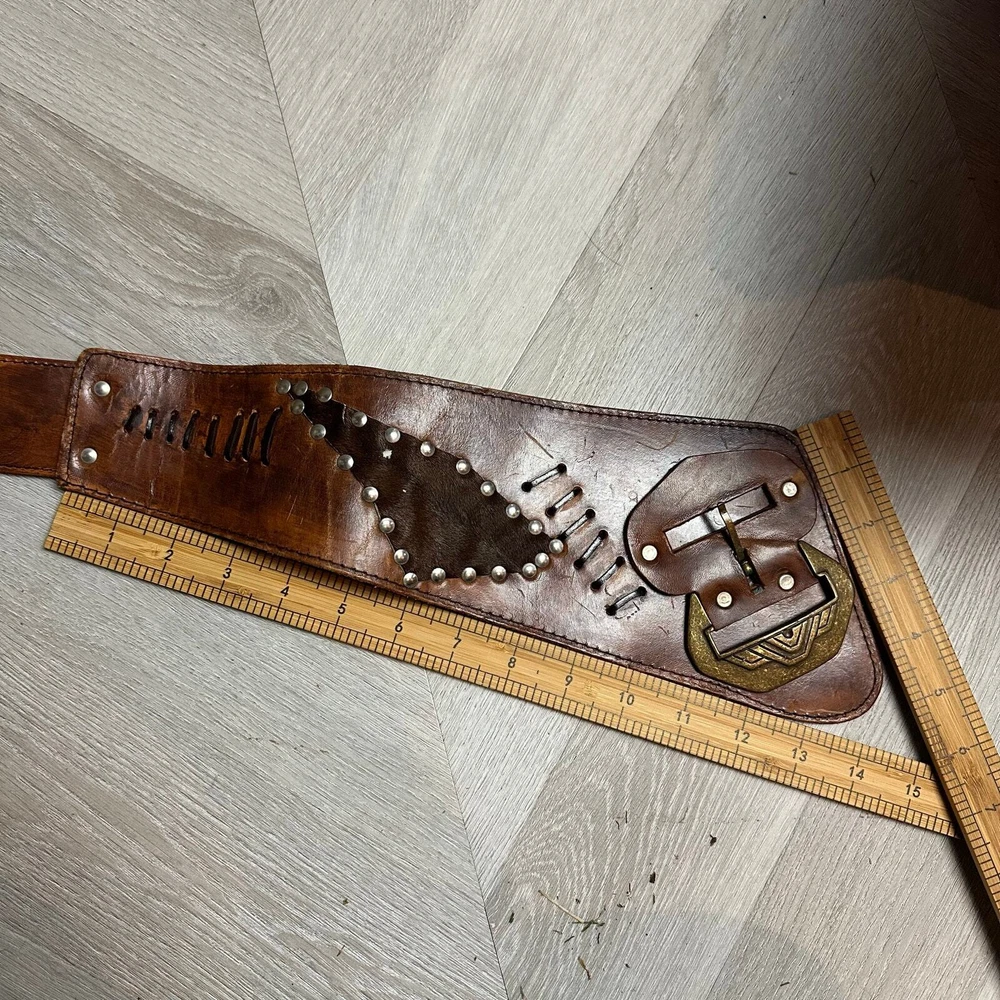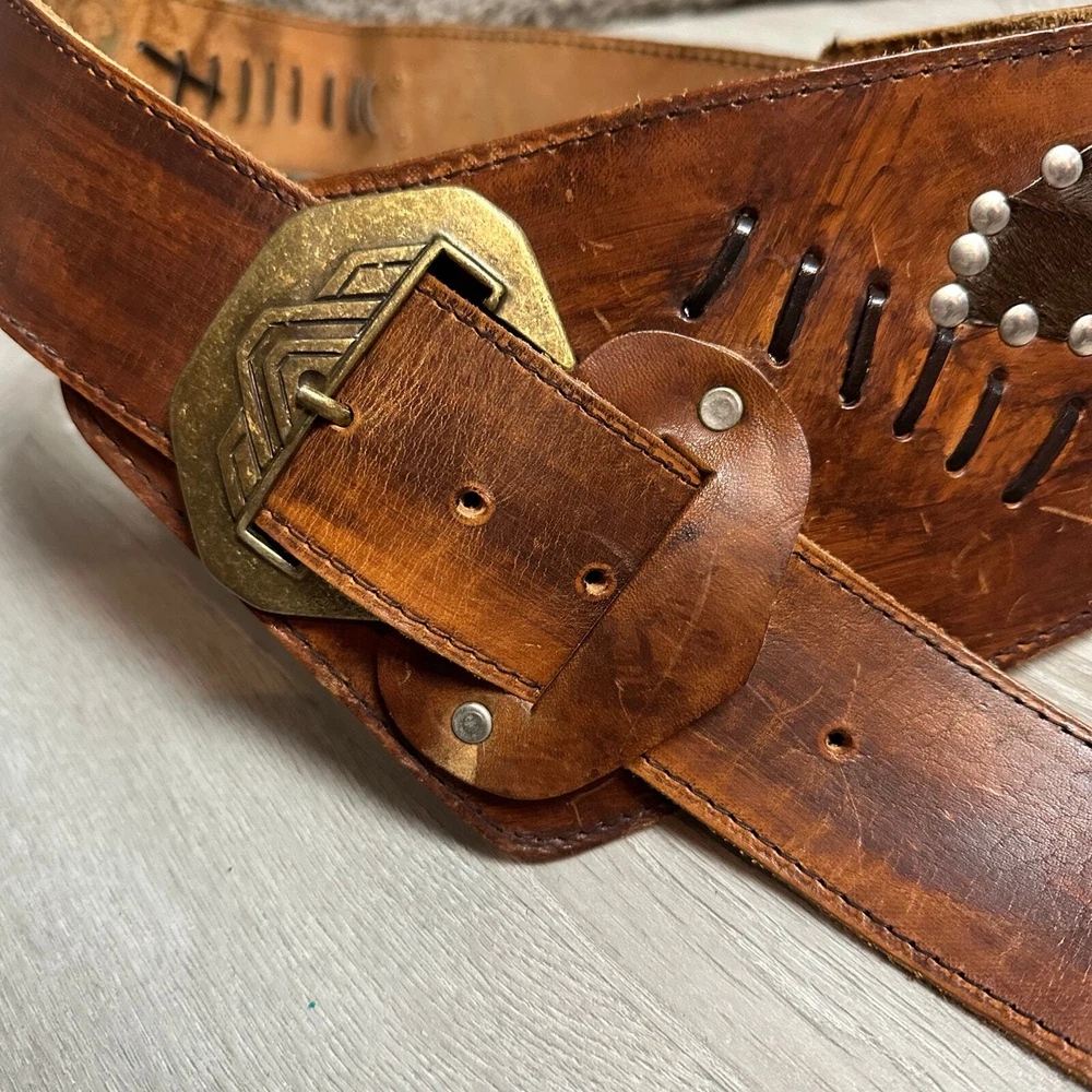 Vintage Tooled Brown Leather Crossover Belt Criss Cross Western Montana Yellowstone Moroccan Asymmetrical Gorgeous belt with unique details. It's in overall great shape but at one set of leather stitches the leather string has broken midway... could be replaced, or worn as is, does not affect function of the belt. See photos for details and other signs of wear. Total length without buckle: ~40". Other measurements in photos.