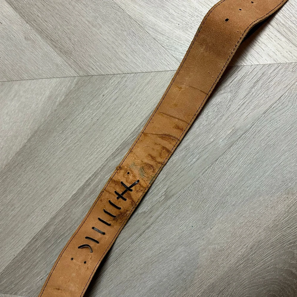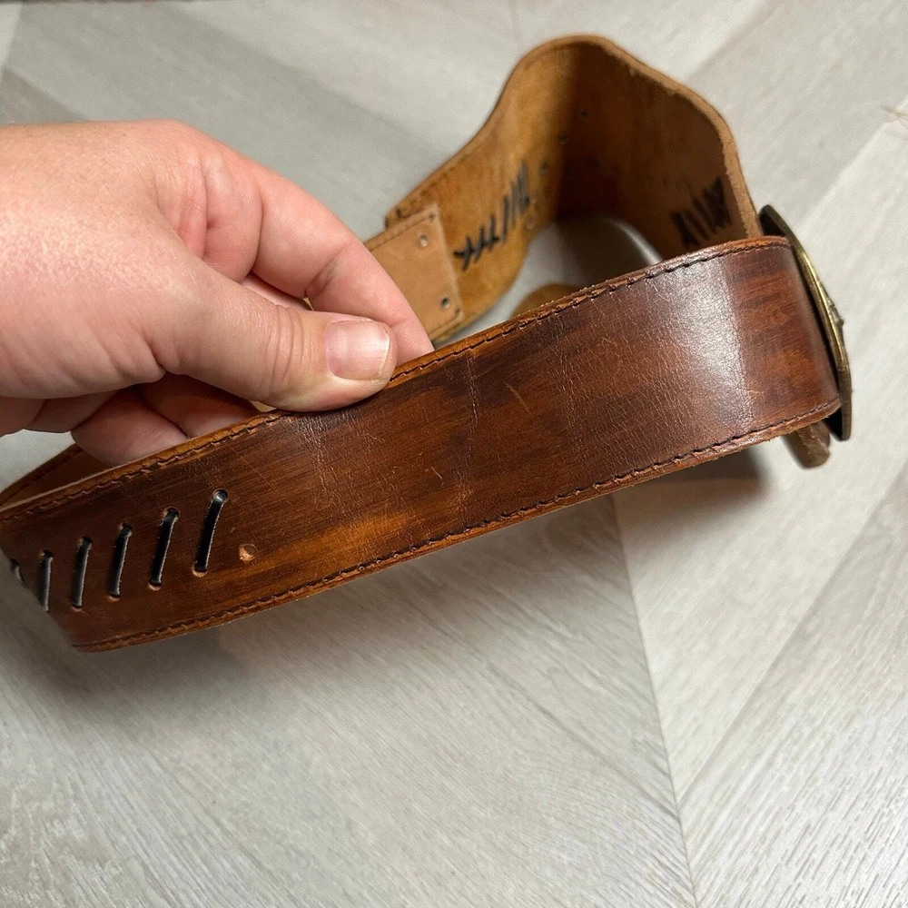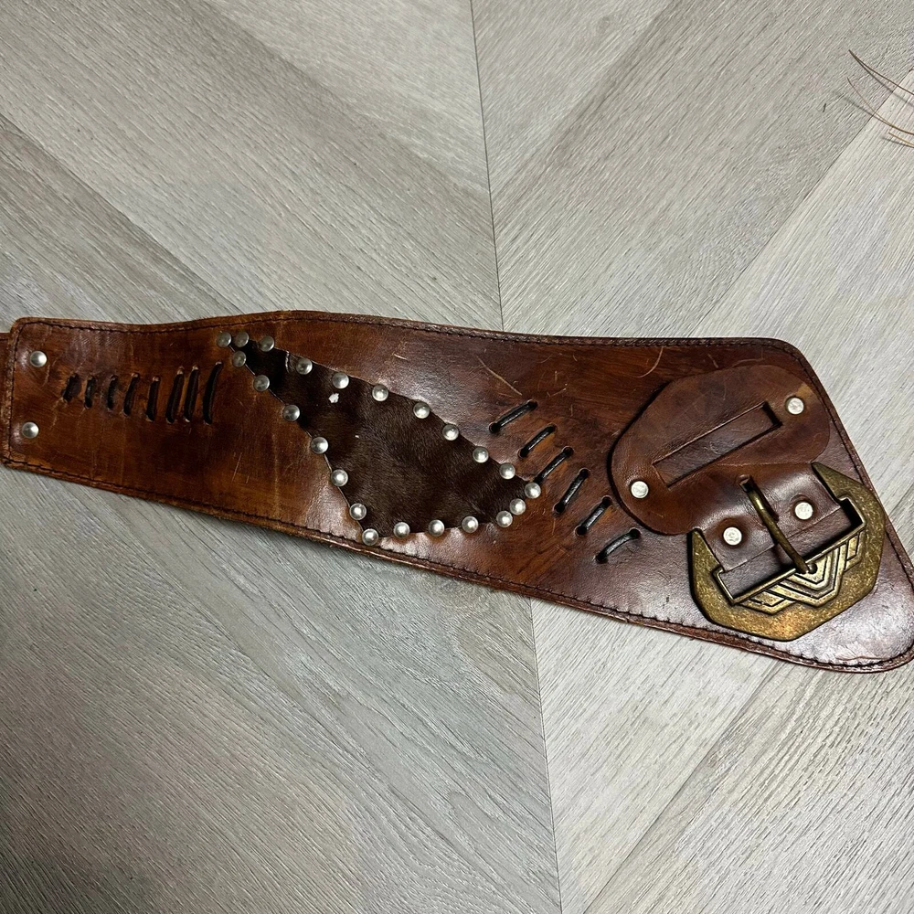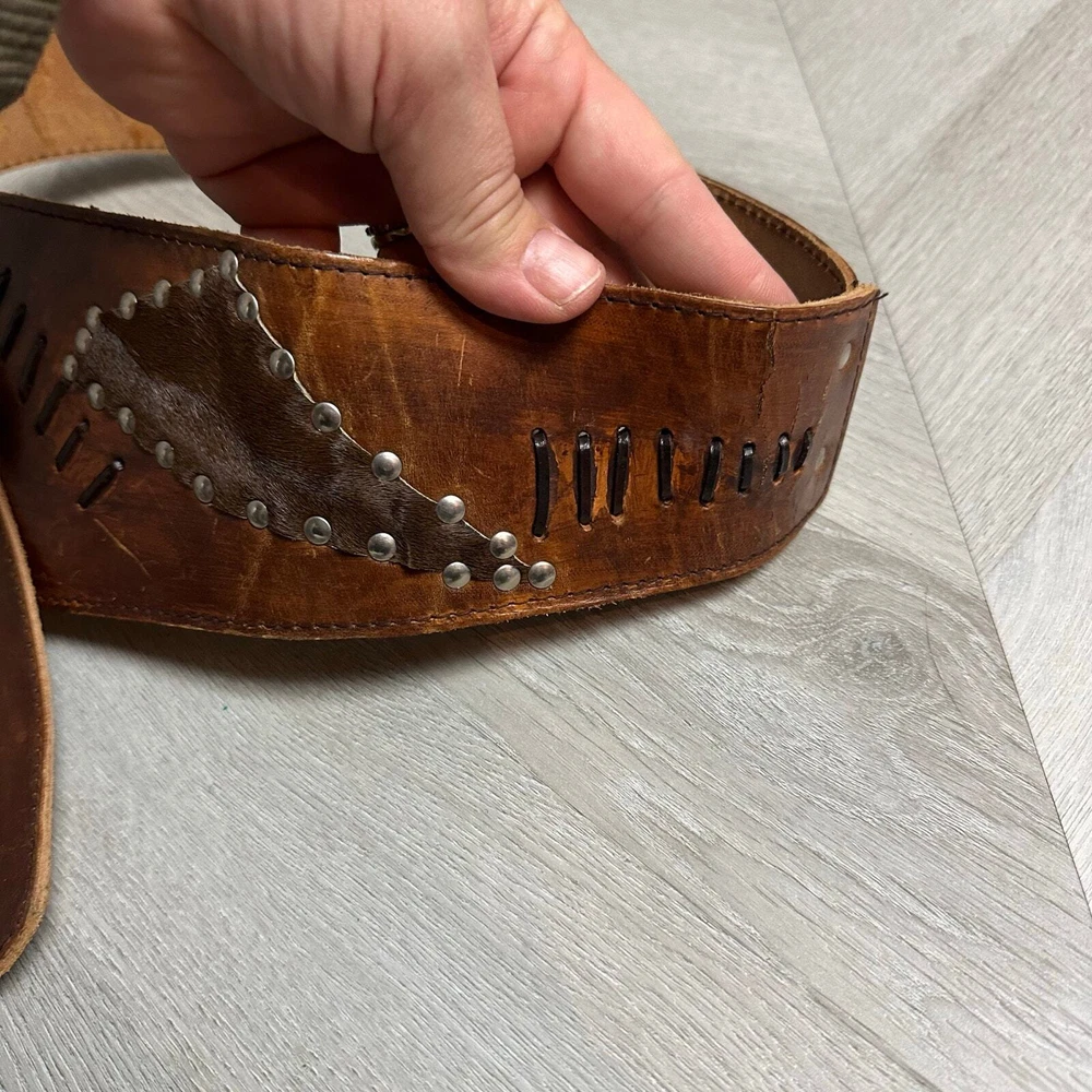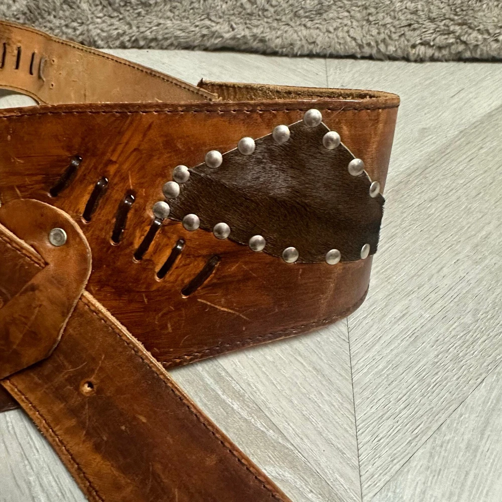 Vintage Tooled Brown Leather Crossover Belt Criss Cross Western Montana Yellowstone Moroccan Asymmetrical Gorgeous belt with unique details. It's in overall great shape but at one set of leather stitches the leather string has broken midway... could be replaced, or worn as is, does not affect function of the belt. See photos for details and other signs of wear. Total length without buckle: ~40". Other measurements in photos.