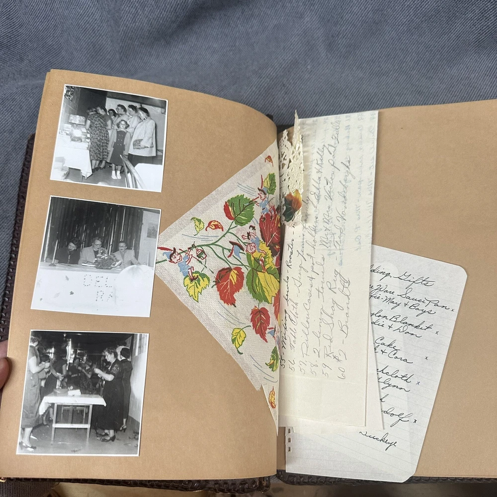 10”x13” tooled leather scrap book filled with photos, letters, notes, cards, announcements, et 31 pages