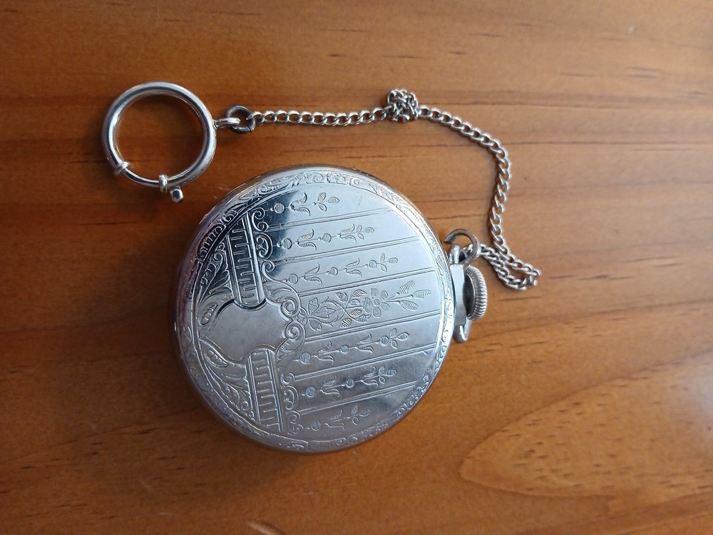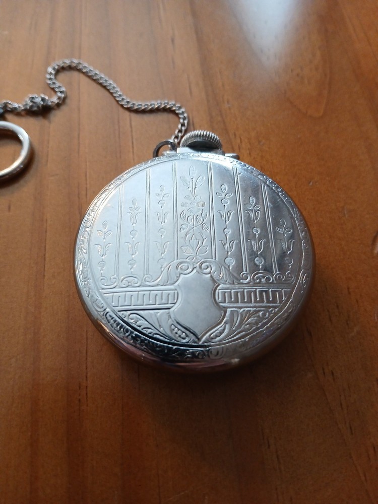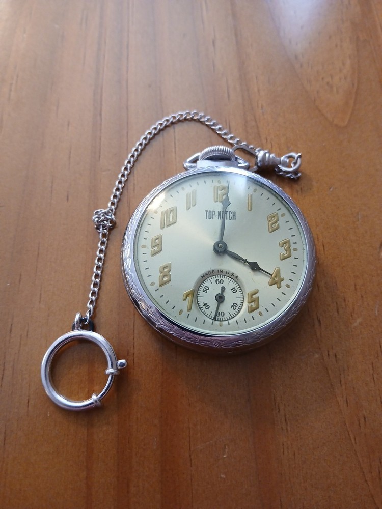 The Vintage Top Notch Brand Pocket Watch Eingraham Runs is a classic timepiece with a mechanical hand-winding movement and Roman numerals on the yellow gold dial. I don't believe that the chain with this watch does NOT go with the watch but I will leave it on. This pocket watch features an open face closure, silver case, and a snap caseback. Made in the United States, this vintage piece is perfect for collectors or those looking for a unique and stylish accessory. Preowned and in good condition.