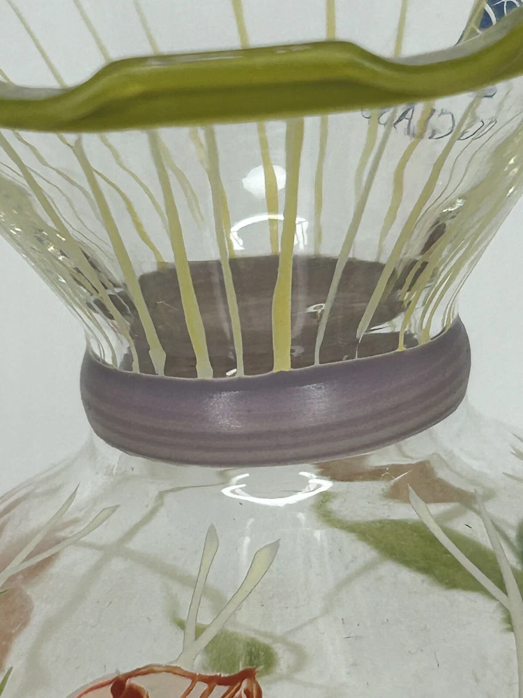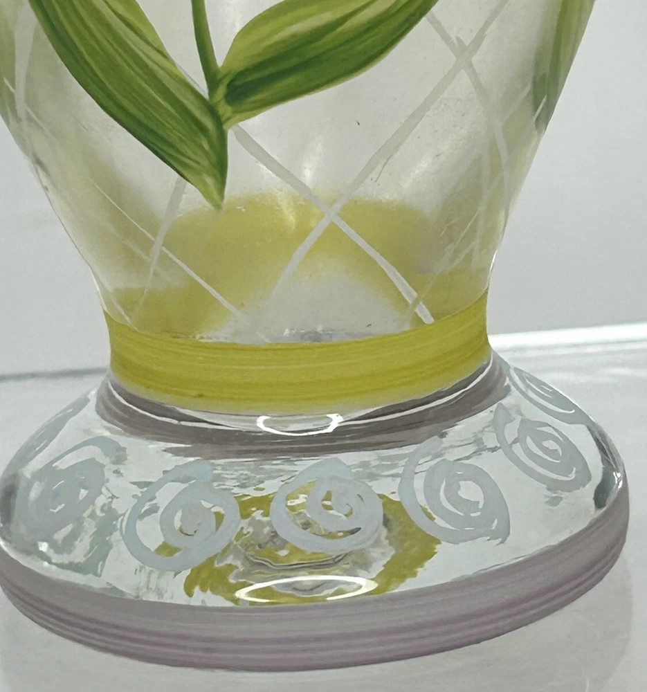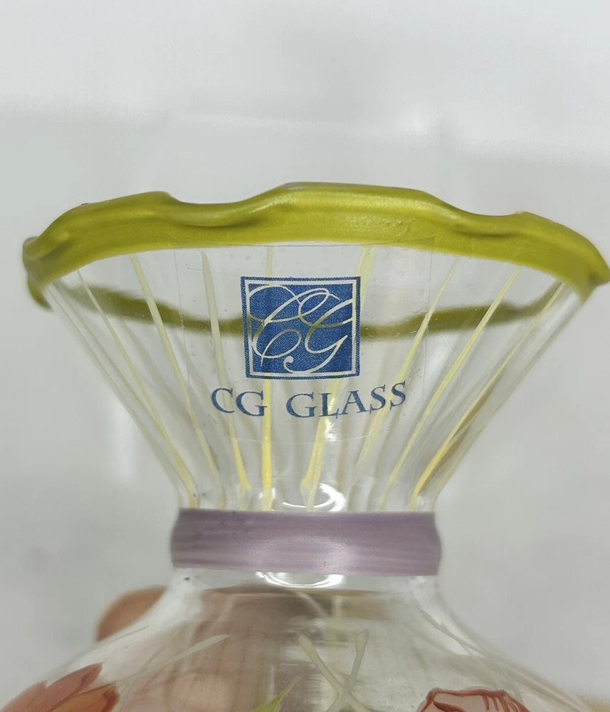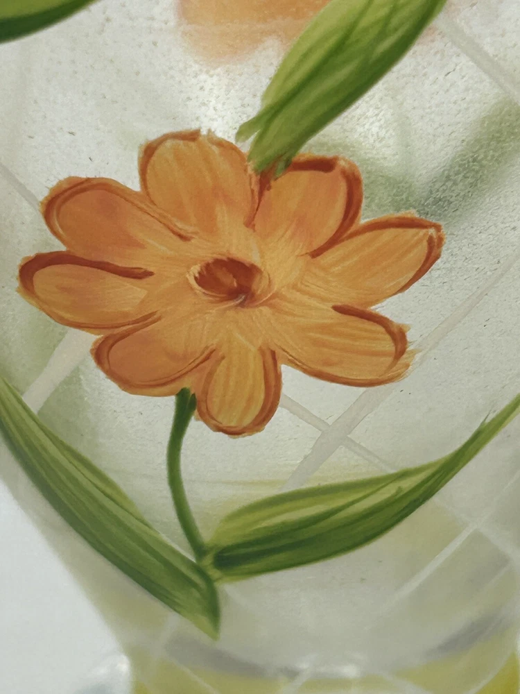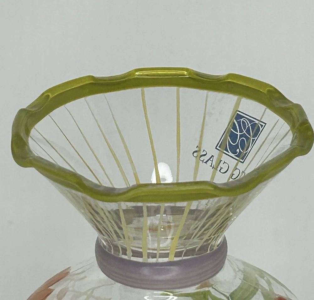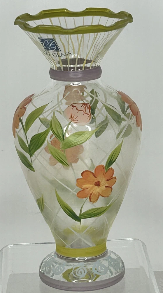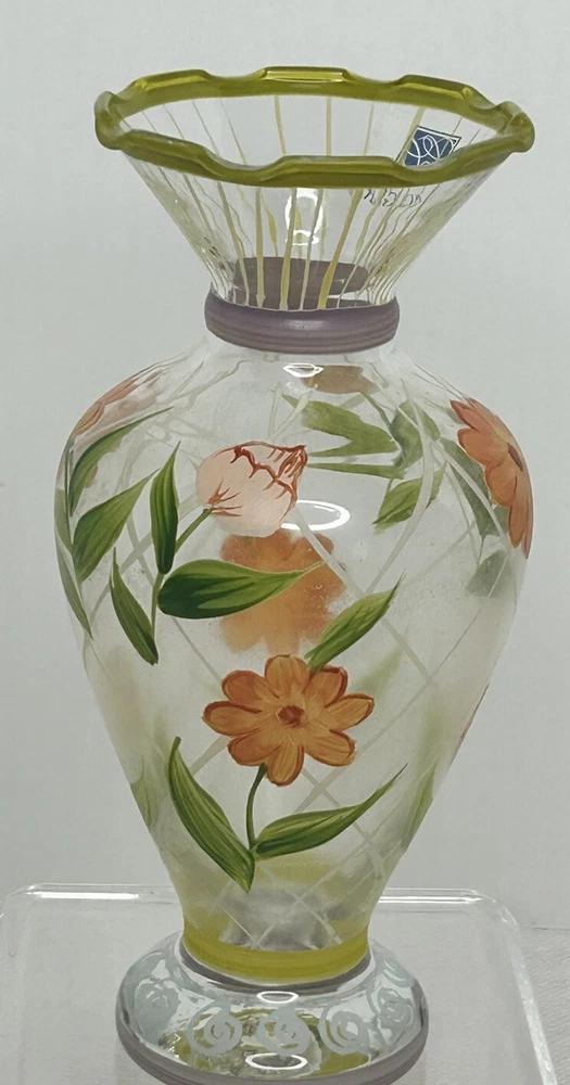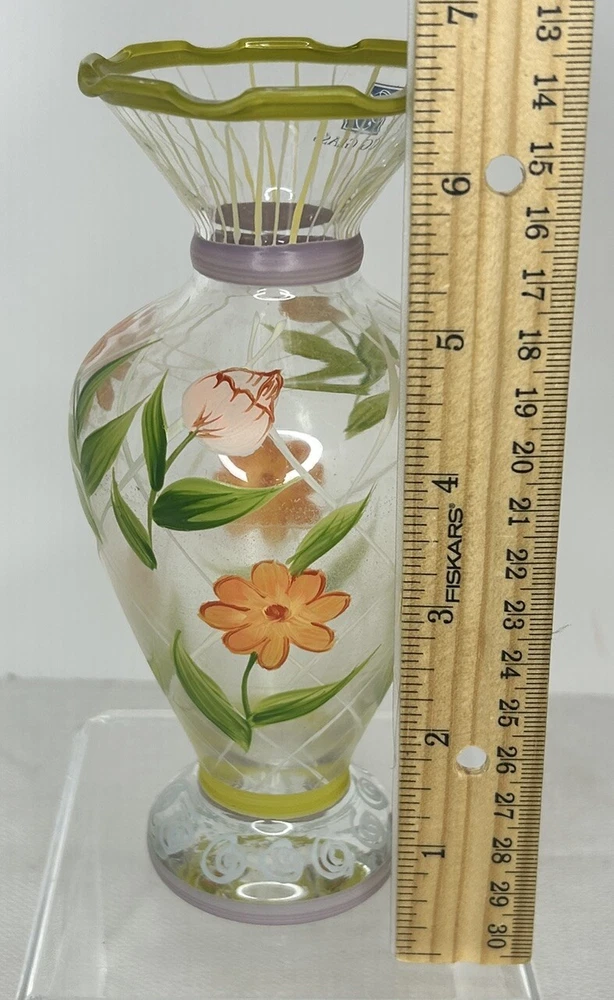 Vintage Tracy Porter Hand Painted Glass Floral Bud Vase Ruffled Edge Cottage Decor 6.5" Beautiful vintage hand painted bud vase, decorated with orange and green florals, highlighted with yellow and lavender trim will add Vintage Tracy Porter Hand Painted Glass Floral Bud Vase Ruffled Edge Cottage Decor 6.5" is in excellent vintage pre-owned condition, with NO chips, cracks, repairs or discoloration. Please review all pictures for proper assessment of its excellent vintage pre-owned condition.