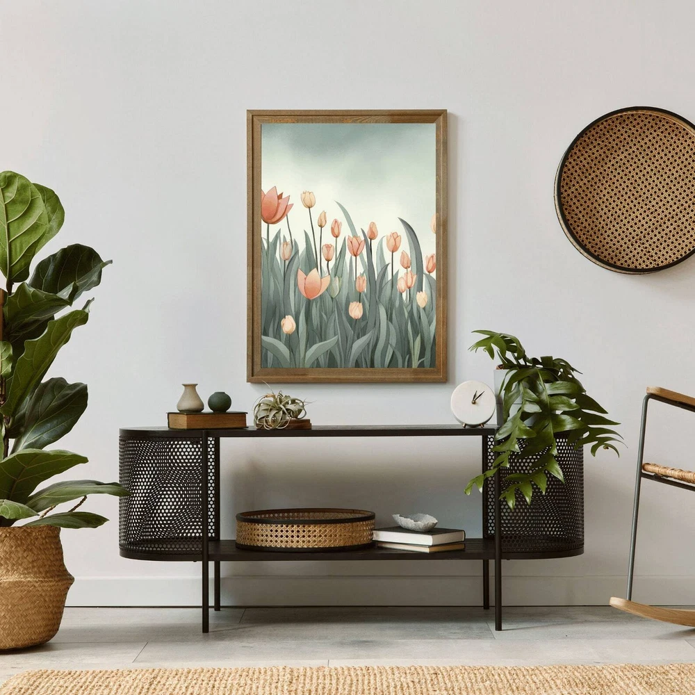 Vintage Tulip Field Painting Blooming Flowers Beautiful Floral Decor Muted Green Beige And Pink Wall Art Material: Premium luster photo paper Print type: Inkjet printing One side printed + The finish provides the highest possible resolution and color saturation + Lasts up to 200 years in color and 400 years in black-and-white + Printed on high-quality resin-coated photo base paper medium + Posters can be hung with double-sided tape, tacks, or framed + Hand washing with a gentle cry cloth is recommended for extended durability I will hand select the best choice of paper for your chosen design to ensure top quality results for a beautiful, bright and luxurious print. All prints are sealed in cellophane slips for protection during transportation, and are shipped in a protective cardboard envelope.