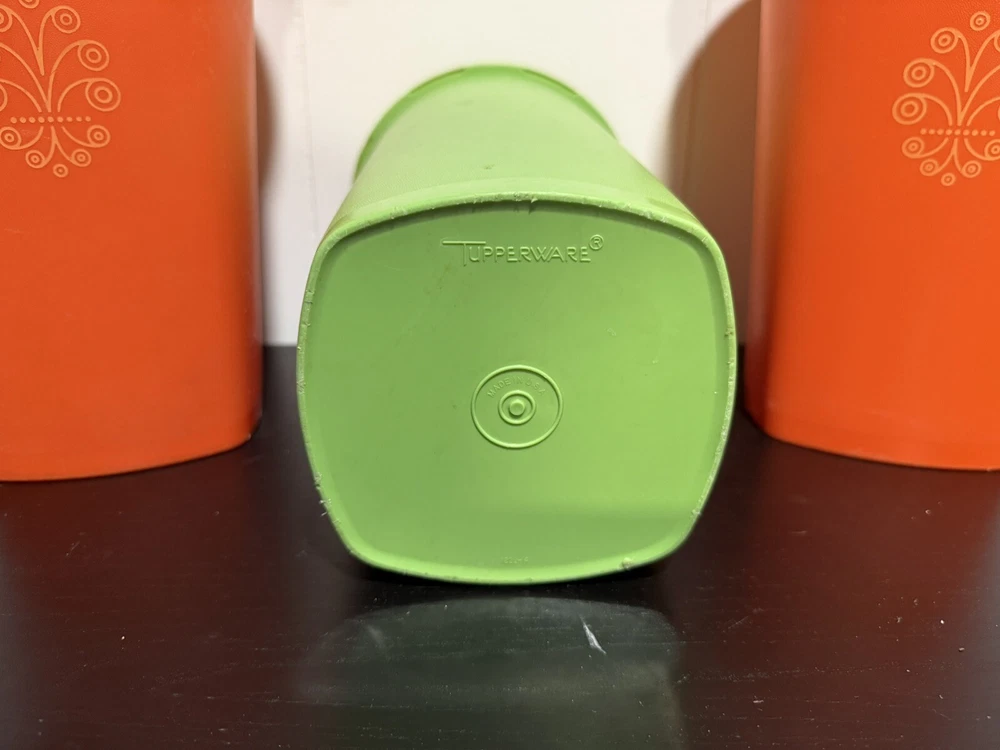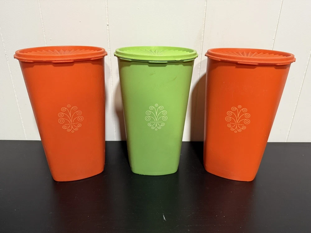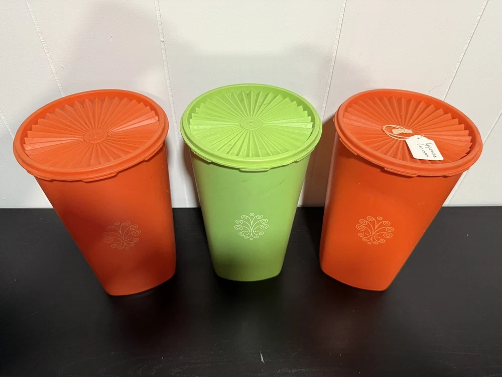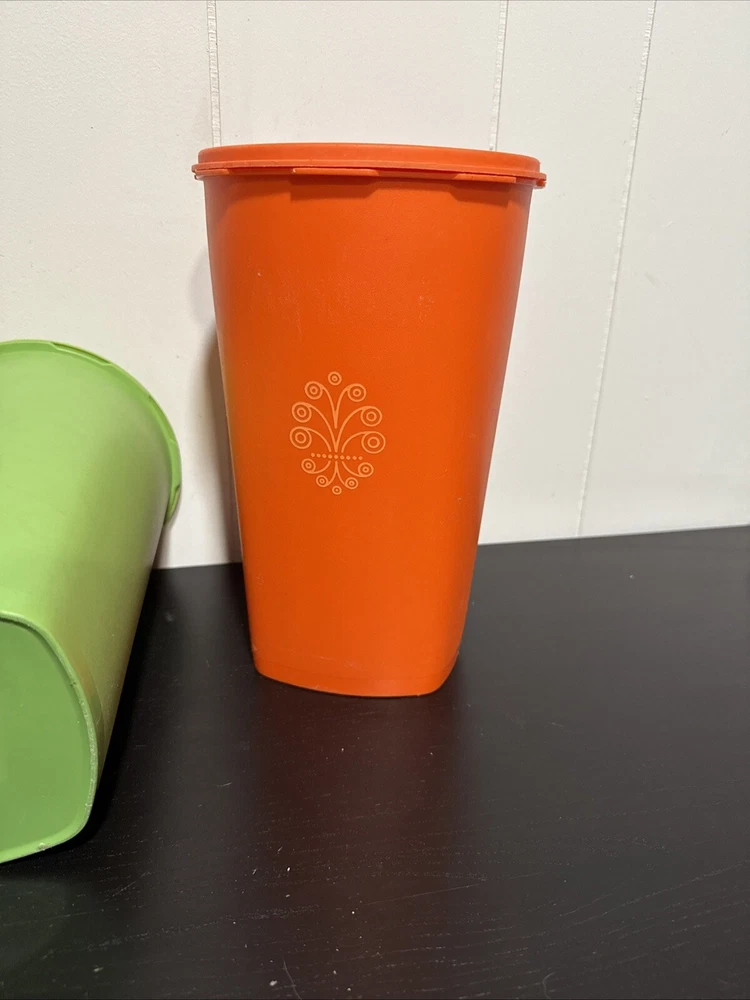 Vintage Tupperware set #1222 Two Orange and one Green Servalier Canister with #808 seal. This set includes 3 canisters in a retro style, featuring a food/kitchen theme. The canisters measures 10 1/2" in height, with dimensions of 6 1/2" in length and width. The model is Tupperware 1222, known for its original design. This vintage is in very good condition.