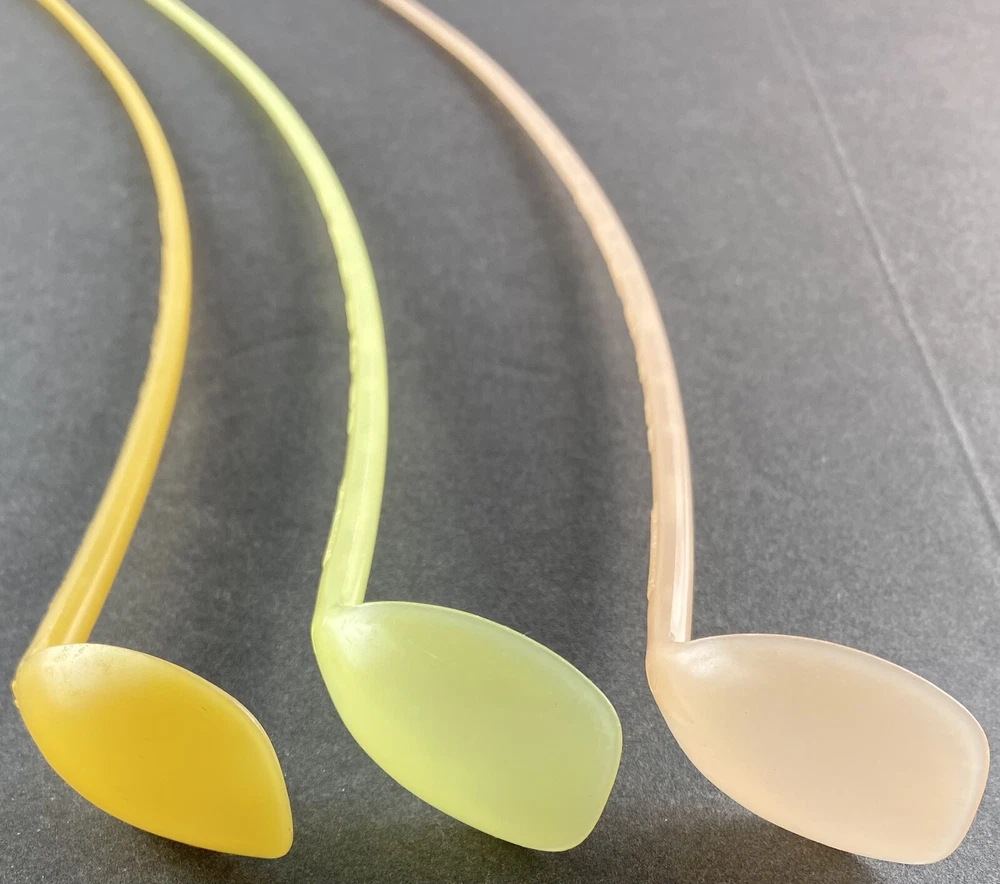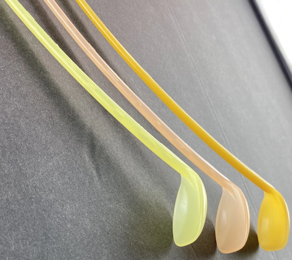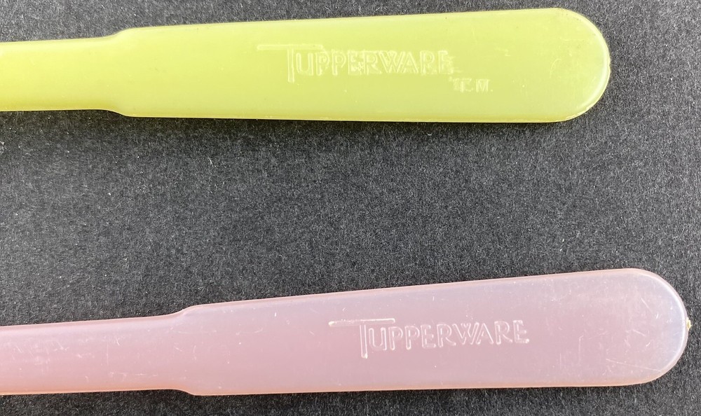 One spork is bent on the end, see photos. This vintage Tupperware silverware set includes a spork/fork and a spoon, both made of durable plastic material. The set is perfect for collectors or for everyday use, especially for those who prefer lightweight utensils. The handle of each utensil is also made of plastic for a comfortable grip. The set also comes with a long ice tea spoon, making it a complete package for any meal. Whether you're dining outdoors or indoors, this Tupperware silverware set is a great addition to your collection or kitchen.