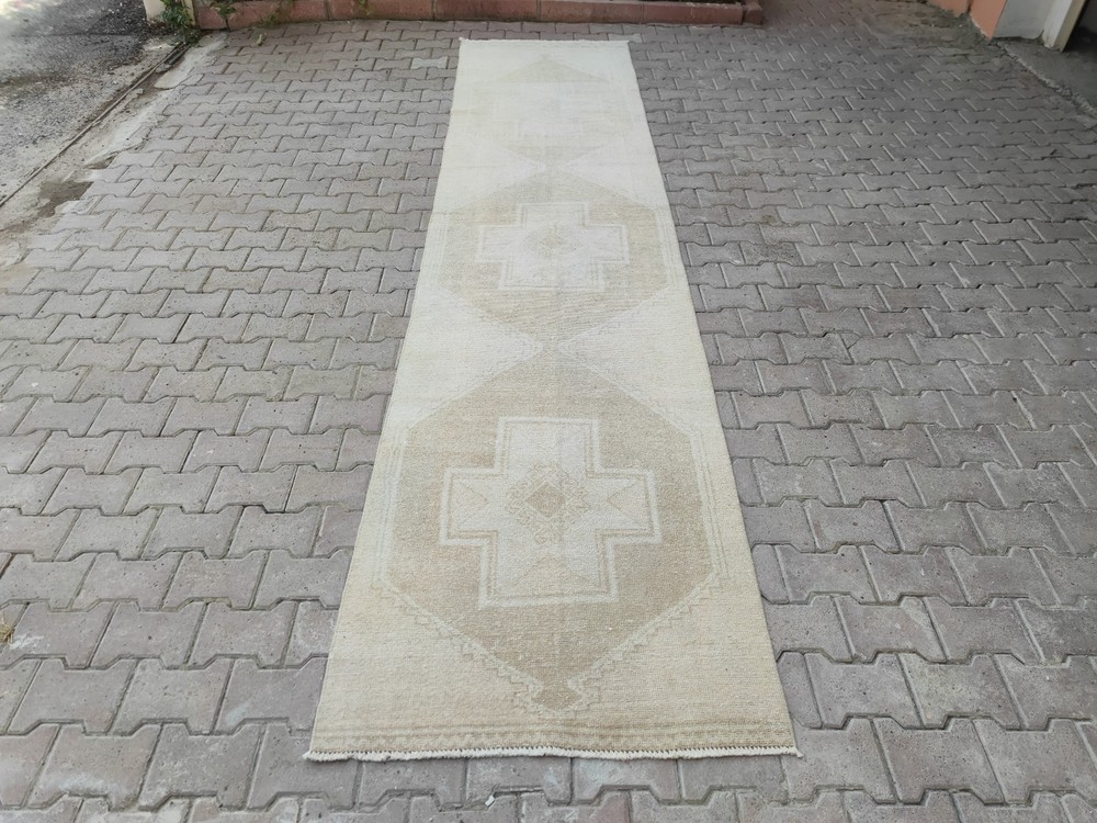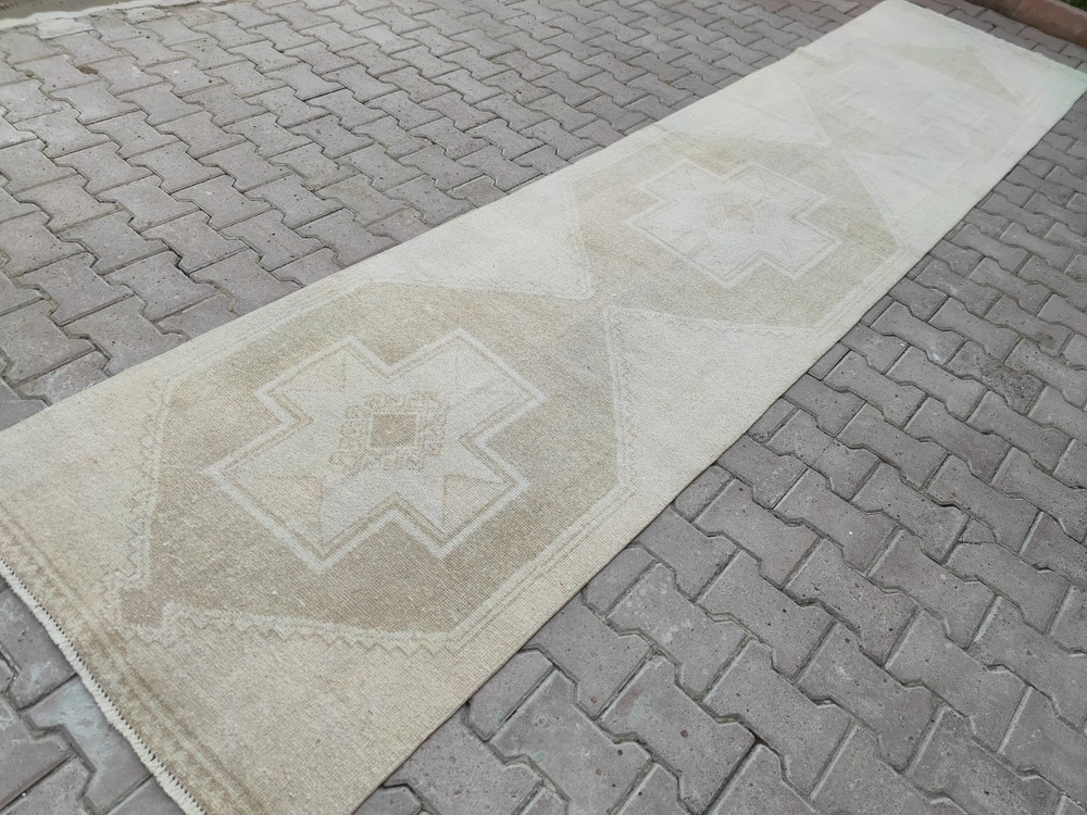 Sweet Product Story Indulge in the timeless charm of this Vintage Runner Rug , a stunning Turkish Runner that whispers stories of Anatolian heritage and artistry. Handwoven decades ago by skilled Turkish artisans, its soft Neutral Rug palette of elegant blue and white tones exudes understated luxury, perfect for sophisticated interiors. This masterpiece is not merely a floor covering; it’s a slice of history, adding depth and soul to your living space. As trends come and go, a genuine Turkish Runner Rug remains a lasting investment—a piece that sparks conversations and transforms your home into an artistic sanctuary. Whether styled in modern minimalism or eclectic Bohemian Rugs decor, it effortlessly blends in, yet stands out. Production Process (Craftsmanship & Techniques) Every inch of this exquisite Handmade Runner Rug was created using traditional Oushak weaving techniques passed down through generations. Looms echo with rhythmic movement as artisans tie each knot with precision and patience, ensuring lasting durability and unique artistry. This is not machine-made; it’s human touch woven into art. The Wool Rug is dyed using natural vegetal pigments, giving it a sophisticated, muted finish that ages gracefully over time. The slightly distressed look—a signature feature of Vintage Rugs —creates a soulful patina that modern reproductions can never replicate. Materials Used 100% High-Quality Wool Pile Cotton Foundation Product Dimensions Metric: 94 x 412 cm ( 3,0 x 13,5 feet ) Usage & Care Instructions Vacuum gently without a beater bar. Rotate the rug every few months for even wear. Spot clean spills immediately with a damp cloth. For deep cleaning, consult a professional specializing in Vintage Rugs . Avoid prolonged direct sunlight to preserve natural dyes. Processing Time Your rug ships within 1-3 business days after your payment is received. We take pride in secure and careful packaging to ensure your Decorative Runner Rug arrives in pristine condition. Return Policy We gladly accept returns or exchanges if you wish to return your item for any reason. Please contact us within 14 days of delivery and ship items back within 30 days. Buyers are responsible for return shipping costs unless the item arrives damaged or faulty. If the item is not returned in its original condition, the buyer is responsible for any loss in value. If your package arrives damaged, please photograph it immediately and contact us so we can arrange a replacement or refund. Important Information Each Vintage Handmade Runner Rug is entirely unique and crafted by hand. If you order more than one piece, please note that subtle differences in color tones, shapes, and measurements may occur. These variations are not flaws but an inherent part of the artistry and individuality of genuine vintage works. Other Details Please feel free to message us with any questions about this Hallway Runner Rug or any other listings. We respond promptly despite any time zone differences. Interested in custom or wholesale orders? Drop us a message! ⭐ We offer discount coupons for buyers who leave a 5-star review. Your satisfaction means everything to us.