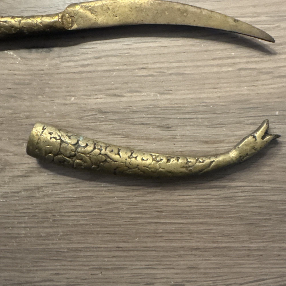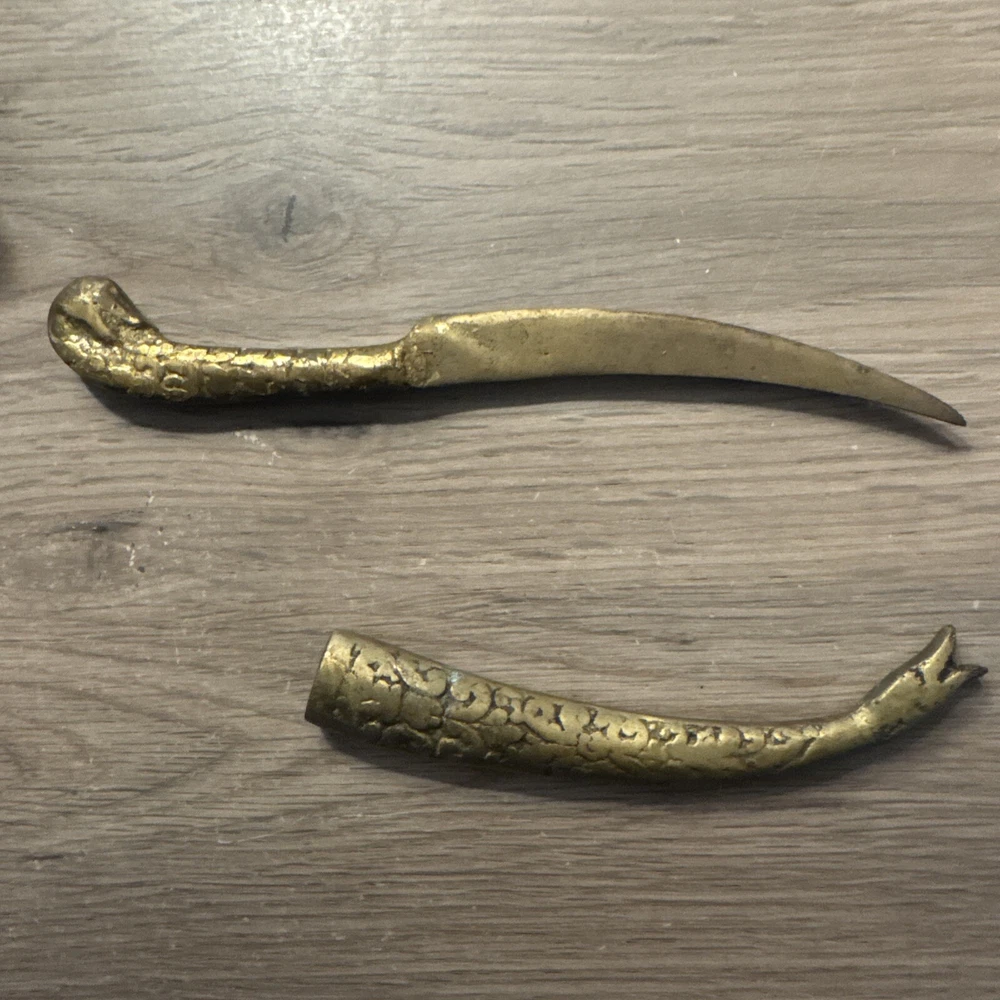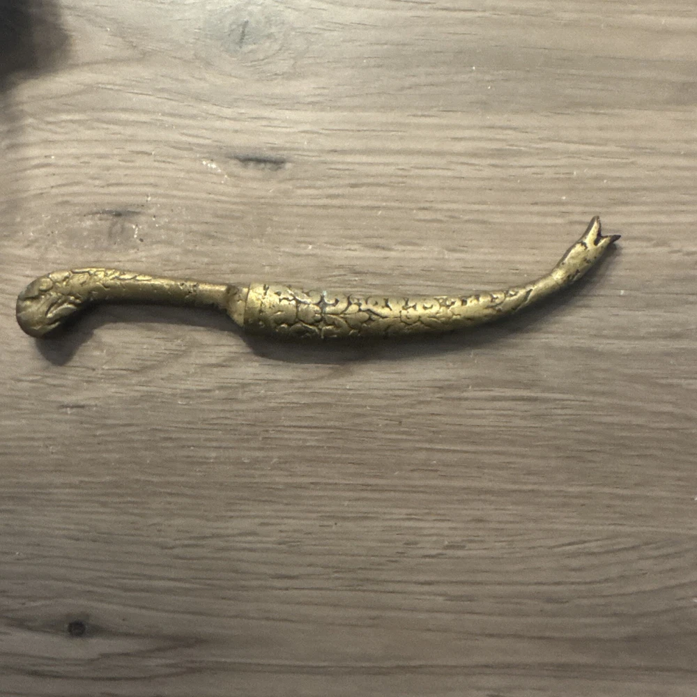 This vintage Turkish letter opener features a blade with a snake/serpent design, made of brass and marked with Turkish craftsmanship. It is a handmade item that comes with a sheath for storage.