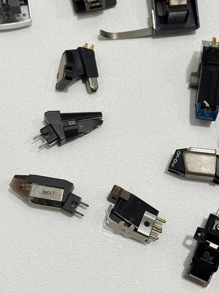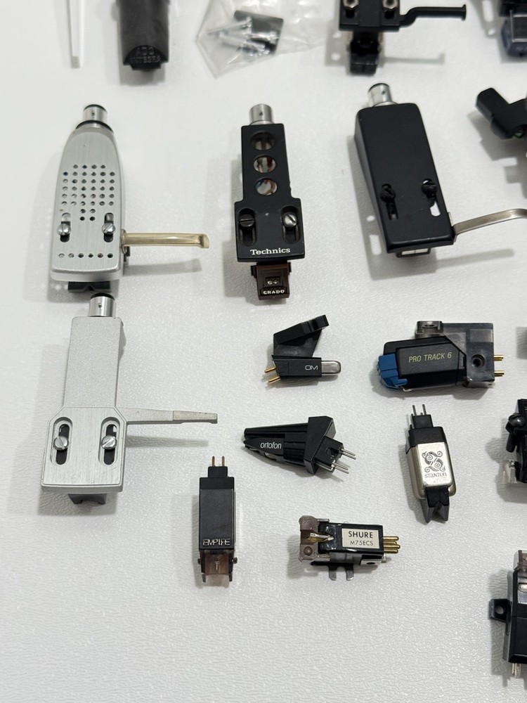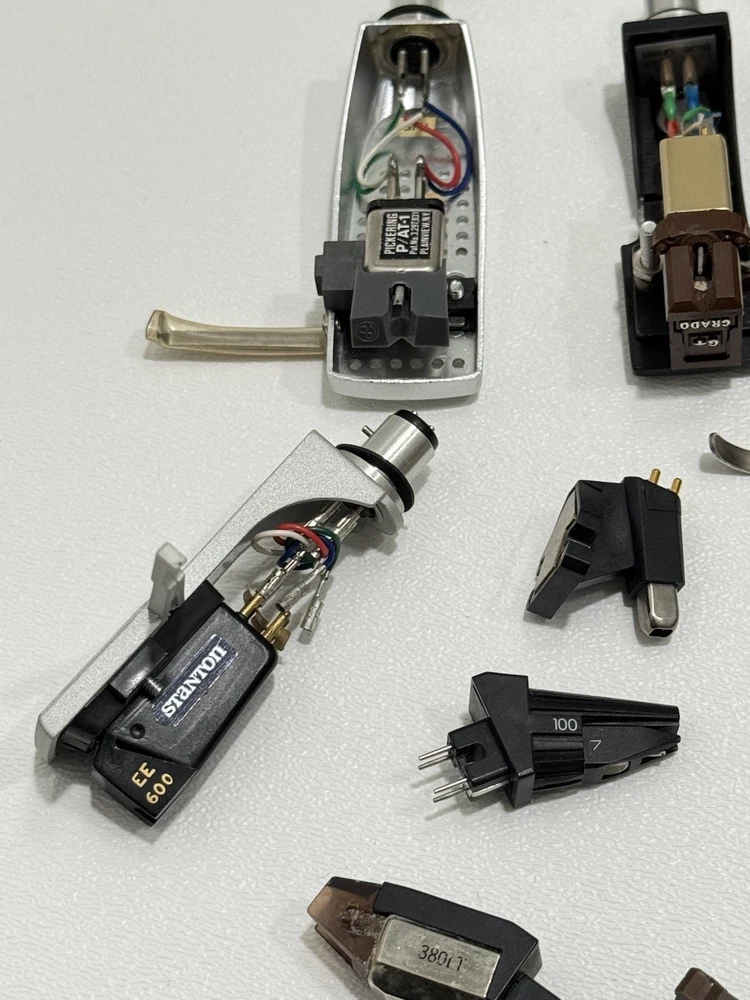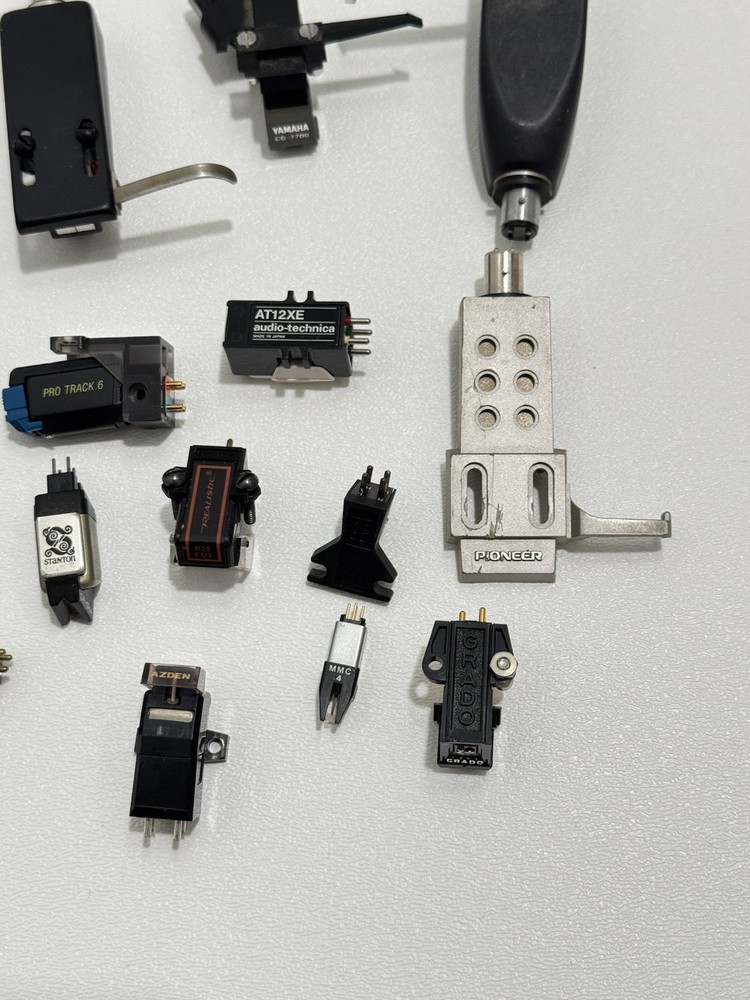 Turntable Cartridges Parts Lot Technics Shure Pioneer Stanton Bang Olufsen MMC 4 That parts are in used condition, and are untested. Everything is being sold as-is. Bang Olufsen MMC4 Pioneer shellhead Pioneer 5MC Yamaha shellhead W/ CG-7700 (broken stylus) Empire 2002 ADC Integra Pickering P/ AT-1 Stanton cartridge W/ EE 600 (broken stylus) Ortofon Digitrac 100 / 7 Audio-Technica At12XE Shure Pro Track 6 Realistic R25 EDT Azden YM 10E Shure M75ECS Stanton D70E Empire 380