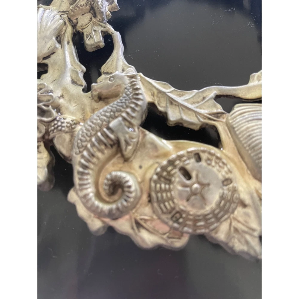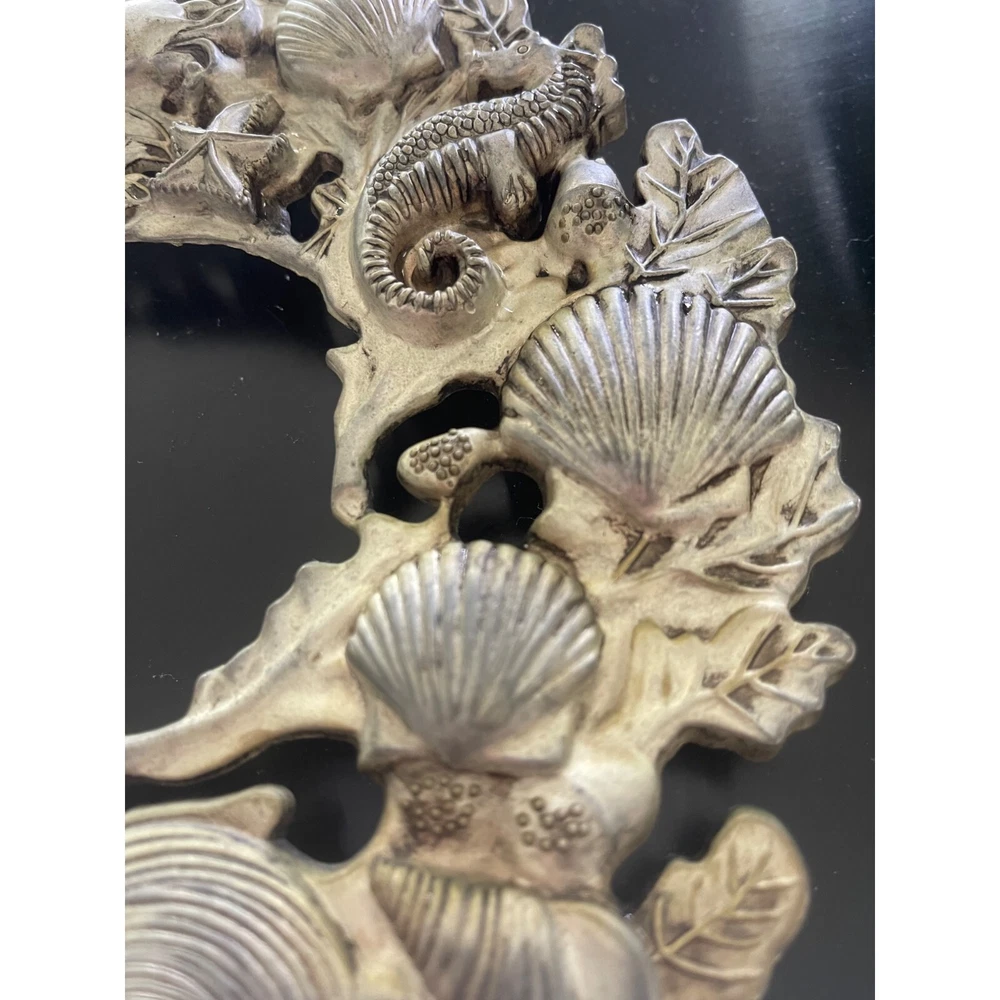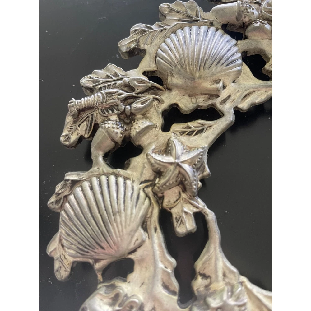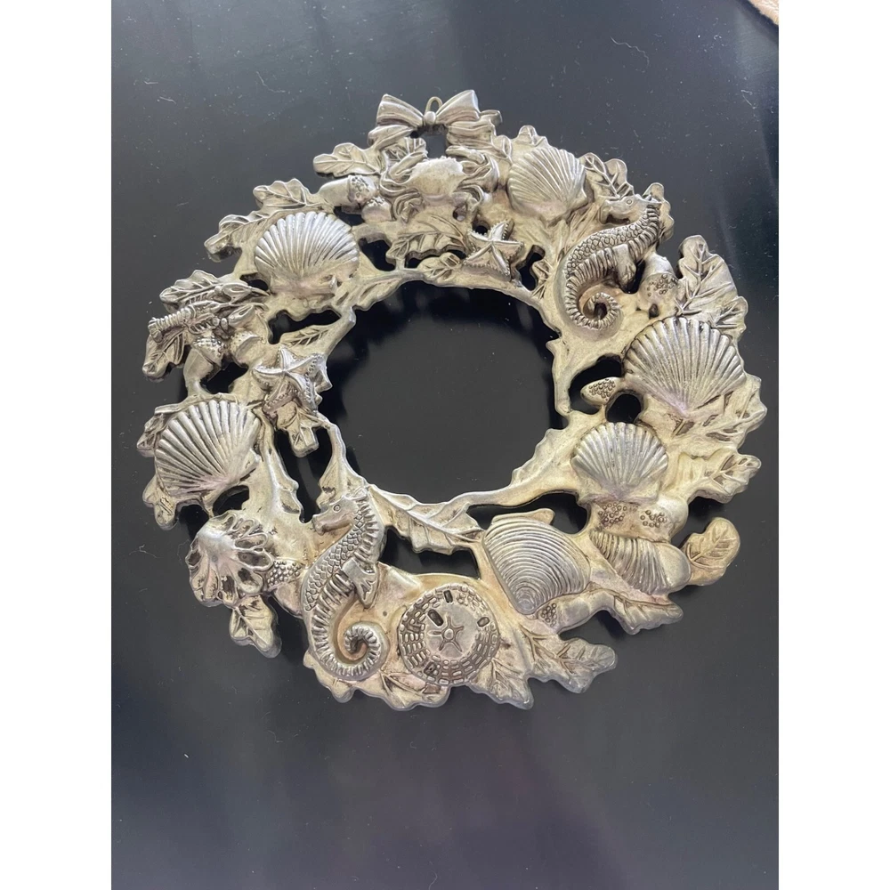 Vintage silver sealife wreath trivet or wall hanger with hanger. This striking trivet is decorated with all types of marine life and complements many varied decors. 9 x 9 1/4 inch Features: • Sea life, trivet, Wall hanger Size: 9 x 9 1/4 inch Condition: Pre-Owned Good Very good condition.