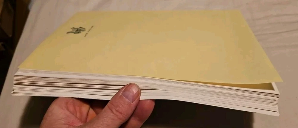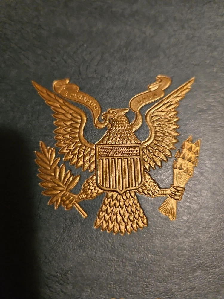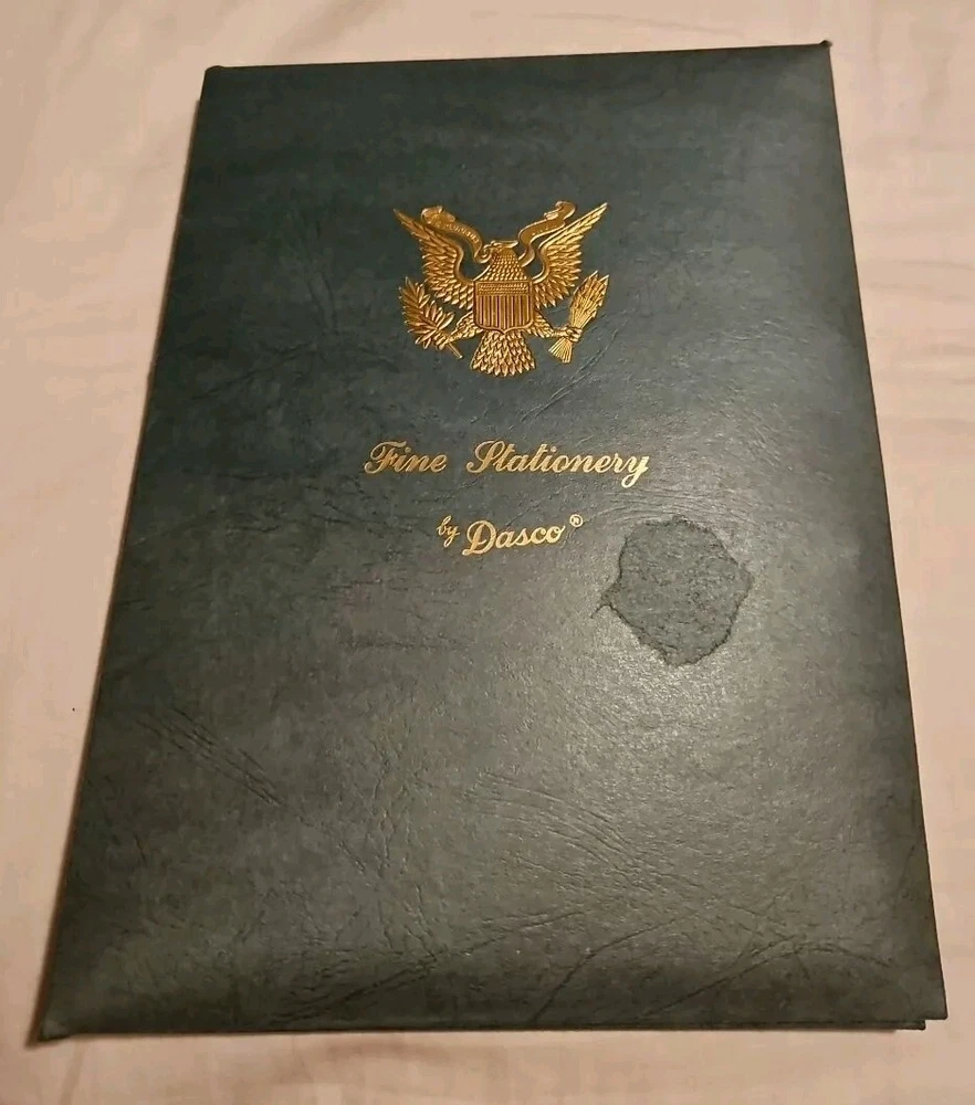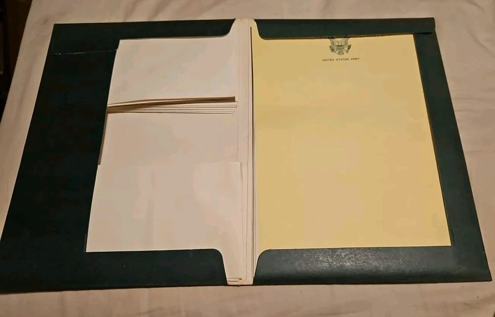 I have several of these, and they are all pretty much in the same condition. Never used. Beautifully embossed US Army gold eagle on the front of the folder. All folders have a dollar coin-sized blemish on the front of the folder (see first picture). The paper has the eagle logo and "United States Army" printed on them. The top paper is yellow, and the others are white. Envelopes are blank. Over the years, most of them got closed due to being exposed to damp air. Free Media Mail shipping in the U.S.
