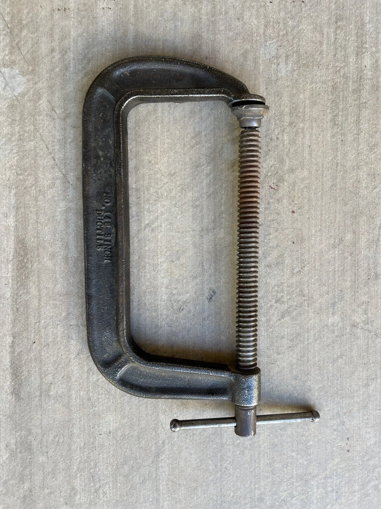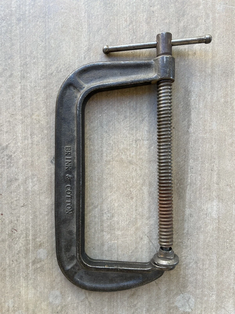 This vintage C-clamp from Brink & Cotton is a must-have for any collector of woodworking tools. The 8" ductile iron clamp is in great shape and has been well-preserved over the years. It's a perfect addition to any tool collection, whether you're a professional woodworker or a hobbyist. The clamp is made in the USA and has the original Brink & Cotton branding. It's a vintage item that has been in use for many years, and it still has plenty of life left in it. This clamp is perfect for holding workpieces securely in place while you're working on them. It's a great find for anyone who's looking for a high-quality, reliable clamp that will stand the test of time.