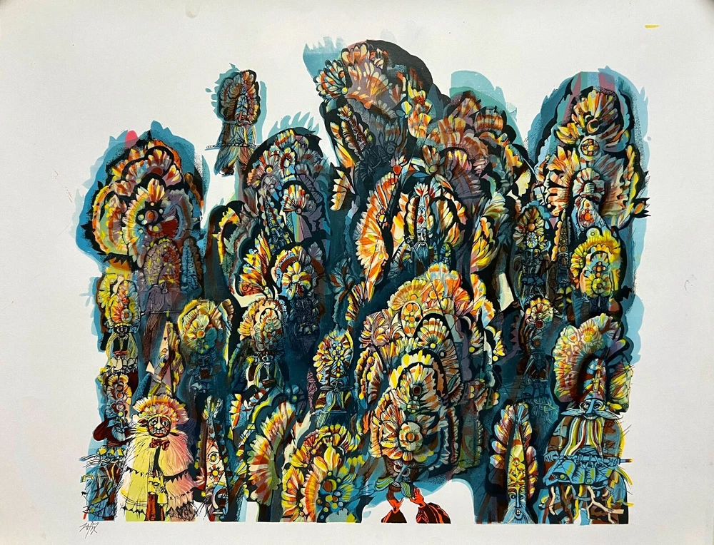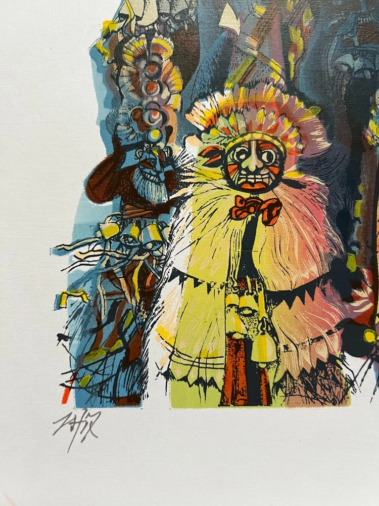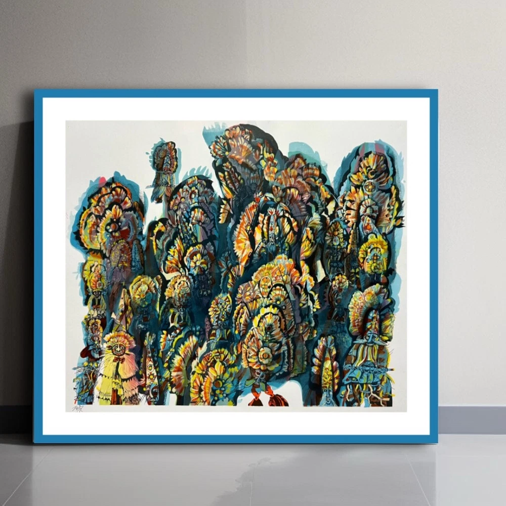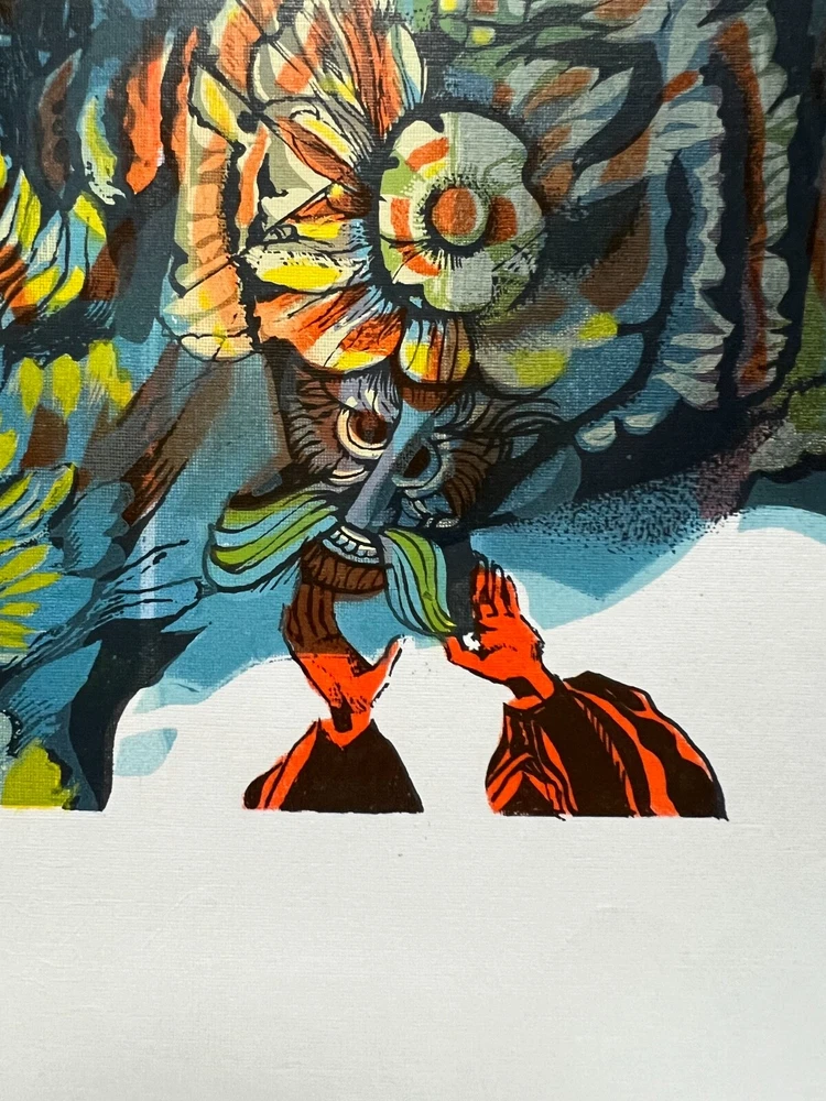 Elevate your space with this exquisite wall art print featuring ethno-inspired motifs in captivating blue and yellow hues. Crafted using the intricate silk-screen printing technique on high-quality paper, this unique piece brings a touch of cultural elegance to your bedroom or living room. Transform your space into a gallery of sophistication with this abstract masterpiece.Immerse yourself in the vibrant world of folklore through this captivating artwork. Executed on paper using the technique of colorful silkscreen print, the piece comes alive with an explosion of vivid hues – from deep blues to radiant yellows and energetic oranges. This masterful creation not only showcases the artist's skill in graphic techniques but also invites viewers to explore the dynamic tradition of Ukrainian art and folklore. AUTHOR: Honord and National Artist of Ukraine Boris Tulin (1938-2015). The title of National Artist of Ukraine's awarded personally by the President of Ukraine. TITLE: Maslenitsa.1990s SIZE: image 56*44,5 cm (22*17,5") paper 64*56,5 cm (25*22") Artwork come in a postal tube and to ensure your item is safe during shipping. Import duties, taxes and charges are not included in the item price or shipping charges. These charges are the buyer´s responsibility. Please check with your country´s customs office to determinate what these additional costs will be prior to bidding/buying. Screen printing, or silkscreen printing, is a printing technique that involves creating a stencil (screen) to apply layers of ink onto a surface. A mesh screen is stretched over a frame, and a stencil is created on the screen. The stencil defines the image or design that will be printed. The screen is coated with a light-sensitive emulsion. When the stencil is exposed to light, the emulsion hardens, creating the stencil on the screen. The screen is placed on the material (such as paper or fabric), and ink is applied to the top of the screen. A squeegee is then used to spread the ink over the stencil, forcing it through the open areas of the screen and onto the material beneath. Multiple layers of ink can be applied by using different stencils or by allowing each layer to dry before applying the next one. After the printing is done, the material is typically heated or allowed to air-dry to cure and set the ink.