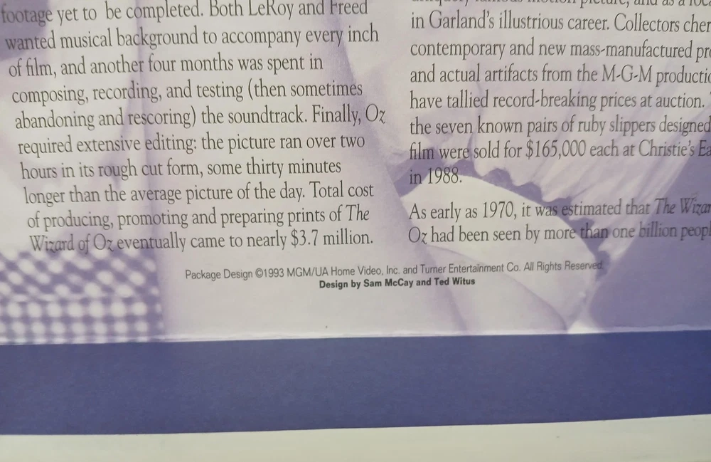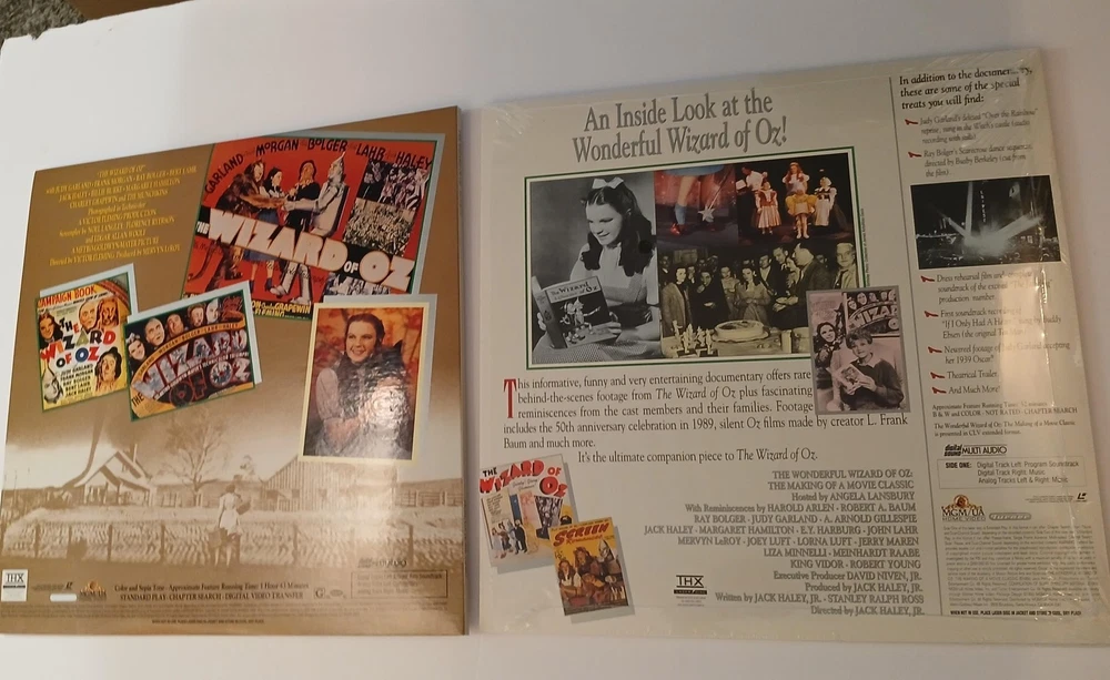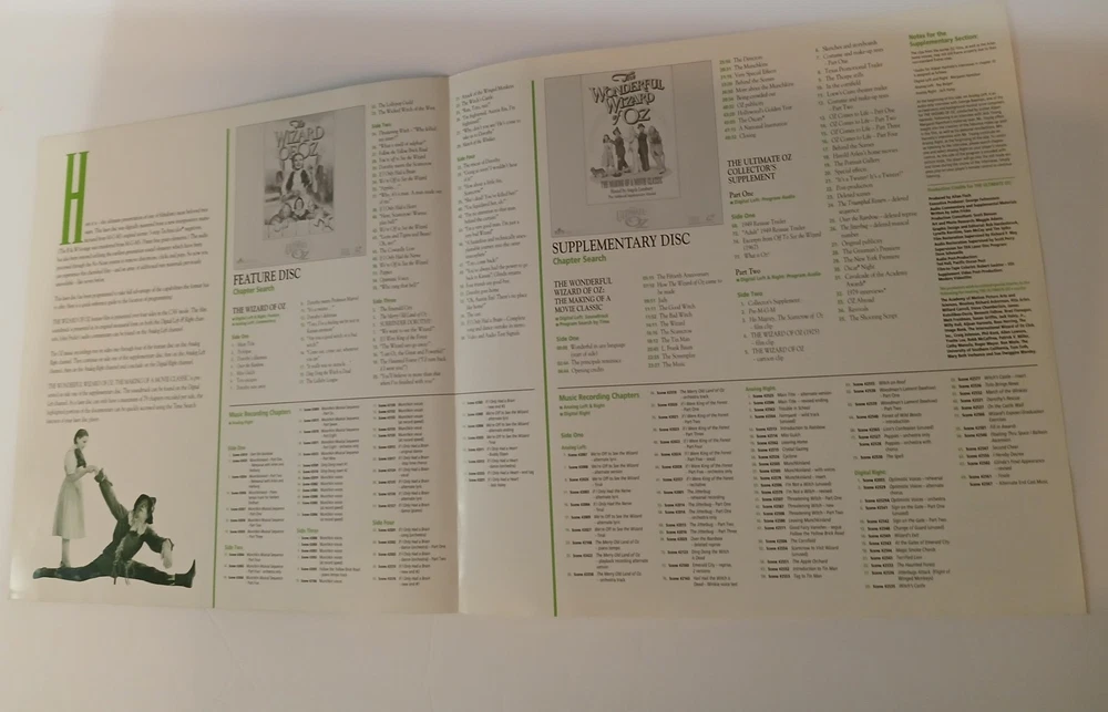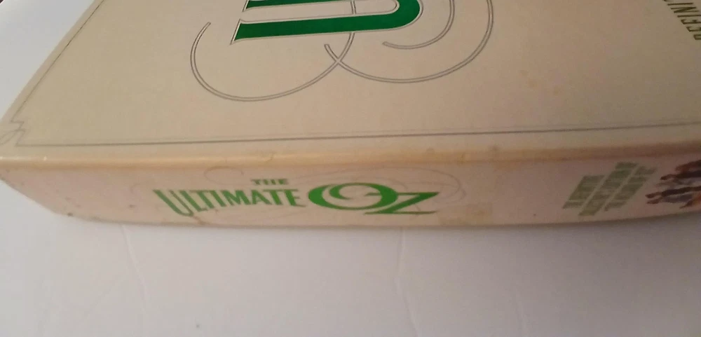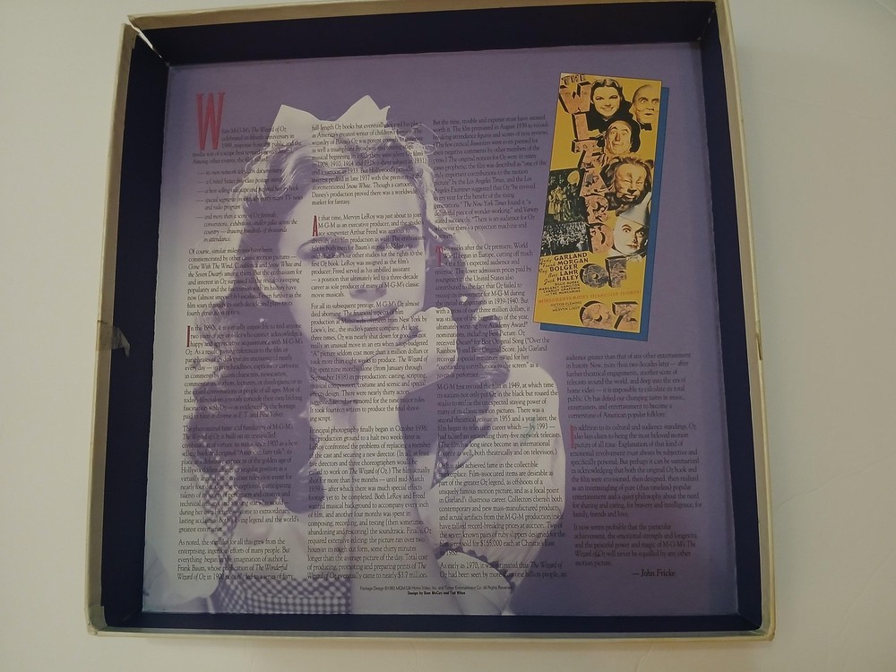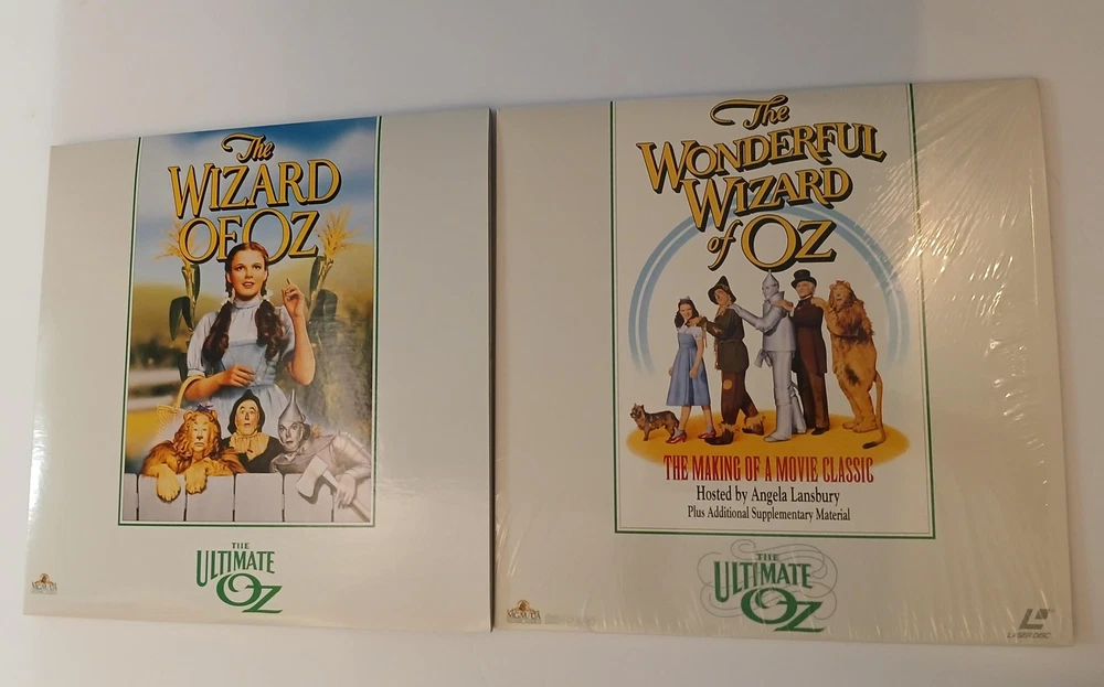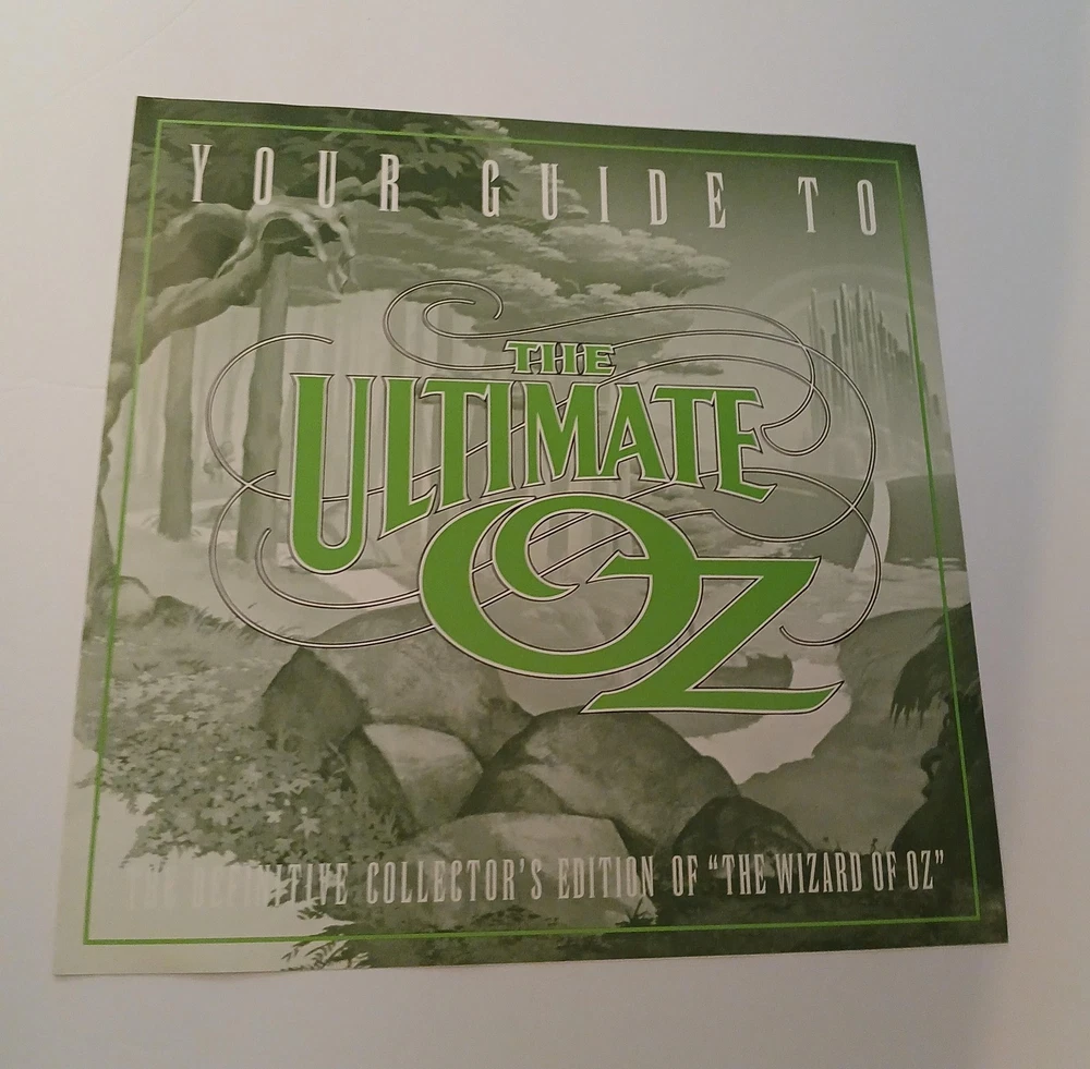Brand: MGM/UA Home Video and Turner Entertainment Co. Title: The Ultimate Oz – The Definitive Collector's Edition of 'The Wizard of Oz' on LaserDisc. Year of release: 1993 (package design ©1993 MGM/UA Home Video, Inc. and Turner Entertainment Co.). Format: NTSC LaserDisc collector's box set featuring the classic film 'The Wizard of Oz,' the documentary 'The Wonderful Wizard of Oz: The Making of a Movie Classic' hosted by Angela Lansbury, and additional Ultimate Oz supplementary material. Contents: Large illustrated outer storage box with inner Dorothy/Judy Garland artwork tray; two full-size LaserDisc jackets for the feature and making-of documentary (some factory shrink wrap still present as shown); multiple MGM/UA LaserDisc sleeves housing supplementary discs; a large hardcover Wizard of Oz photo and history book; 'Your Guide to The Ultimate Oz' fold-out program listing chapters and bonus features; a green softcover reproduction continuity script dated March 15, 1939, printed in U.S.A.; and a group of black-and-white still photographs from the production. Special features (per packaging and guide): behind-the-scenes documentary, archival interviews and reminiscences from cast and crew, music recording session audio, deleted and alternate material, silent Oz films, trailers, newsreel footage, and other historical supplements celebrating the 1939 film. Genre: Classic fantasy musical film home video and memorabilia; ideal for Wizard of Oz, MGM musical, classic Hollywood, and LaserDisc collectors. Notes: Discs are visually protected in sleeves see all photos for included pieces and packaging condition.