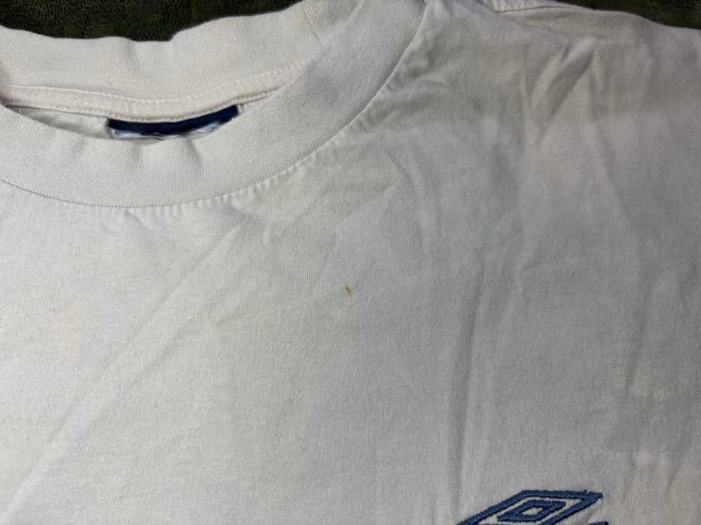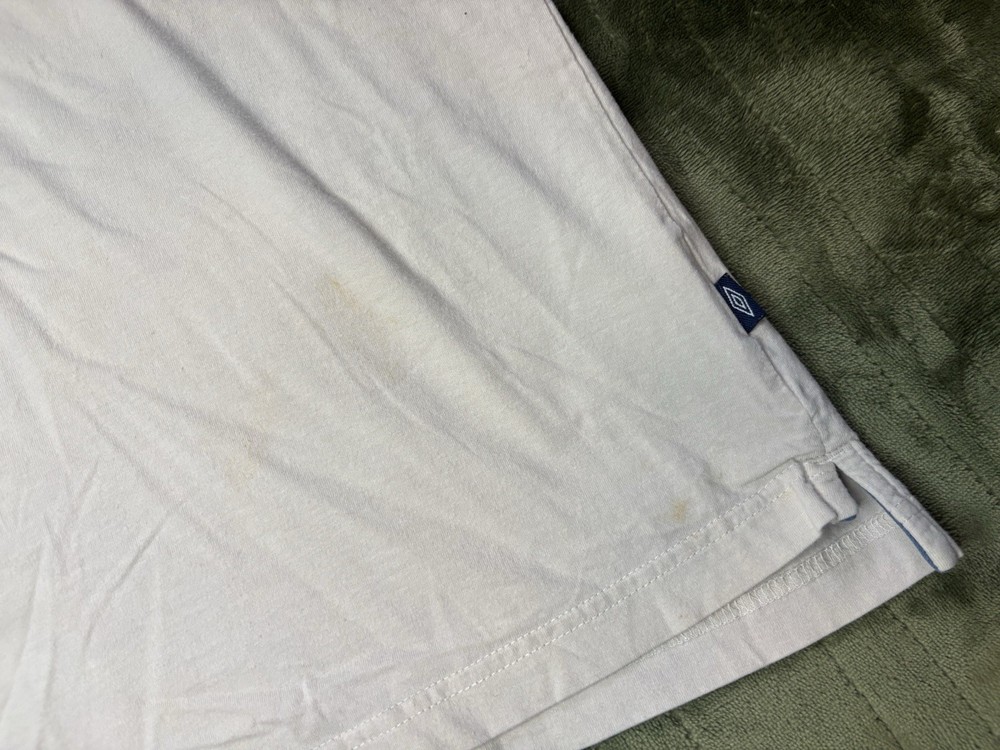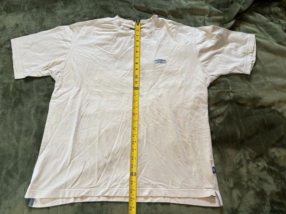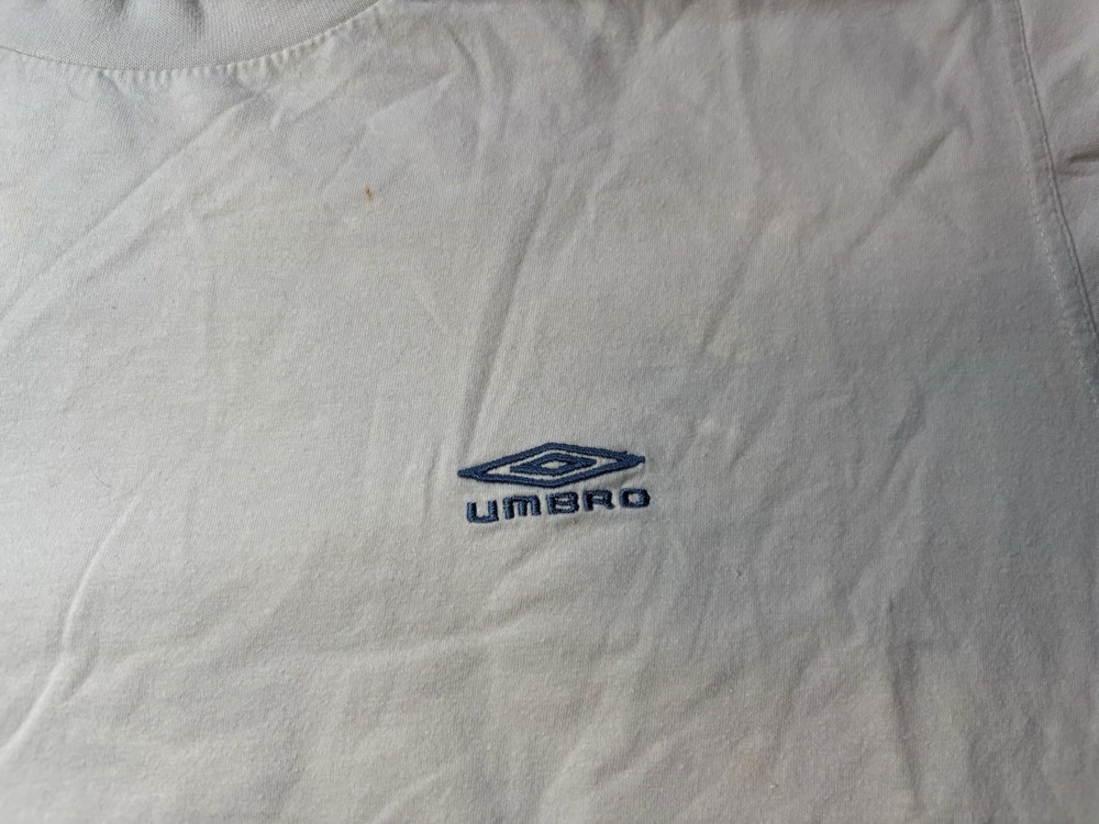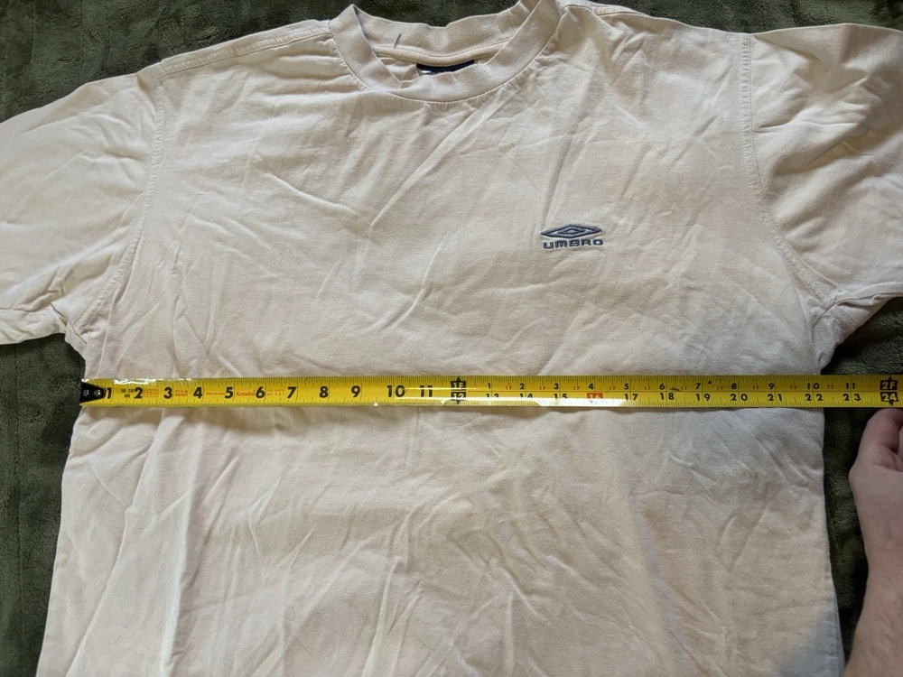 The Vintage Umbro Soccer Shirt for Men in size Large is a classic ivory cream tee with an embroidered logo, perfect for fans of 90s sports fashion. Made between 1990-1999, this short sleeve shirt features a crew neck and regular fit, making it comfortable for all seasons. The shirt is machine washable and has a solid pattern, representing a piece of nostalgia from the USA's sports heritage in the 90s. There are a few small stains on the shirt.