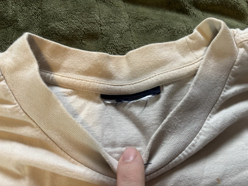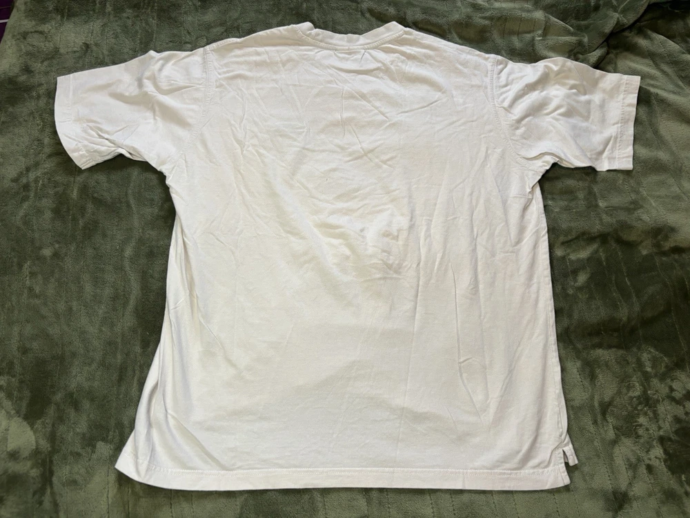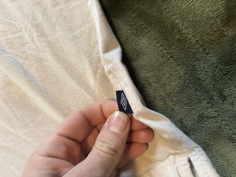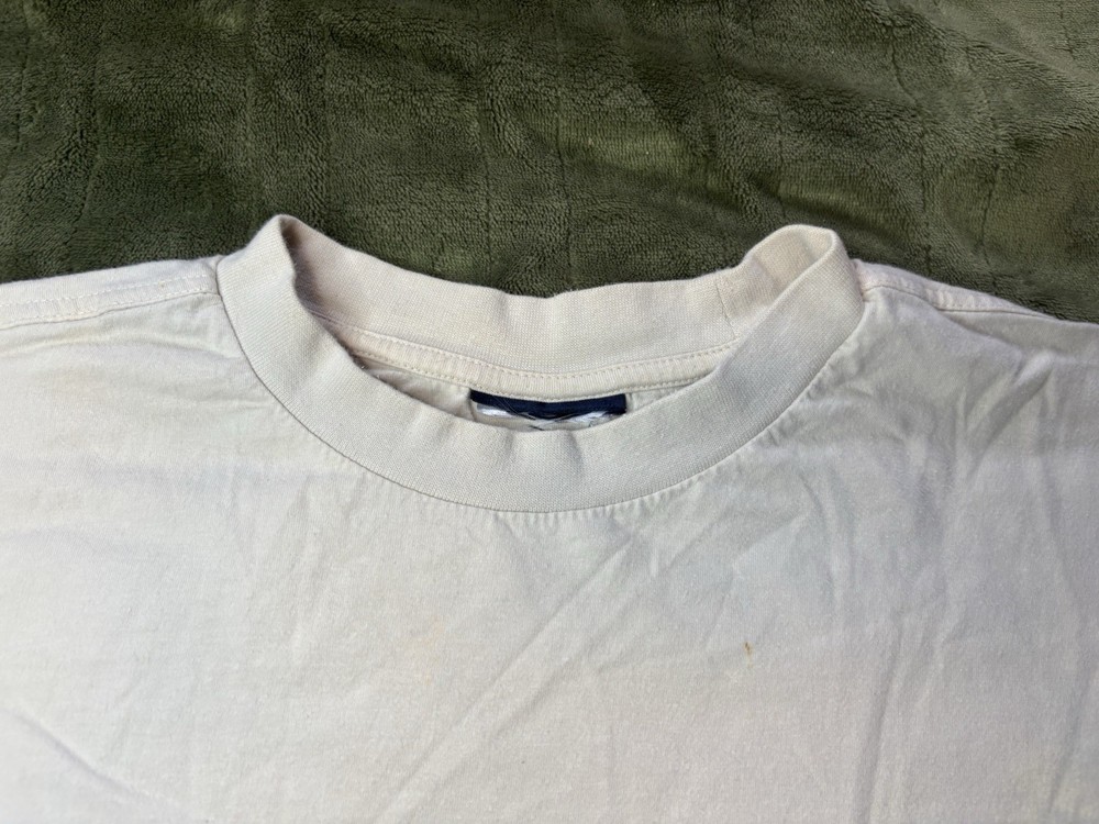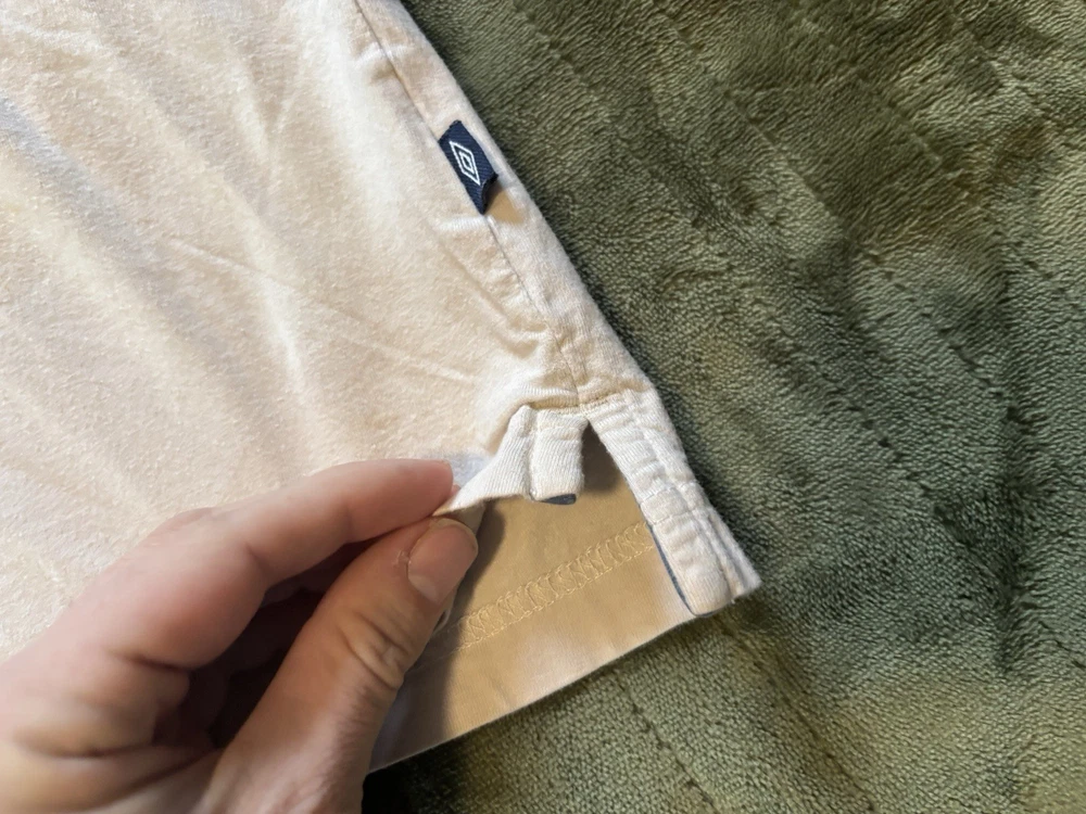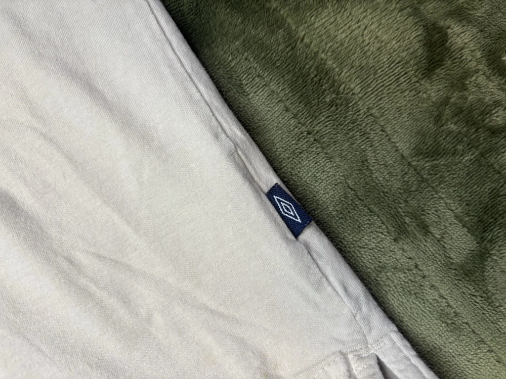 The Vintage Umbro Soccer Shirt for Men in size Large is a classic ivory cream tee with an embroidered logo, perfect for fans of 90s sports fashion. Made between 1990-1999, this short sleeve shirt features a crew neck and regular fit, making it comfortable for all seasons. The shirt is machine washable and has a solid pattern, representing a piece of nostalgia from the USA's sports heritage in the 90s. There are a few small stains on the shirt.