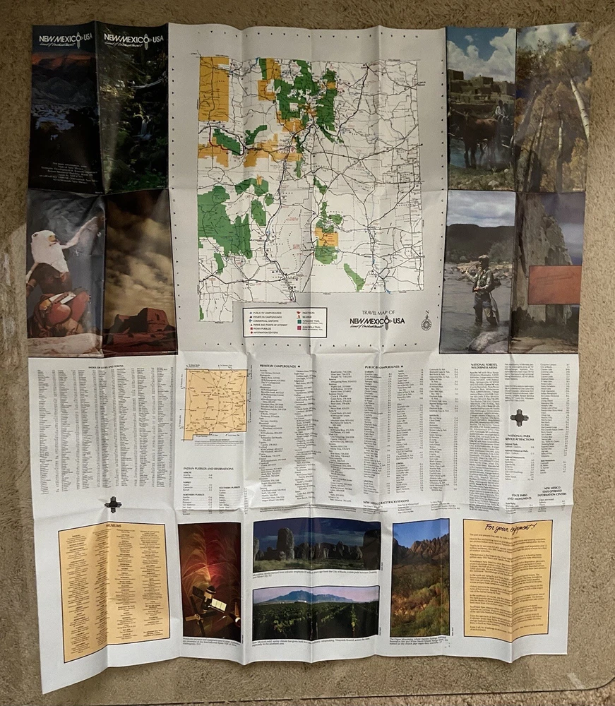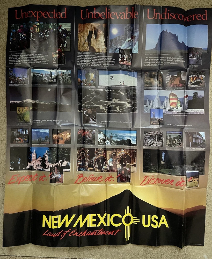 Vintage undated New Mexico Travel Map Pictorial Tourism Poster Foldout Excellent 👀!. One owner original from my personal collection and stored safely for decades since acquiring during travels in early 2000’s. Map is Most likely from the 1990’s. Excellent condition, colors, corners and edges. Folds are clean and crisp. Rarely used or unfolded. See pics and ask any questions. No smoke or water damage. Shipped USPS First Class or Priority mail your choice. Thanks!