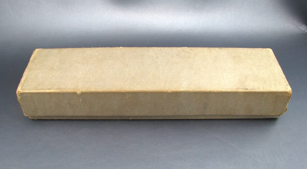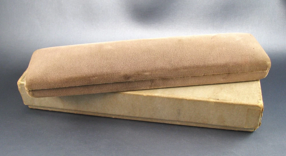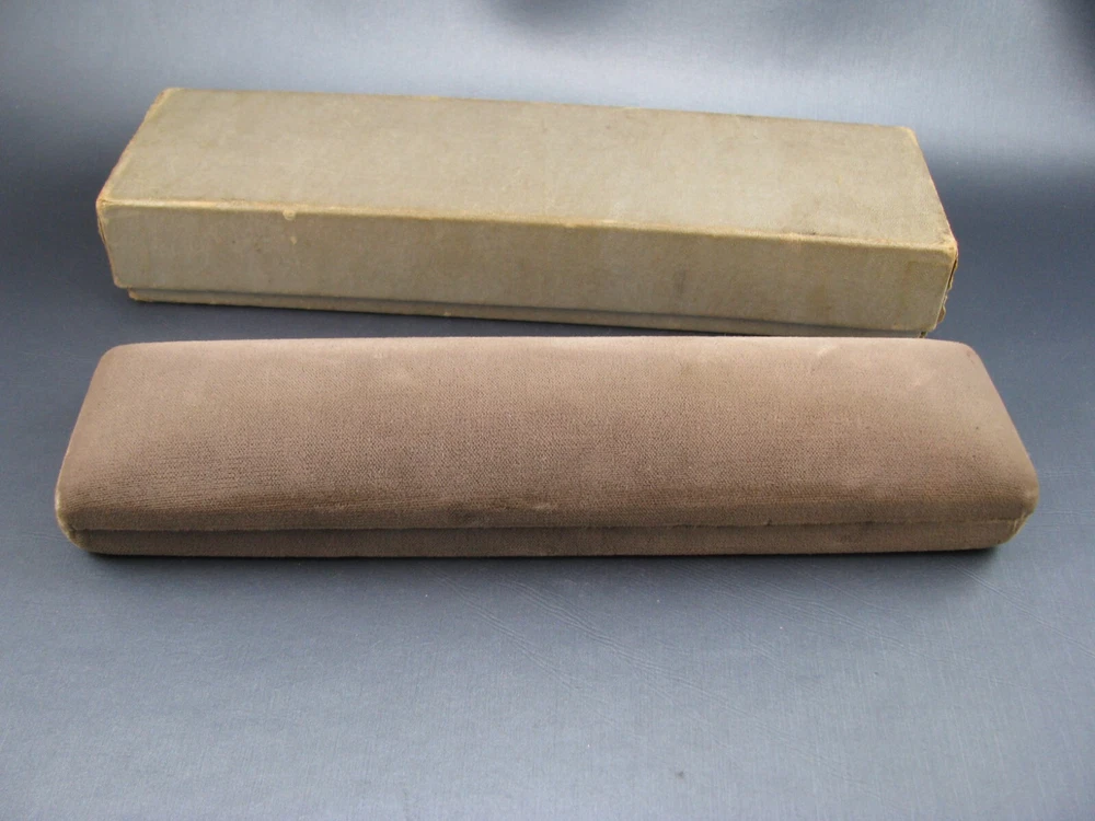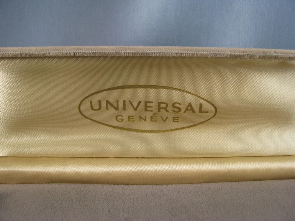 This is a very nice box and presentation case, probably for a lady's watch, made for Universal Geneve. I estimate this dates to circa 1960. The outer box is not marked as to maker but it was with this box from the estate from which it was purchased the case fits it perfectly. The velvet presentation case measures about 8 x 2 x 1 1/4 inches. This is in very good condition. The outer box has minor storage wear.