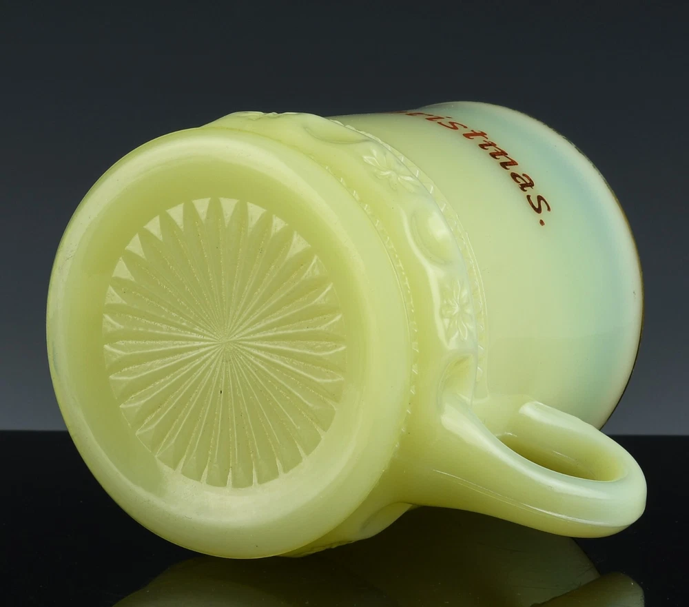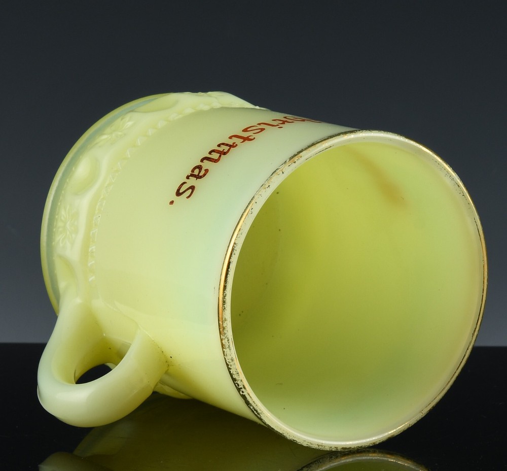Note To all Buyers. Shipping is usually done within 1 Full Business Day Of Payment. All shipping is provided a tracking number, and regardless of location arrives usually between 2-7 Business days, please ignore the estimated time Ebay displays for you. DESCRIPTION : Here we are offering Uranium glass mug, up for sale and your consideration. Made from fine Vaseline glass containing traces of Uranium, which makes the piece admit a bright Zombie green like glow when under the effects of a UV Black Light. This piece is in the very collectible custard glass and has such a strong glow. The merry Christmas is in a fine gold and the embossed base is eye catching. Very cool, perfect for a nice Collection or would make the most outstanding gift to someone dear to you! The last photo is a small sample of the Uranium glass we have to offer, please check out our Page, and save greatly with combined shipping! CONDITION : In Vintage Estate Fresh condition, with no chips, cracks, or repairs. Only some minor scuffs and wear consistent with age. MEASUREMENTS : The Mug measures approx. 3-1/4 inches tall by 2-1/2 inches wide across the top. SHIPPING : We offer combined shipping on orders, therefor the more you order the cheaper the shipping!! We also offer Worldwide Shipping on the vast majority of our stock, please contact us to arrange your worldwide and specific shipping needs!