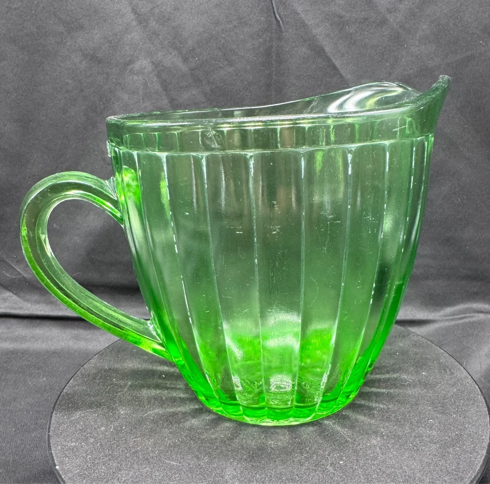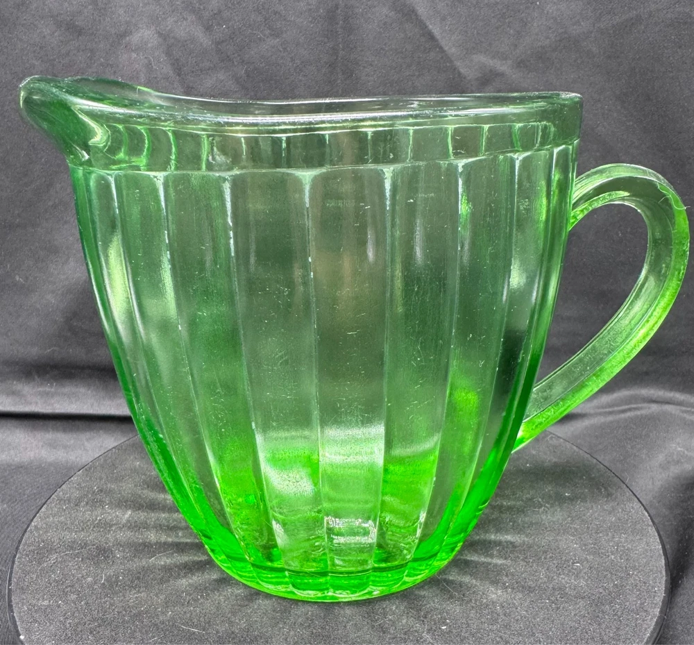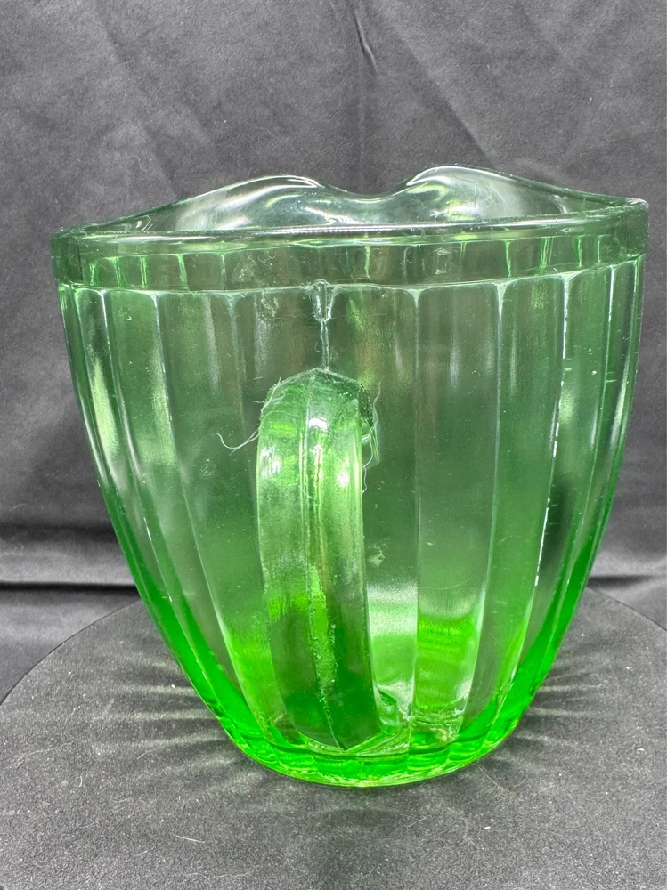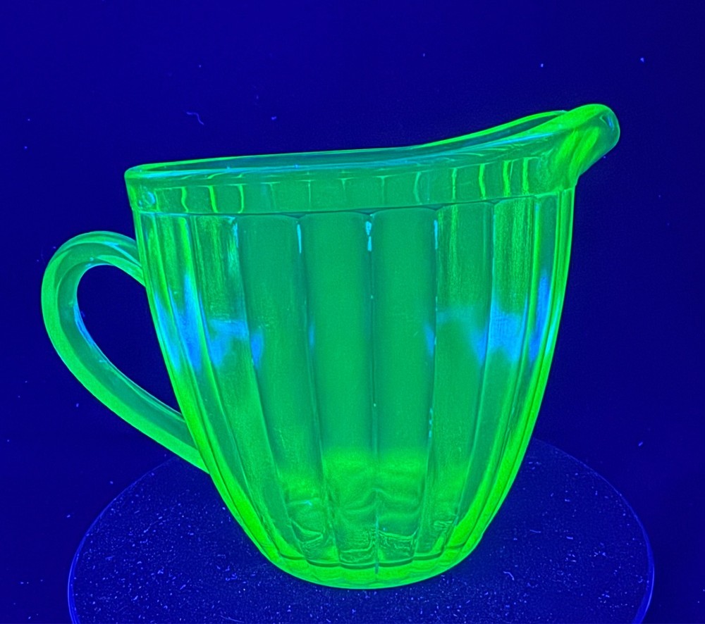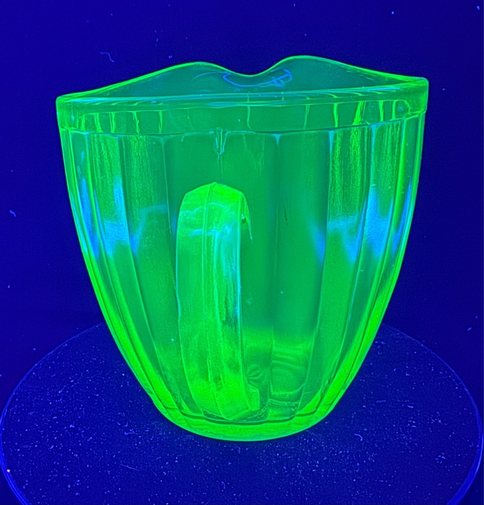 Vintage Green Uranium Glass Short Ribbed Water Pitcher This glows ghostly green under 395 wavelength black lights. This is due to the Uranium Oxide used in the manufacturing of the glass.