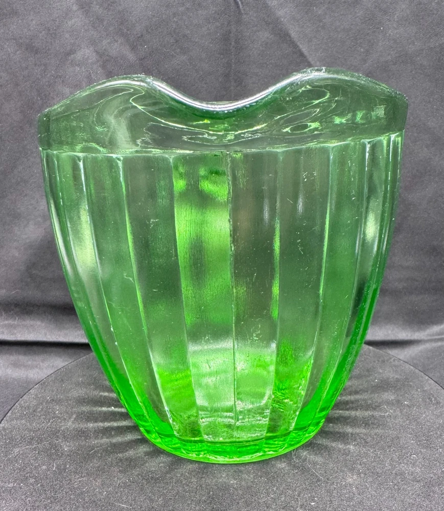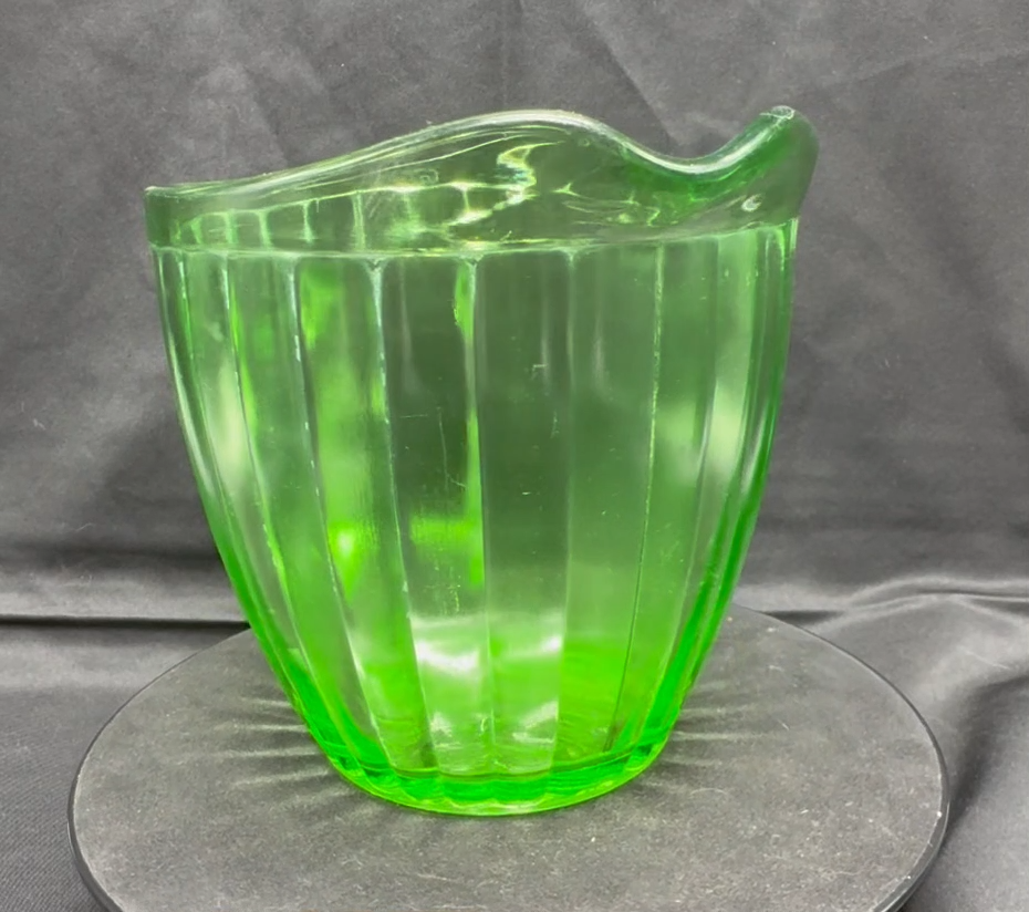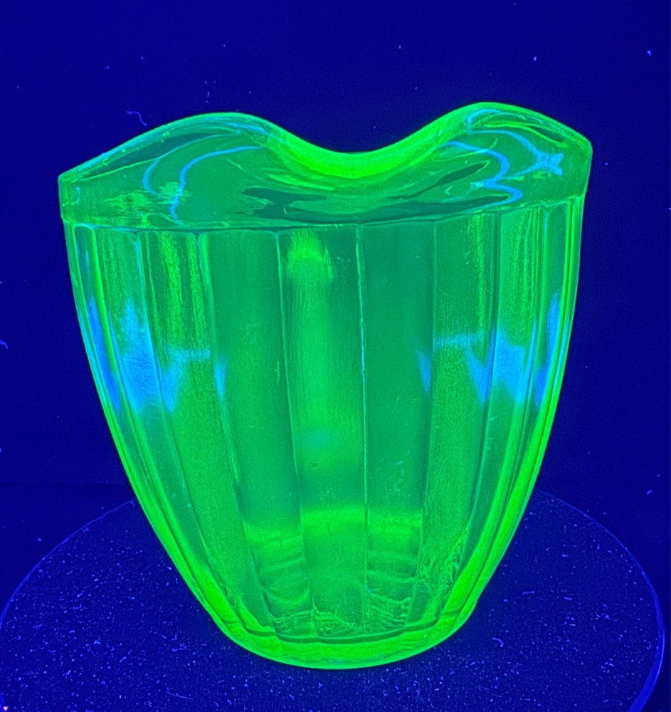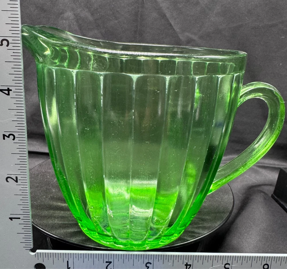 Vintage Green Uranium Glass Short Ribbed Water Pitcher This glows ghostly green under 395 wavelength black lights. This is due to the Uranium Oxide used in the manufacturing of the glass.