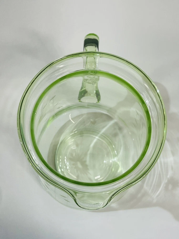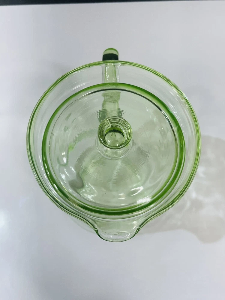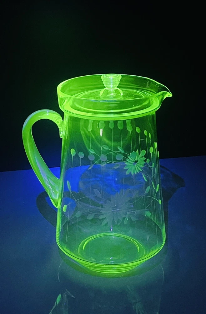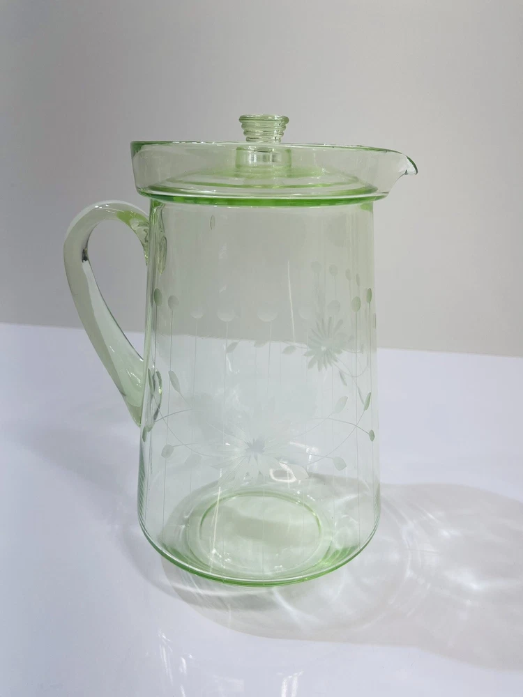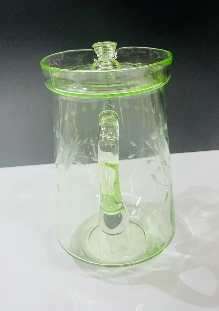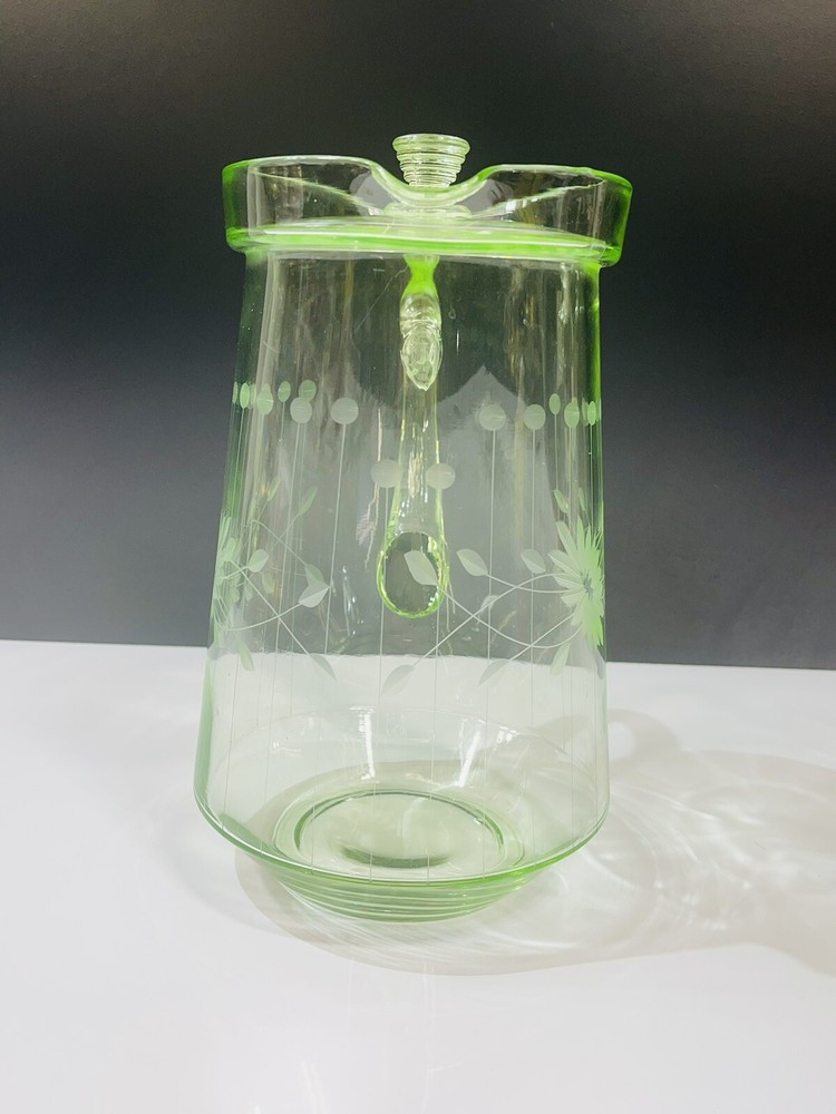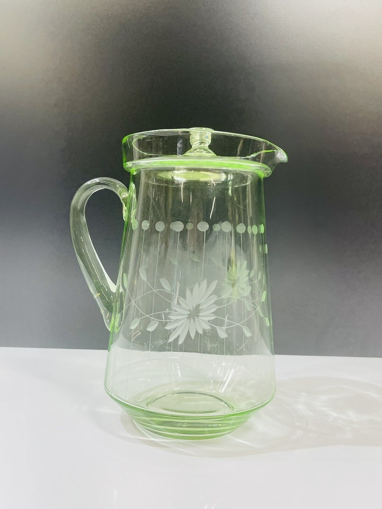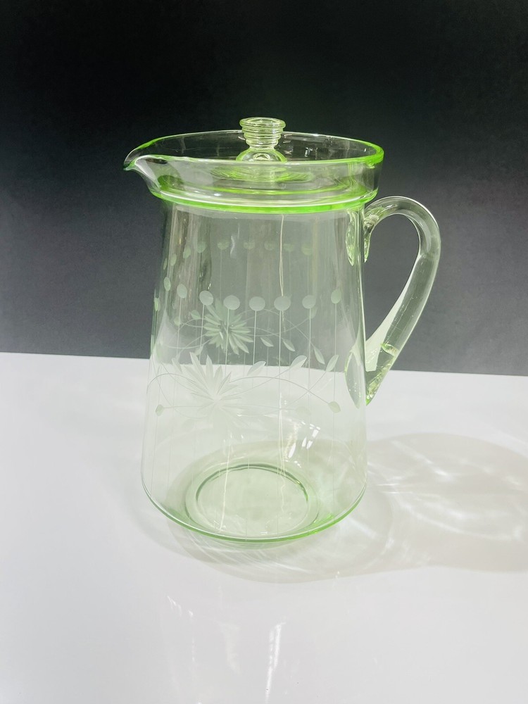 Vintage Uranium Vaseline Glass Etched Floral Lidded Water Pitcher, The pitcher is in great condition, it measures 10'' high with a base diameter of 6'' around, it measure 7 3/4'' from spout to handle. The lid does have a couple flea bites on the inside beveled rim.