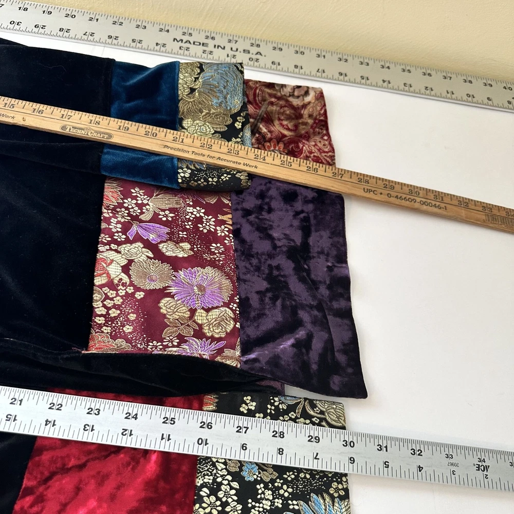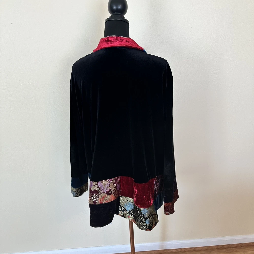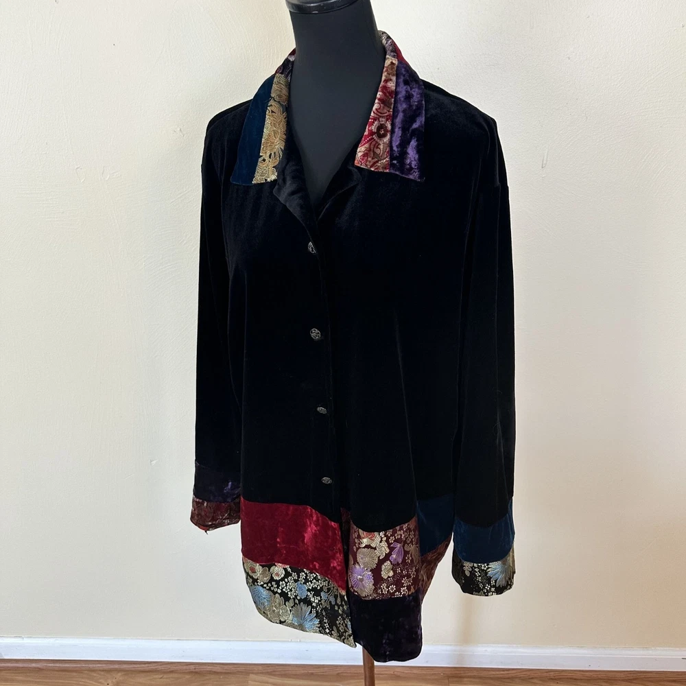 Soft velvet jacket, perfect for a unique and stylish look. Features intricate patchwork design with vibrant colors. • Button-up closure • Velvet material • Patchwork design • Long sleeves • Collar detail Minor discoloration on sleeves. Top to bottom = 31 inches