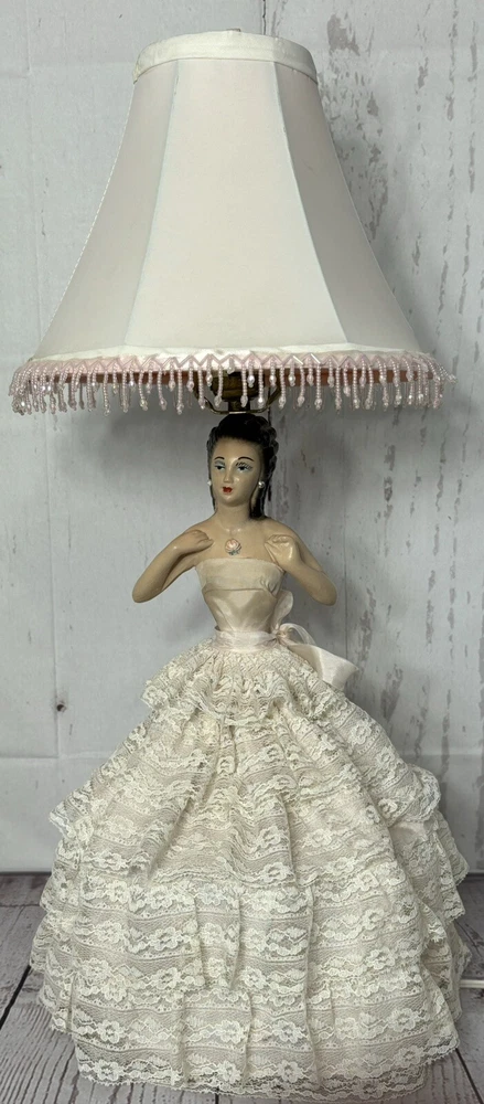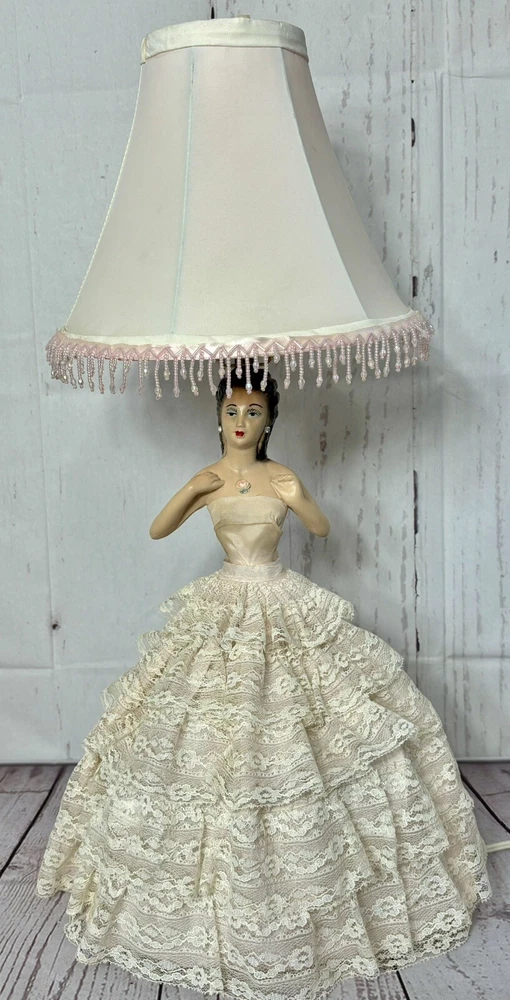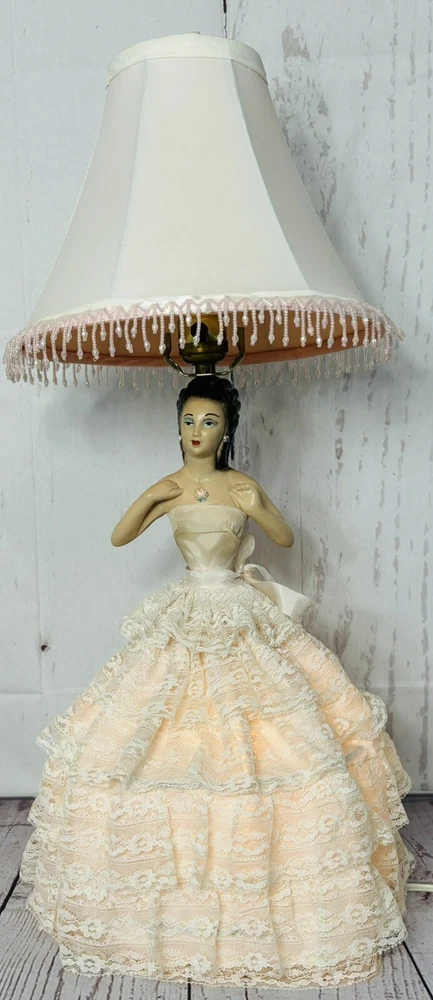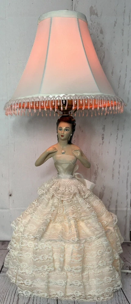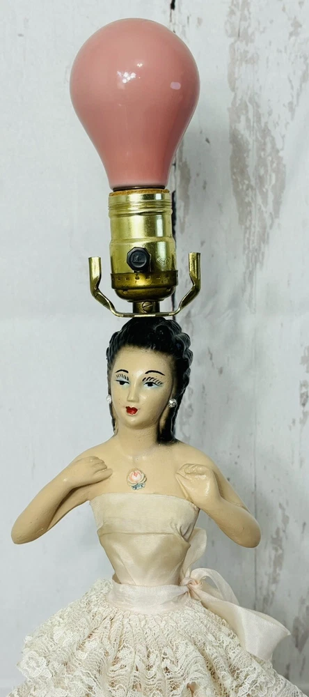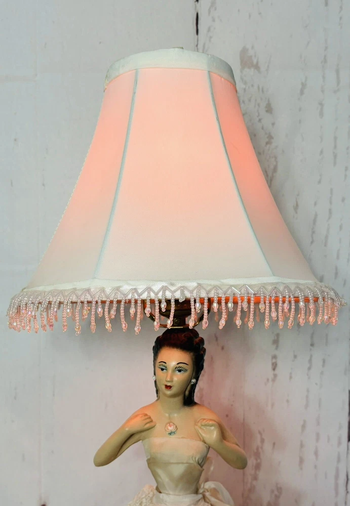 Ladies dress has a few spots of discoloration, but in great condition for its age. Lamp shade is not the original shade. PLEASE READ: Pink light bulb will be sent with the lamp, but is not guaranteed that it will function when it arrives. Old filaments are very fragile and can break easily during shipping. Add a touch of vintage charm to your home decor with this beautiful CHALKWARE BOUDOIR LADY LAMP. This lamp features a pink color and a shaded design that will complement any room. The lamp is corded and has a knob control style, making it easy to use. This original lamp was manufactured in the 1940s and has a height of 23 inches with the lamp shade included. The lamp is made of chalkware material and has a pink color. It is a perfect addition for teens, unisex adults, and girls. The lamp's sensor type is light and it is a vintage piece from the 1940s. This lamp is a must-have for collectors and enthusiasts alike.
