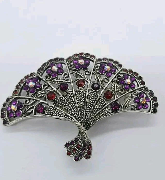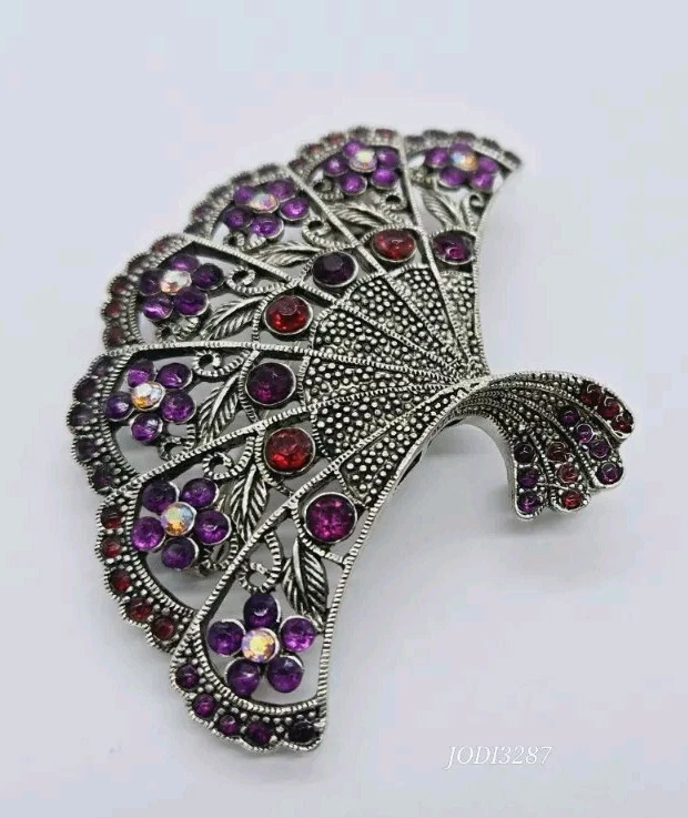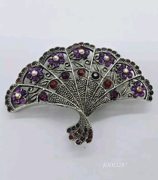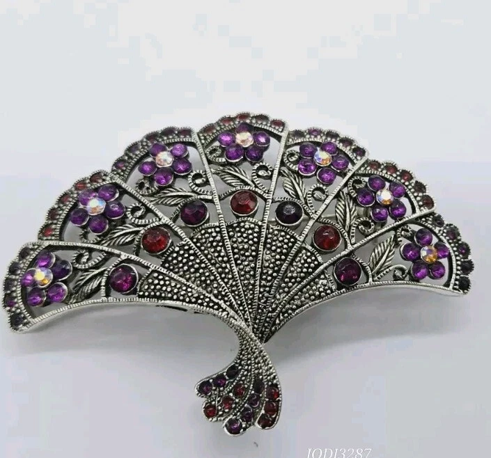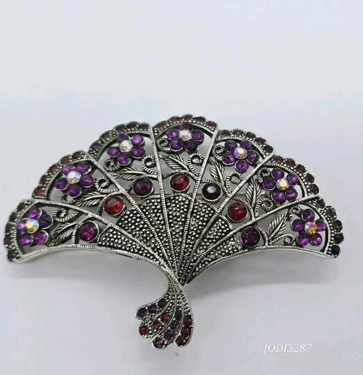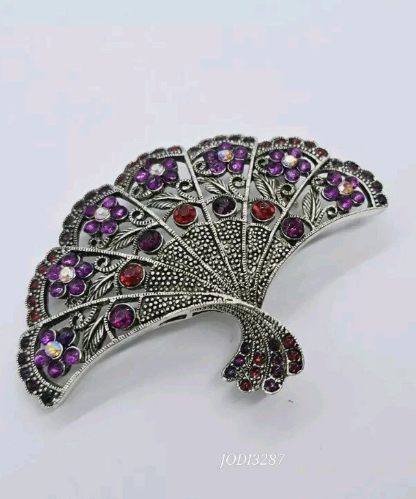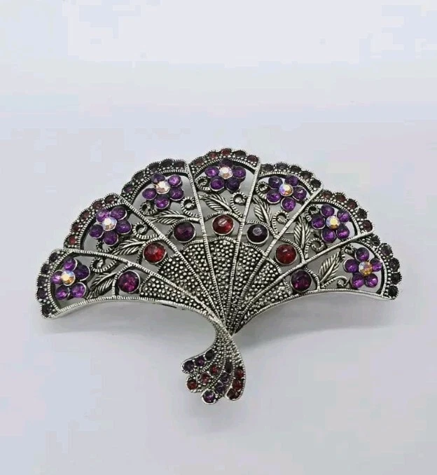 Vintage Victorian FAN Brooch Pendant Silver tone Flowers Purple Red Crystals