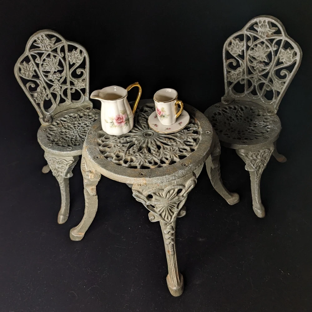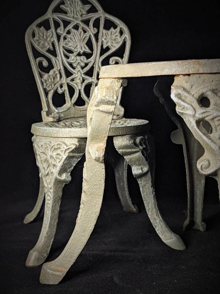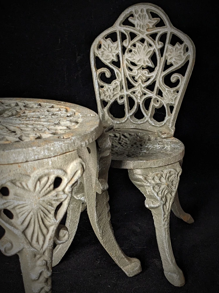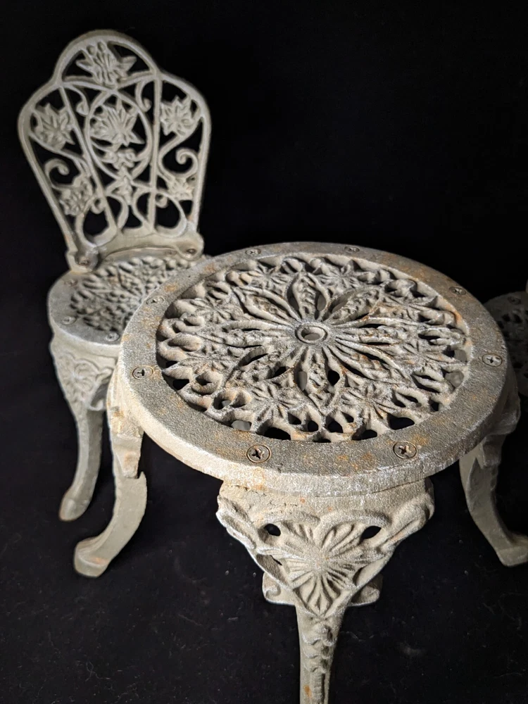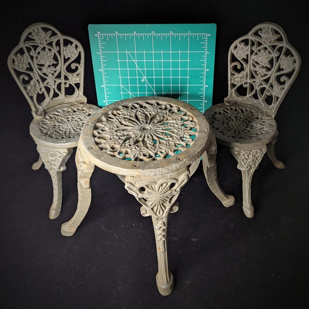 Vintage Victorian style cast-iron garden furniture set for dolls This lovely, early, very well-made, cast iron doll table and two chairs have matching detailed legs with lovely cut-out detail on the chairs. The table stands 16cm high, with a top diameter of 16cm (24cm with feet, at its widest), the chairs stand 23cm high, with a seat diameter of 10,5cm (17,5cm with feet, at its widest), and together weigh a 3,150kg.