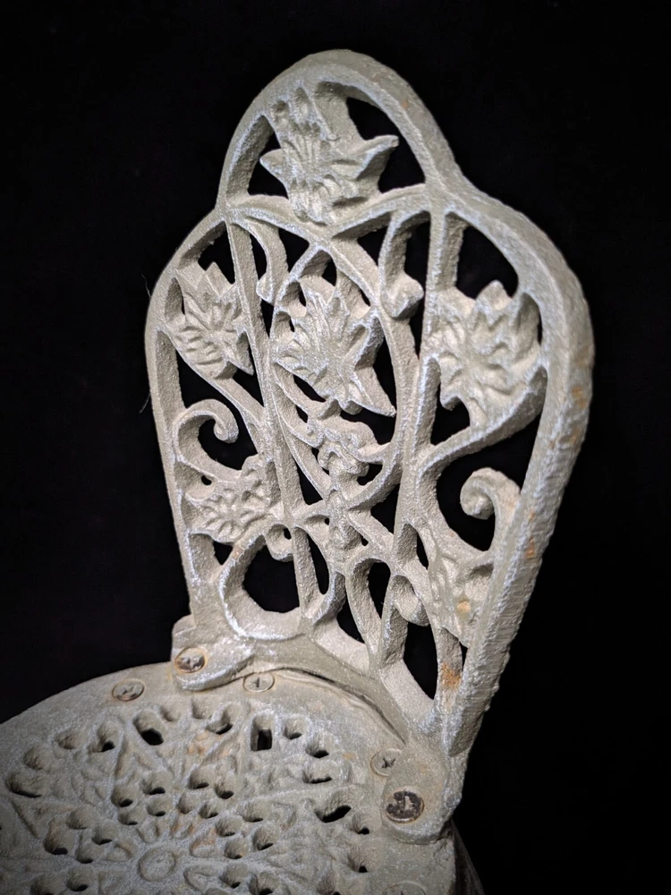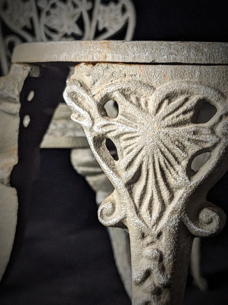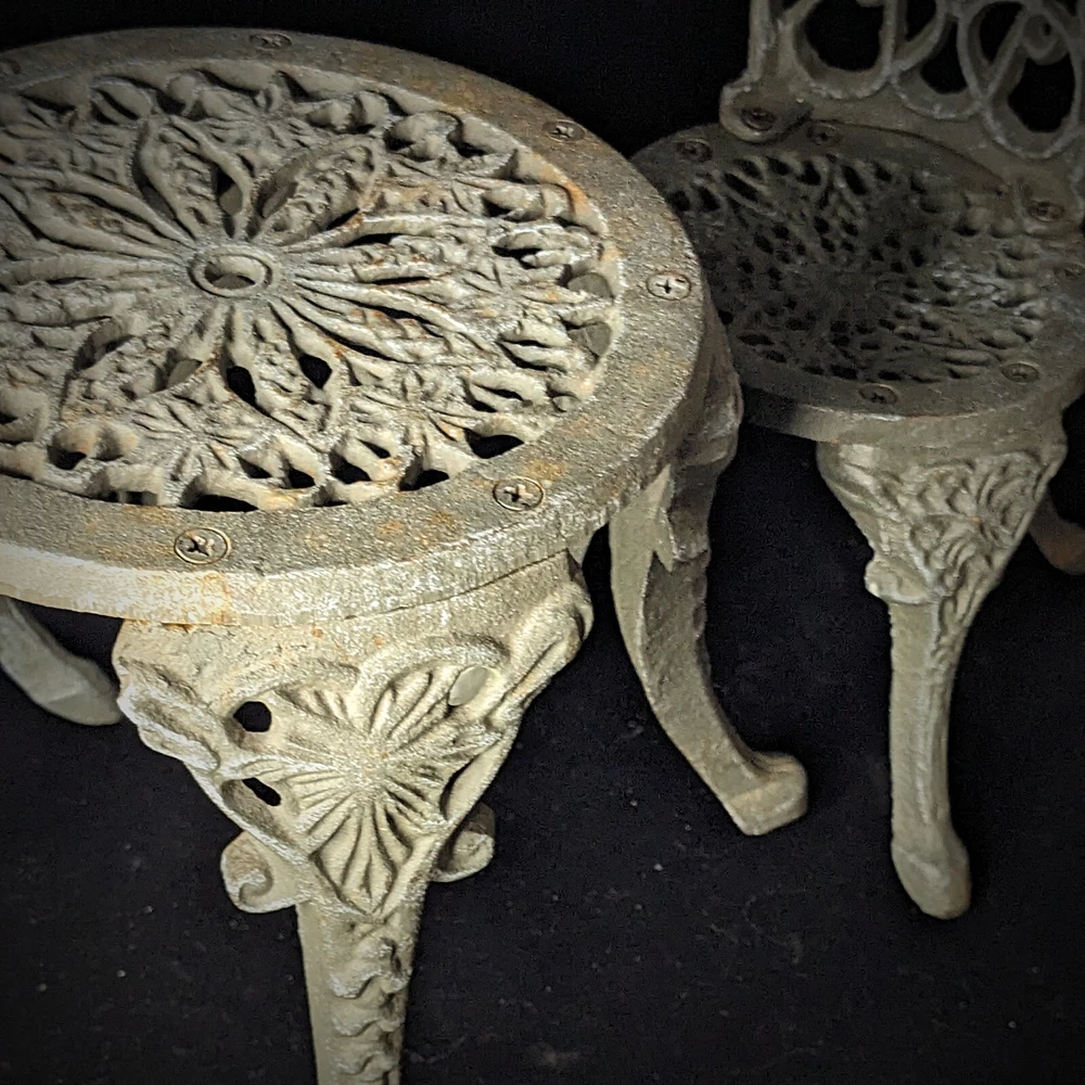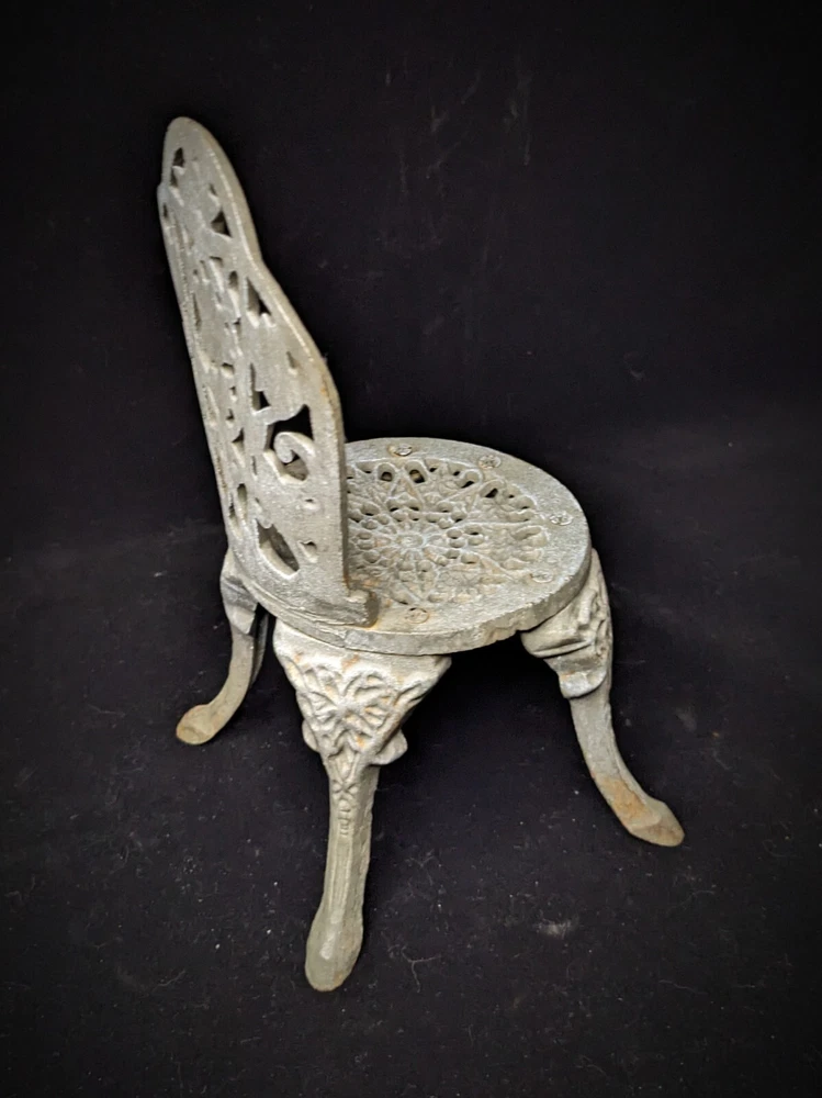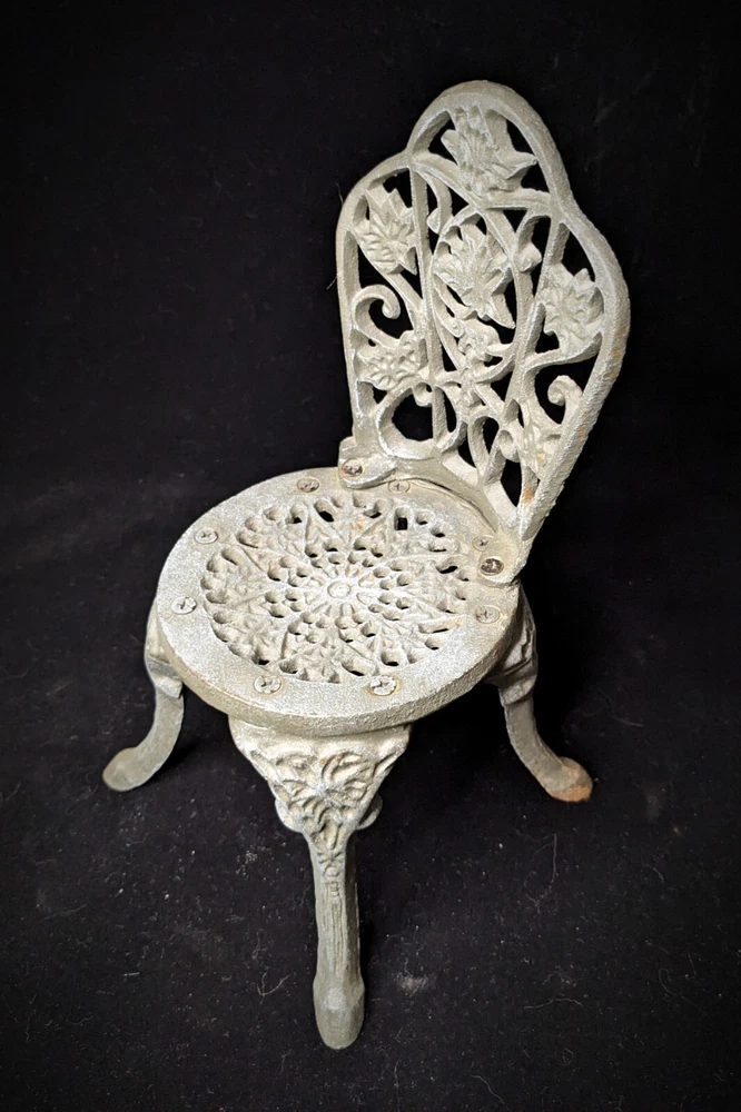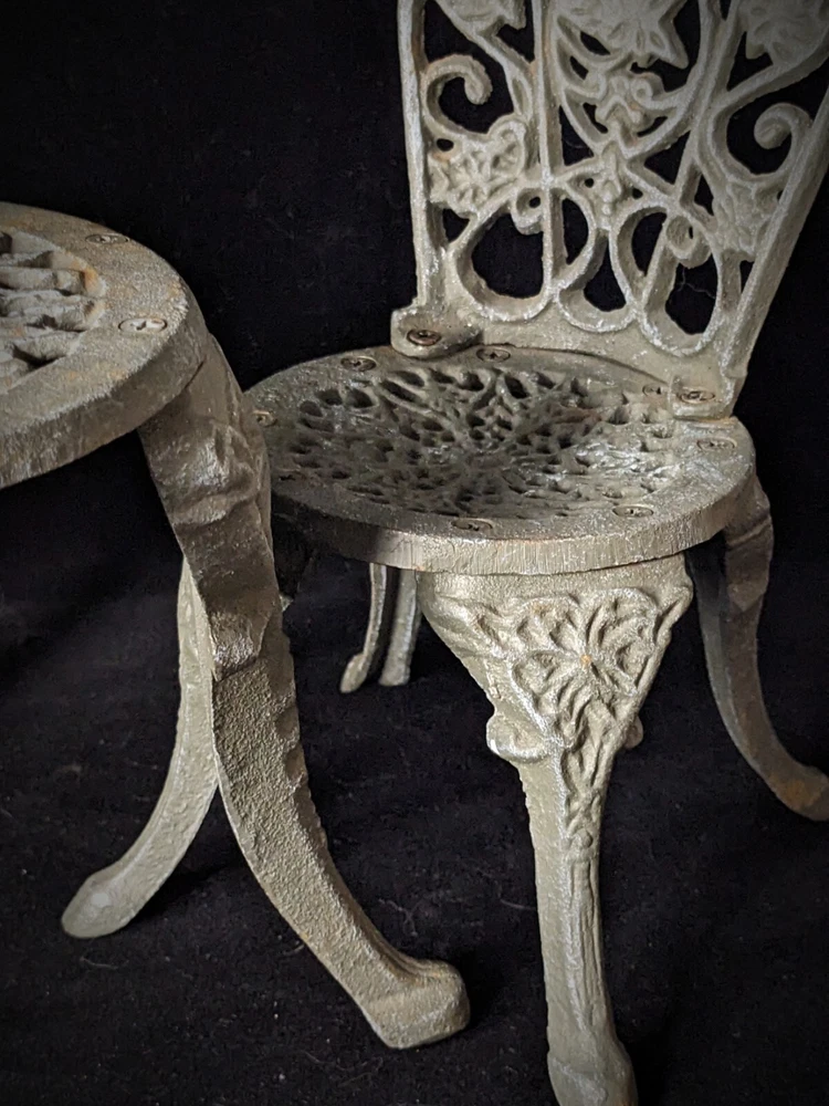 Vintage Victorian style cast-iron garden furniture set for dolls This lovely, early, very well-made, cast iron doll table and two chairs have matching detailed legs with lovely cut-out detail on the chairs. The table stands 16cm high, with a top diameter of 16cm (24cm with feet, at its widest), the chairs stand 23cm high, with a seat diameter of 10,5cm (17,5cm with feet, at its widest), and together weigh a 3,150kg.