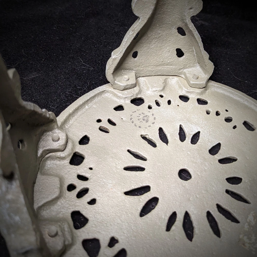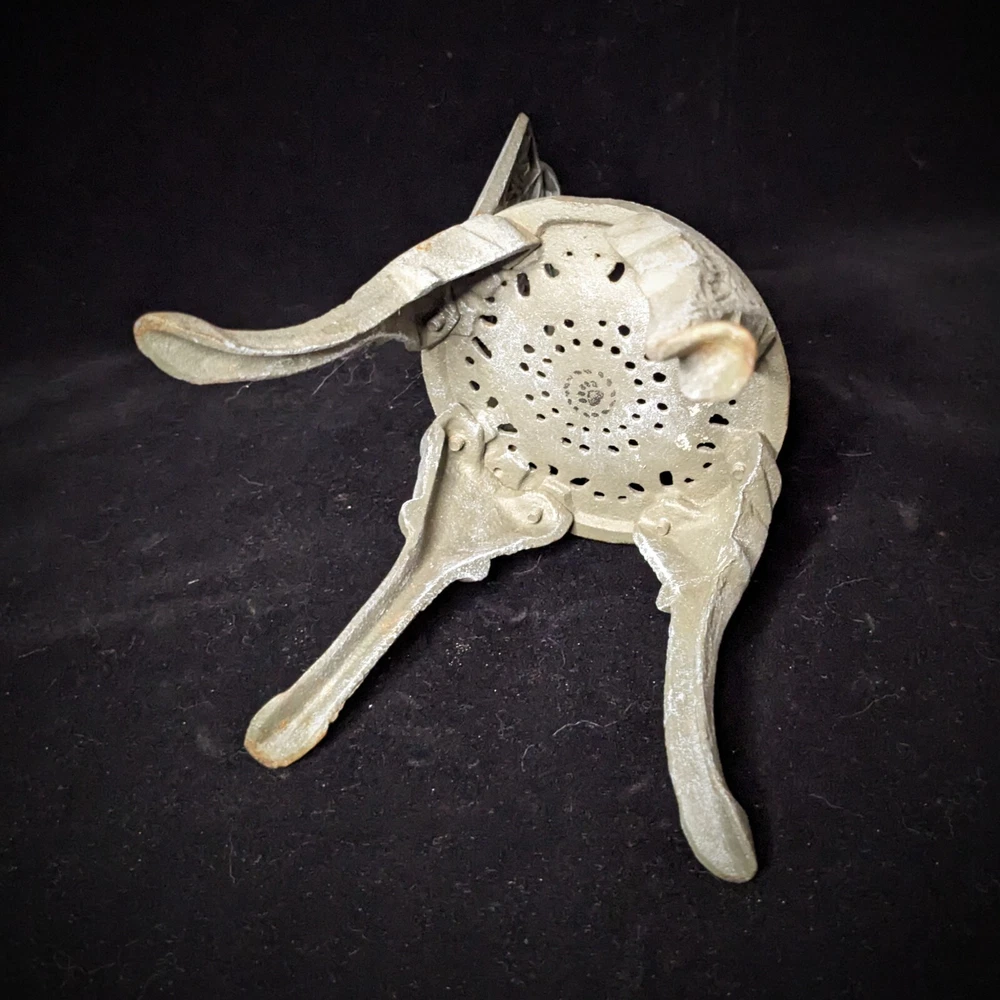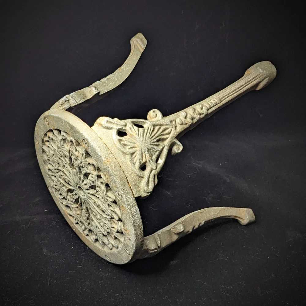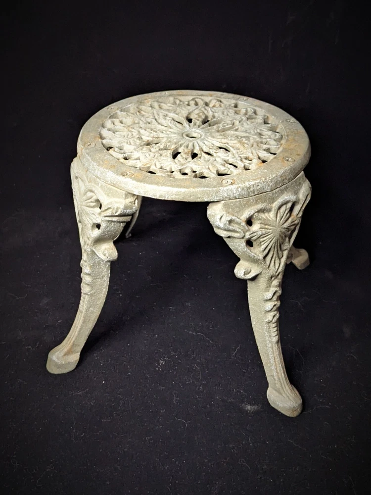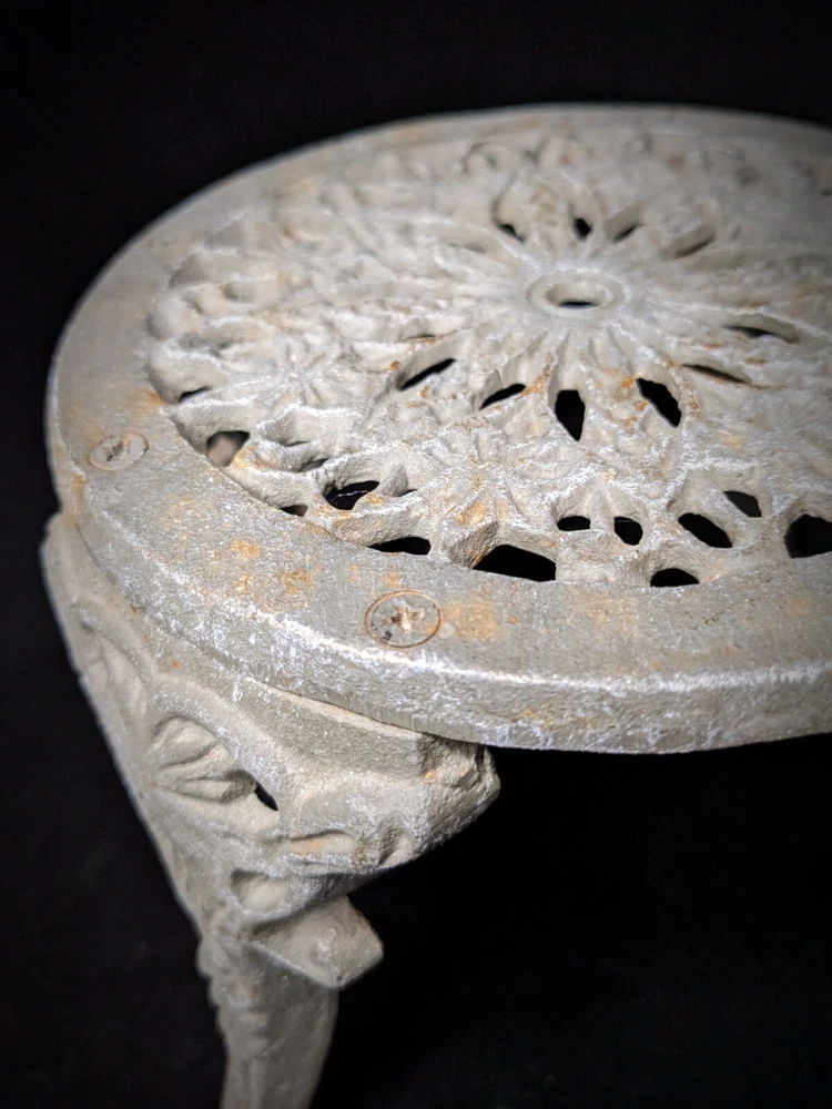 Vintage Victorian style cast-iron garden furniture set for dolls This lovely, early, very well-made, cast iron doll table and two chairs have matching detailed legs with lovely cut-out detail on the chairs. The table stands 16cm high, with a top diameter of 16cm (24cm with feet, at its widest), the chairs stand 23cm high, with a seat diameter of 10,5cm (17,5cm with feet, at its widest), and together weigh a 3,150kg.