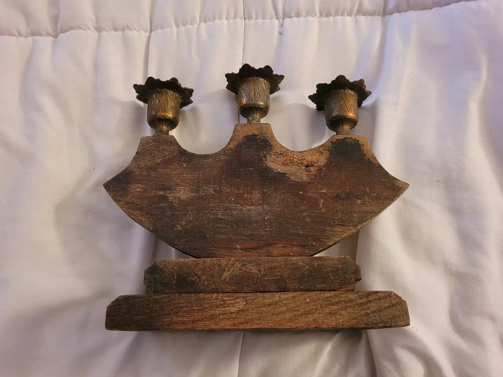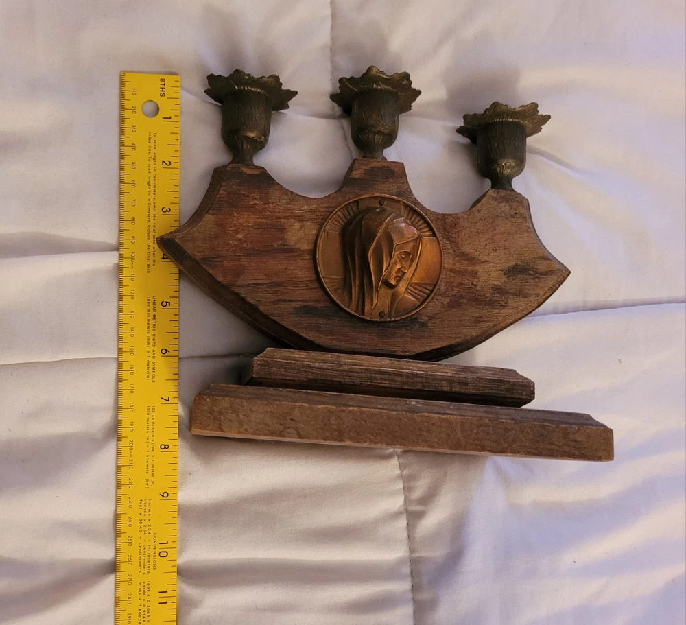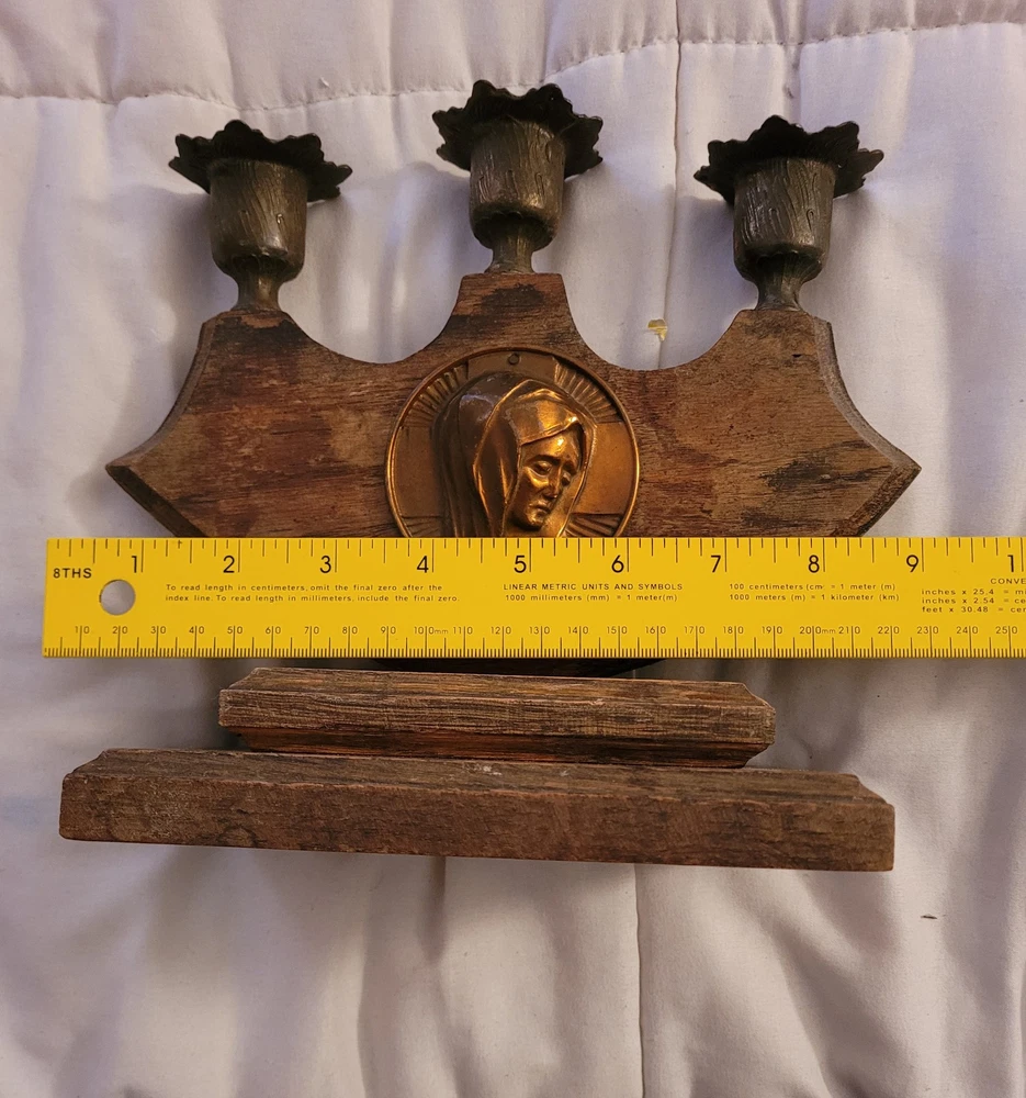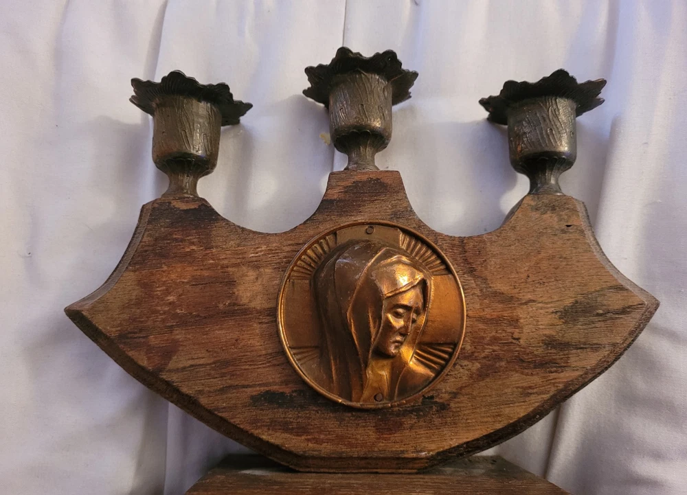 Vintage Virgin Mary Candle Holder Holds 3 Candles Brass Wood Catholic Christian