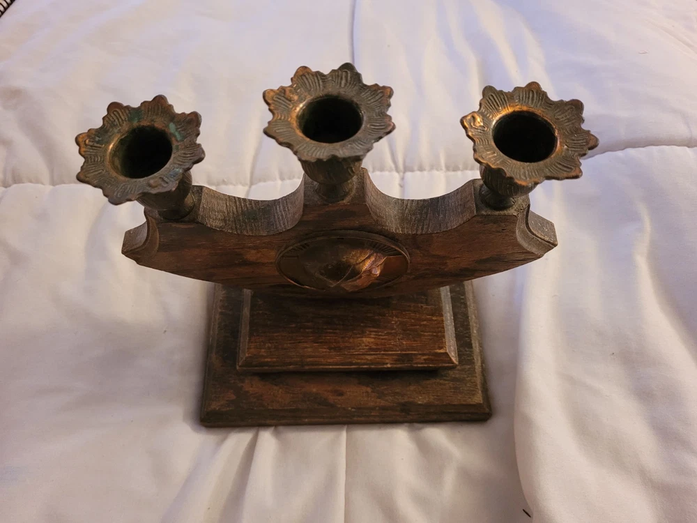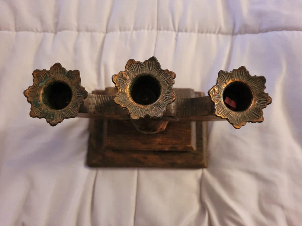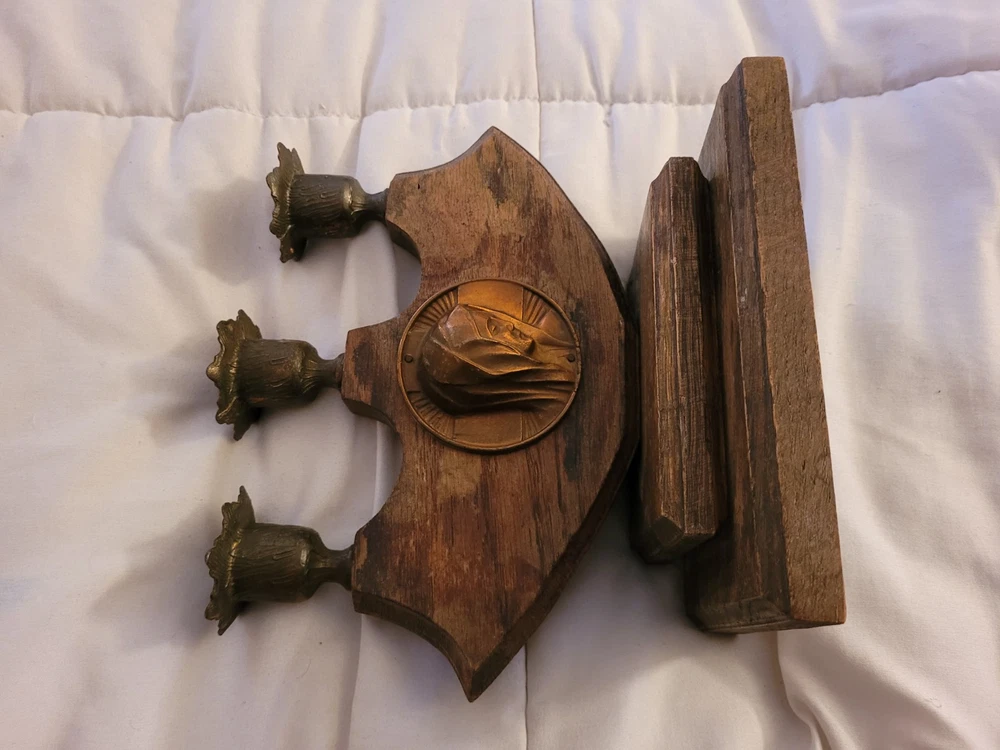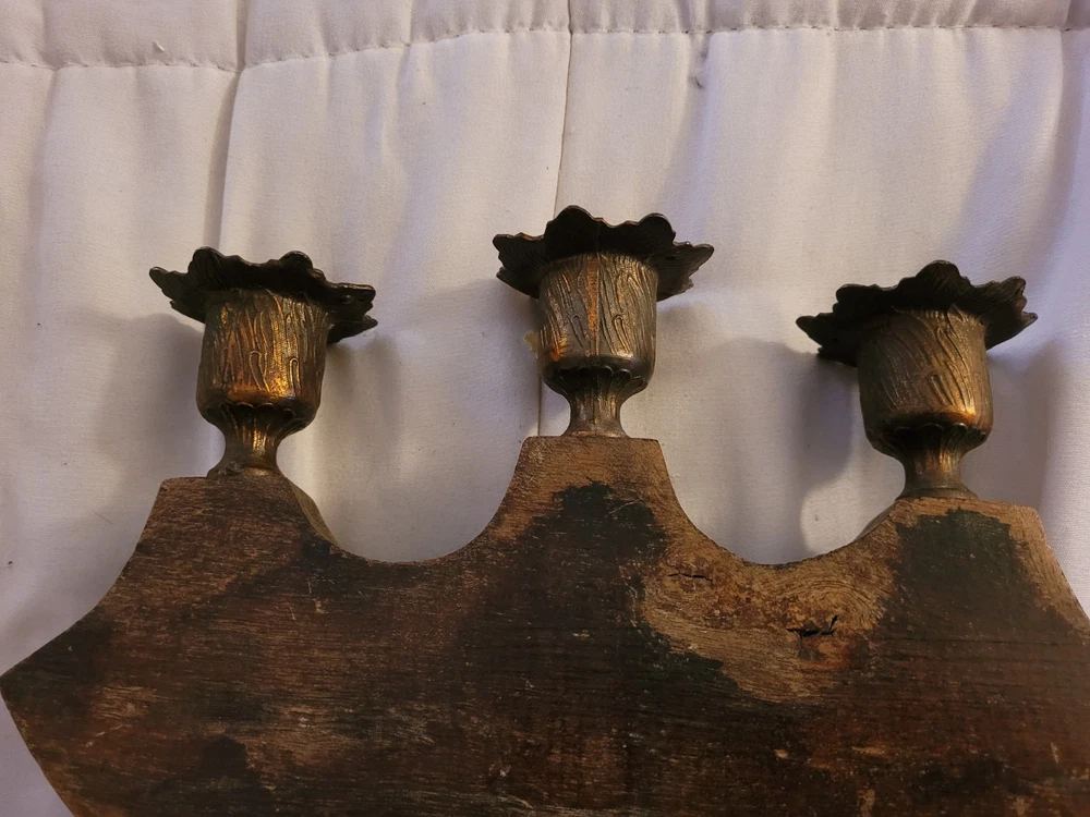 Vintage Virgin Mary Candle Holder Holds 3 Candles Brass Wood Catholic Christian