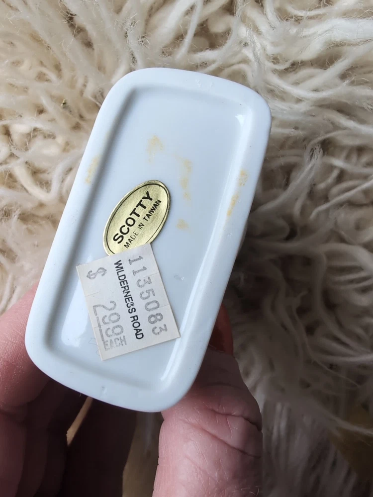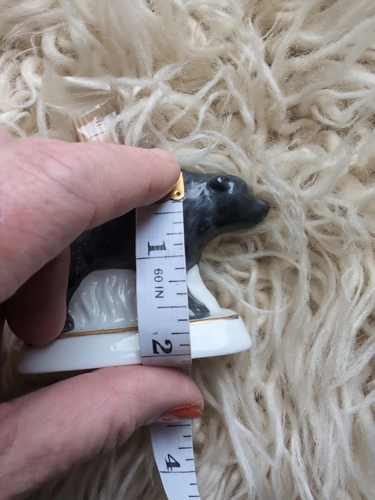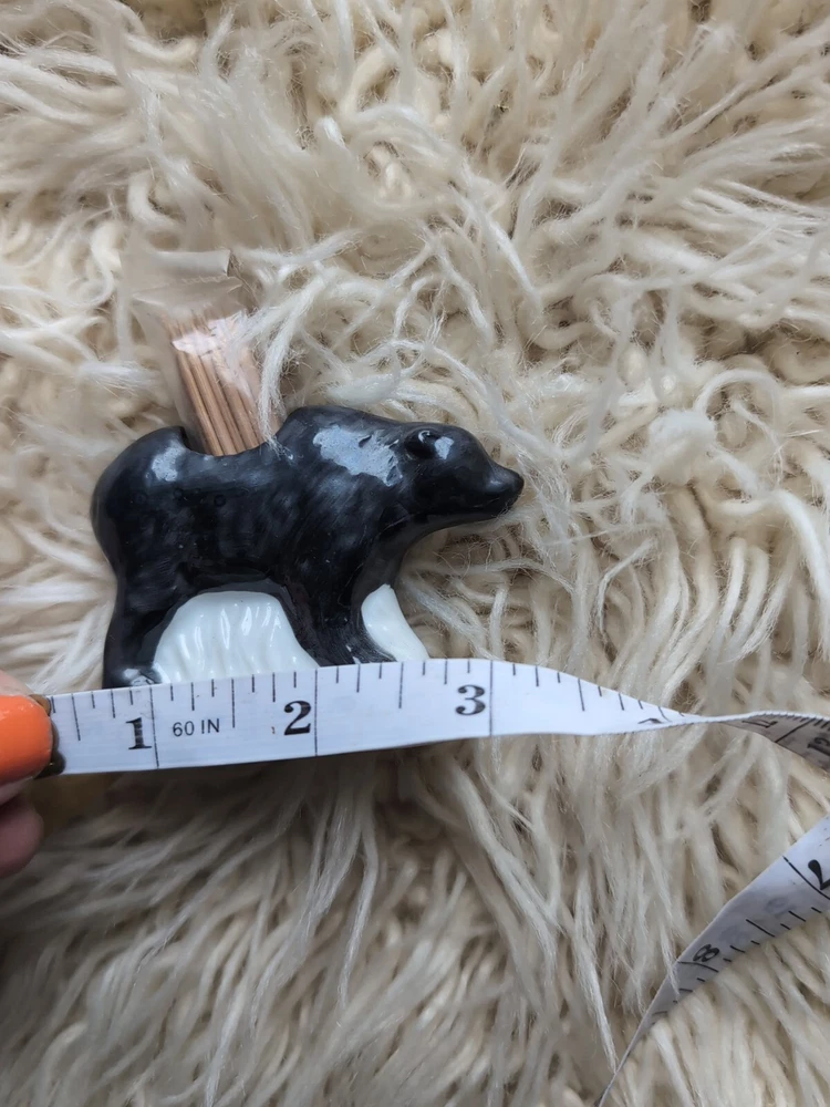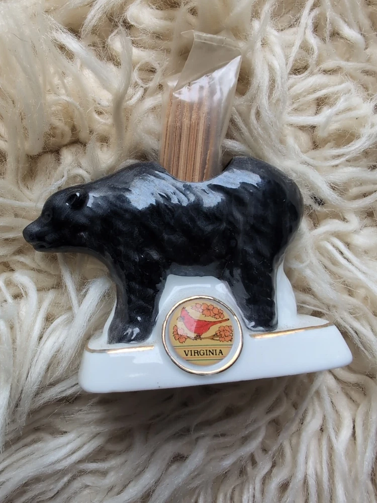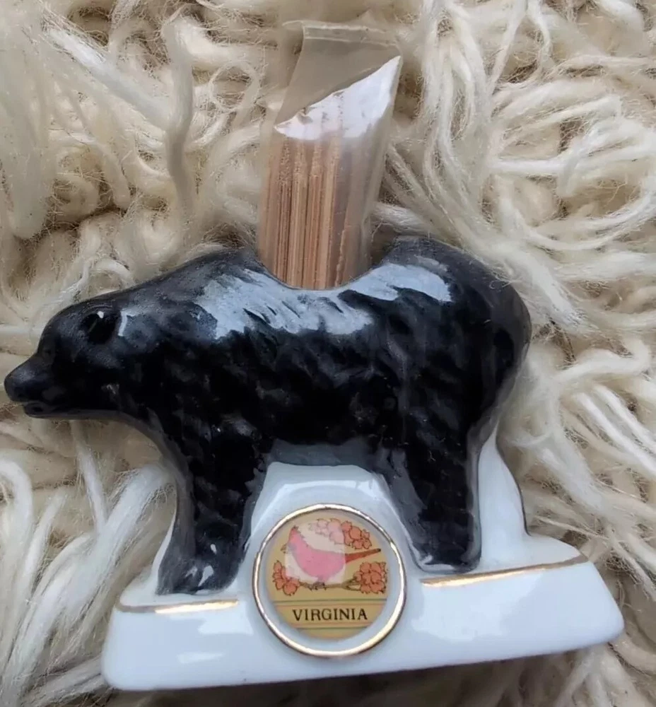 This vintage black bear toothpick holder is a great souvenir from Virginia, featuring a charming cardinal perched on top. It's perfect for collectors of all things Virginia, and would make a lovely addition to any home decor. The holder is crafted with care and attention to detail, and is sure to be a conversation starter for any guest. Whether you're a fan of bears, cardinals, or just looking for a unique piece to display, this toothpick holder is the perfect choice.