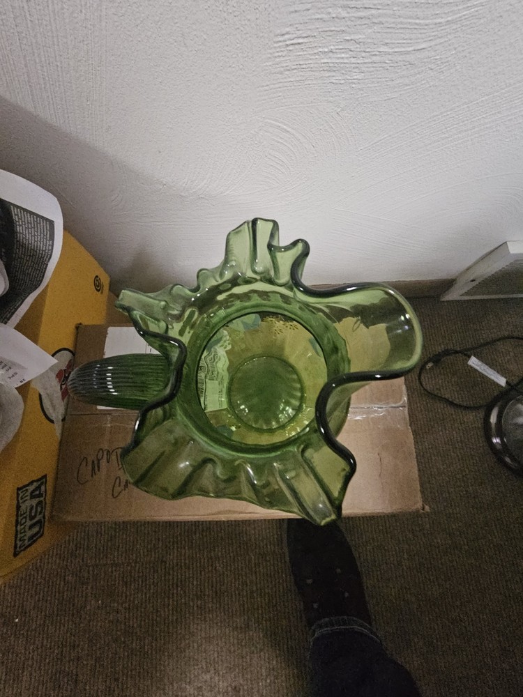 This is part of an estate sale and is sold AS IS, No returns, I will be as detailed and upfront as i can about everything i know about this item. Read full description and look at all pictures before purchasing. Buyer pays shipping and handling & added insurance unless it is noted as free shipping. Will be packaged as safely as possible This vintage water pitcher is made of green glass with a ruffled design, featuring hand-painted abstract art in a depression style. It has a vase pitcher shape. The pitcher is antique, from the mid-20th century, and has a translucent finish with some painted flowers. This unique and handmade piece is perfect for all occasions.