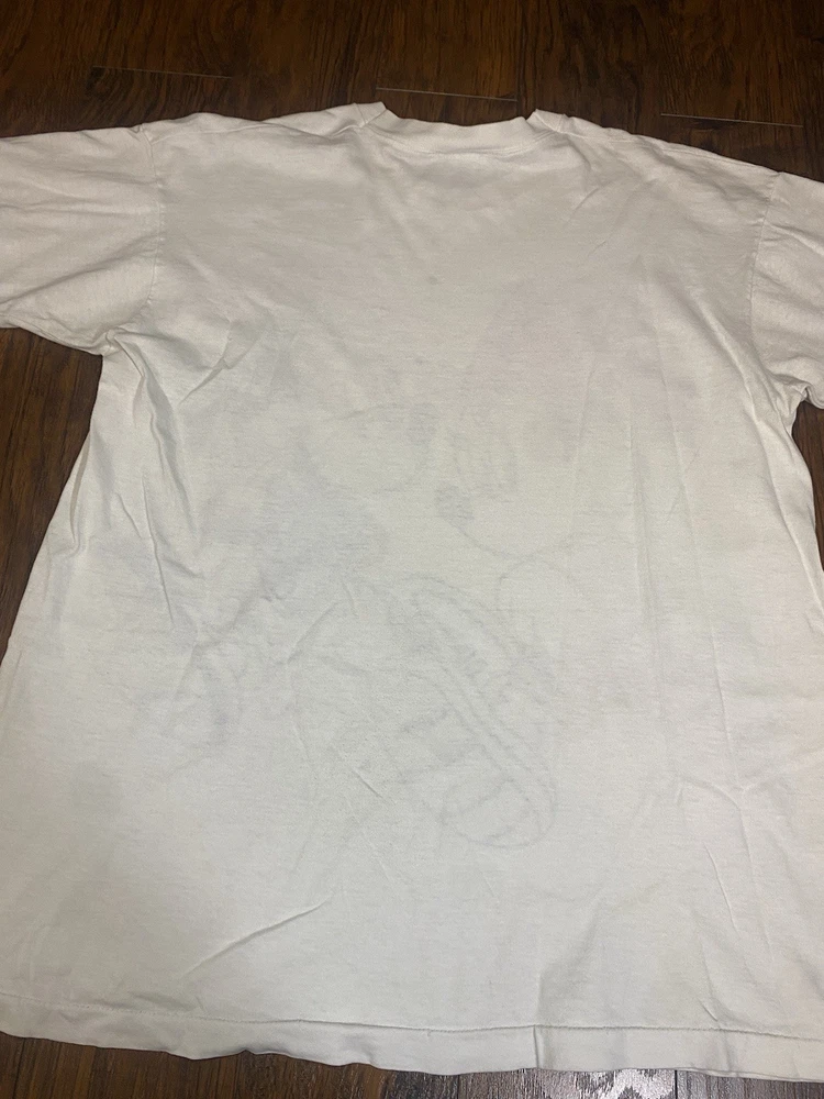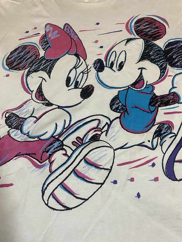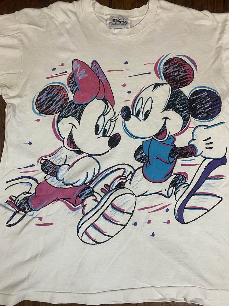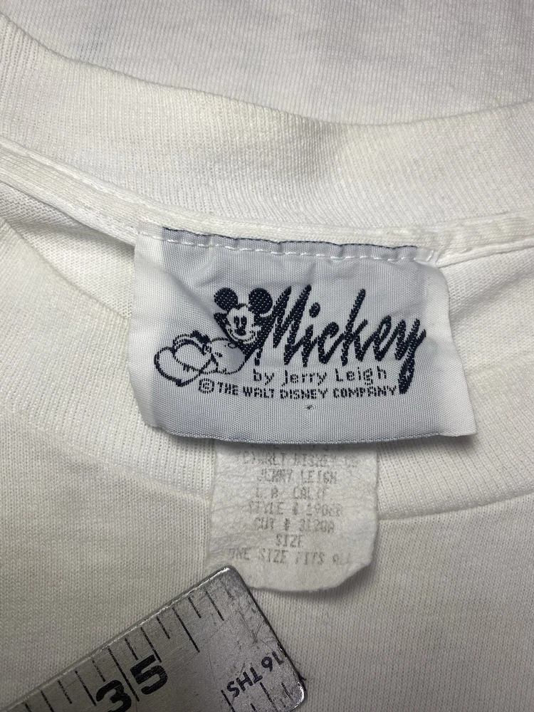 Big print Disney. Tag says one size. Does have some signs of wear which is shown in pictures along with measurements. Packaged safe and shipped quick.