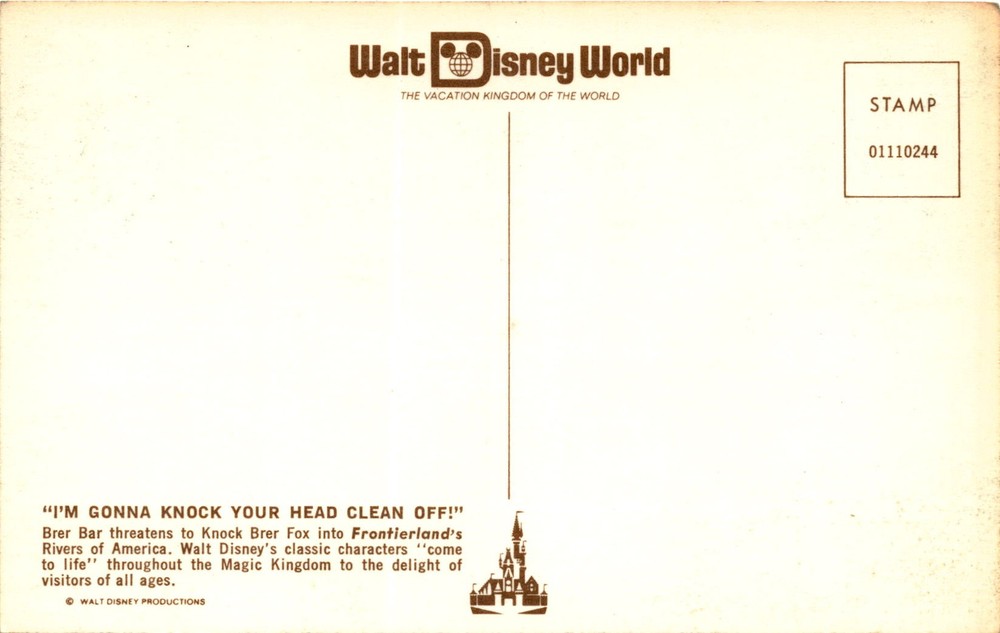 MAKE AN OFFER. THE MORE YOU BUY THE BETTER DEAL I WILL ACCEPT The postcard features an image from Walt Disney World, known as THE VACATION KINGDOM OF THE WORLD. The scene depicted shows Brer Bear threatening Brer Fox near the Rivers of America in Frontierland within the Magic Kingdom. This references Walt Disney's classic characters coming to life in the park, which is a major attraction for visitors of all ages.