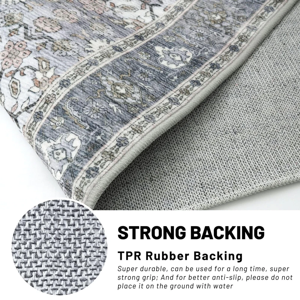 Introducing our versatile and stylish Entry Rug, a perfect addition to any home seeking functionality and aesthetic appeal. This entryway rug is meticulously crafted to cater to a variety of spaces, including bathrooms, kitchens, entryways, and living areas. Our area rugs offer a pop of color that can invigorate any dull space, while the rugs for kitchen floor ensure both style and practicality. This washable area rug is designed with convenience in mind. Featuring a non-slip backing, The non-slip rug backing prevents accidental slips One of the standout features of this entry way rug is its waterproof quality. This makes it an excellent choice for indoor areas prone to moisture, such as bathrooms and kitchens. The waterproof rugs for indoor use protect your floors from water damage, while the throw rug design adds a touch of coziness to your space. Designed to be both functional and decorative, this area rug seamlessly blends into various home decors. Whether you're looking for a small rug for your dorm room, or a chic entryway rug Our entry rugs are available in a variety of styles and colors, including the popular blue kitchen rugs and blue bathroom rugs. The versatility of this product extends to its use as a door mat or a front door mat, providing a welcoming touch to your home. For those who prefer a boho aesthetic, our boho rug options are equally captivating, offering unique patterns that enhance your interior design. Whether you need a durablity laundry room rug or a stylish throw rug for your living room, our washable entry rug is the ideal choice. The high-quality materials ensure longevity, while the non-slip features provide peace of mind. In summary, our Blue Entry Rug is a multifunctional and stylish solution for any home. Its washable, non-slip, and waterproof characteristics make it a practical choice, while the variety of colors and styles ensure it complements any decor. Transform your space with this versatile area rug Key Features: Size: 2.6x16 Feet (31.2x192 Inches), Thickness: 0.24 in., Color: Grey Blue vintage fade with gold patterns. Color Notice: Slight color variations may occur between batches or due to lighting, which can sometimes cause a bluish tone Vintage Design: vintage-inspired runner rug features artfully distressed prints in muted tones, adding timeless elegance to any space. This low-pile polyester rug offers soft warmth & minimal shedding - elegant yet easy-care decor. Secure Non-Slip Design: Non-slip runner rug with skid-proof backing stays securely in place, even in high-traffic areas. Low-pile, shed-resistant surface is perfect for homes with kids/pets. For best grip, keep underside dry. Thin & Sturdy: This 0.24'' rug glides effortlessly under doors with 0.3"+ gaps, blending form and function. Crafted from dense, fade-defying fibers, its low-profile design resists crushing and wear while maintaining plush comfort underfoot. The ultra-thin build eliminates door snags, ensures easy cleaning, and slips seamlessly into high-traffic spaces—perfect for hallways, kitchens, and entryways. Easy-Care Rug: A quick sweep or wipe for daily cleaning. when vacuuming, use a low-speed setting or a robotic vacuum to prevent shifting due to the soft backing. For deep cleaning, machine wash in cold water and avoid bleach to maintain colors. Foldable Runner Rug: To remove creases, roll in the opposite direction or press flat. For best results: 1. Iron the back on low with a damp cloth; 2. Keep rolled in reverse for 2–3 days; 3. Use weights if needed.