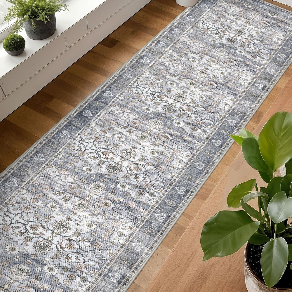 Introducing our versatile and stylish Entry Rug, a perfect addition to any home seeking functionality and aesthetic appeal. This entryway rug is meticulously crafted to cater to a variety of spaces, including bathrooms, kitchens, entryways, and living areas. Our area rugs offer a pop of color that can invigorate any dull space, while the rugs for kitchen floor ensure both style and practicality. This washable area rug is designed with convenience in mind. Featuring a non-slip backing, The non-slip rug backing prevents accidental slips One of the standout features of this entry way rug is its waterproof quality. This makes it an excellent choice for indoor areas prone to moisture, such as bathrooms and kitchens. The waterproof rugs for indoor use protect your floors from water damage, while the throw rug design adds a touch of coziness to your space. Designed to be both functional and decorative, this area rug seamlessly blends into various home decors. Whether you're looking for a small rug for your dorm room, or a chic entryway rug Our entry rugs are available in a variety of styles and colors, including the popular blue kitchen rugs and blue bathroom rugs. The versatility of this product extends to its use as a door mat or a front door mat, providing a welcoming touch to your home. For those who prefer a boho aesthetic, our boho rug options are equally captivating, offering unique patterns that enhance your interior design. Whether you need a durablity laundry room rug or a stylish throw rug for your living room, our washable entry rug is the ideal choice. The high-quality materials ensure longevity, while the non-slip features provide peace of mind. In summary, our Blue Entry Rug is a multifunctional and stylish solution for any home. Its washable, non-slip, and waterproof characteristics make it a practical choice, while the variety of colors and styles ensure it complements any decor. Transform your space with this versatile area rug Key Features: Size: 2.6x16 Feet (31.2x192 Inches), Thickness: 0.24 in., Color: Grey Blue vintage fade with gold patterns. Color Notice: Slight color variations may occur between batches or due to lighting, which can sometimes cause a bluish tone Vintage Design: vintage-inspired runner rug features artfully distressed prints in muted tones, adding timeless elegance to any space. This low-pile polyester rug offers soft warmth & minimal shedding - elegant yet easy-care decor. Secure Non-Slip Design: Non-slip runner rug with skid-proof backing stays securely in place, even in high-traffic areas. Low-pile, shed-resistant surface is perfect for homes with kids/pets. For best grip, keep underside dry. Thin & Sturdy: This 0.24'' rug glides effortlessly under doors with 0.3"+ gaps, blending form and function. Crafted from dense, fade-defying fibers, its low-profile design resists crushing and wear while maintaining plush comfort underfoot. The ultra-thin build eliminates door snags, ensures easy cleaning, and slips seamlessly into high-traffic spaces—perfect for hallways, kitchens, and entryways. Easy-Care Rug: A quick sweep or wipe for daily cleaning. when vacuuming, use a low-speed setting or a robotic vacuum to prevent shifting due to the soft backing. For deep cleaning, machine wash in cold water and avoid bleach to maintain colors. Foldable Runner Rug: To remove creases, roll in the opposite direction or press flat. For best results: 1. Iron the back on low with a damp cloth; 2. Keep rolled in reverse for 2–3 days; 3. Use weights if needed.
