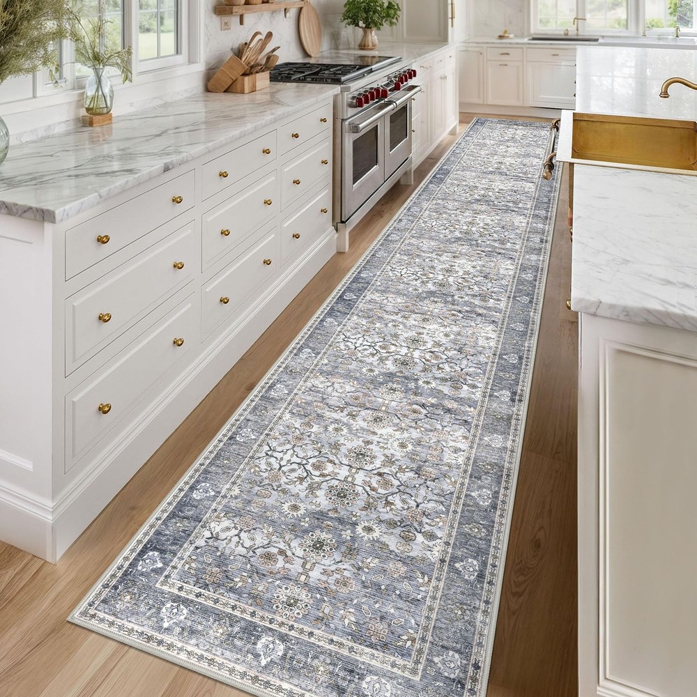 Introducing our versatile and stylish Entry Rug, a perfect addition to any home seeking functionality and aesthetic appeal. This entryway rug is meticulously crafted to cater to a variety of spaces, including bathrooms, kitchens, entryways, and living areas. Our area rugs offer a pop of color that can invigorate any dull space, while the rugs for kitchen floor ensure both style and practicality. This washable area rug is designed with convenience in mind. Featuring a non-slip backing, The non-slip rug backing prevents accidental slips One of the standout features of this entry way rug is its waterproof quality. This makes it an excellent choice for indoor areas prone to moisture, such as bathrooms and kitchens. The waterproof rugs for indoor use protect your floors from water damage, while the throw rug design adds a touch of coziness to your space. Designed to be both functional and decorative, this area rug seamlessly blends into various home decors. Whether you're looking for a small rug for your dorm room, or a chic entryway rug Our entry rugs are available in a variety of styles and colors, including the popular blue kitchen rugs and blue bathroom rugs. The versatility of this product extends to its use as a door mat or a front door mat, providing a welcoming touch to your home. For those who prefer a boho aesthetic, our boho rug options are equally captivating, offering unique patterns that enhance your interior design. Whether you need a durablity laundry room rug or a stylish throw rug for your living room, our washable entry rug is the ideal choice. The high-quality materials ensure longevity, while the non-slip features provide peace of mind. In summary, our Blue Entry Rug is a multifunctional and stylish solution for any home. Its washable, non-slip, and waterproof characteristics make it a practical choice, while the variety of colors and styles ensure it complements any decor. Transform your space with this versatile area rug Key Features: Size: 2.6x16 Feet (31.2x192 Inches), Thickness: 0.24 in., Color: Grey Blue vintage fade with gold patterns. Color Notice: Slight color variations may occur between batches or due to lighting, which can sometimes cause a bluish tone Vintage Design: vintage-inspired runner rug features artfully distressed prints in muted tones, adding timeless elegance to any space. This low-pile polyester rug offers soft warmth & minimal shedding - elegant yet easy-care decor. Secure Non-Slip Design: Non-slip runner rug with skid-proof backing stays securely in place, even in high-traffic areas. Low-pile, shed-resistant surface is perfect for homes with kids/pets. For best grip, keep underside dry. Thin & Sturdy: This 0.24'' rug glides effortlessly under doors with 0.3"+ gaps, blending form and function. Crafted from dense, fade-defying fibers, its low-profile design resists crushing and wear while maintaining plush comfort underfoot. The ultra-thin build eliminates door snags, ensures easy cleaning, and slips seamlessly into high-traffic spaces—perfect for hallways, kitchens, and entryways. Easy-Care Rug: A quick sweep or wipe for daily cleaning. when vacuuming, use a low-speed setting or a robotic vacuum to prevent shifting due to the soft backing. For deep cleaning, machine wash in cold water and avoid bleach to maintain colors. Foldable Runner Rug: To remove creases, roll in the opposite direction or press flat. For best results: 1. Iron the back on low with a damp cloth; 2. Keep rolled in reverse for 2–3 days; 3. Use weights if needed.