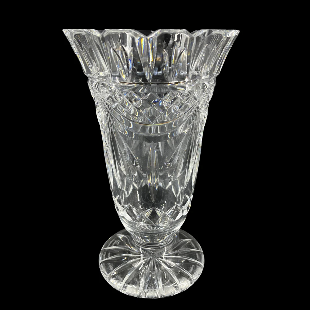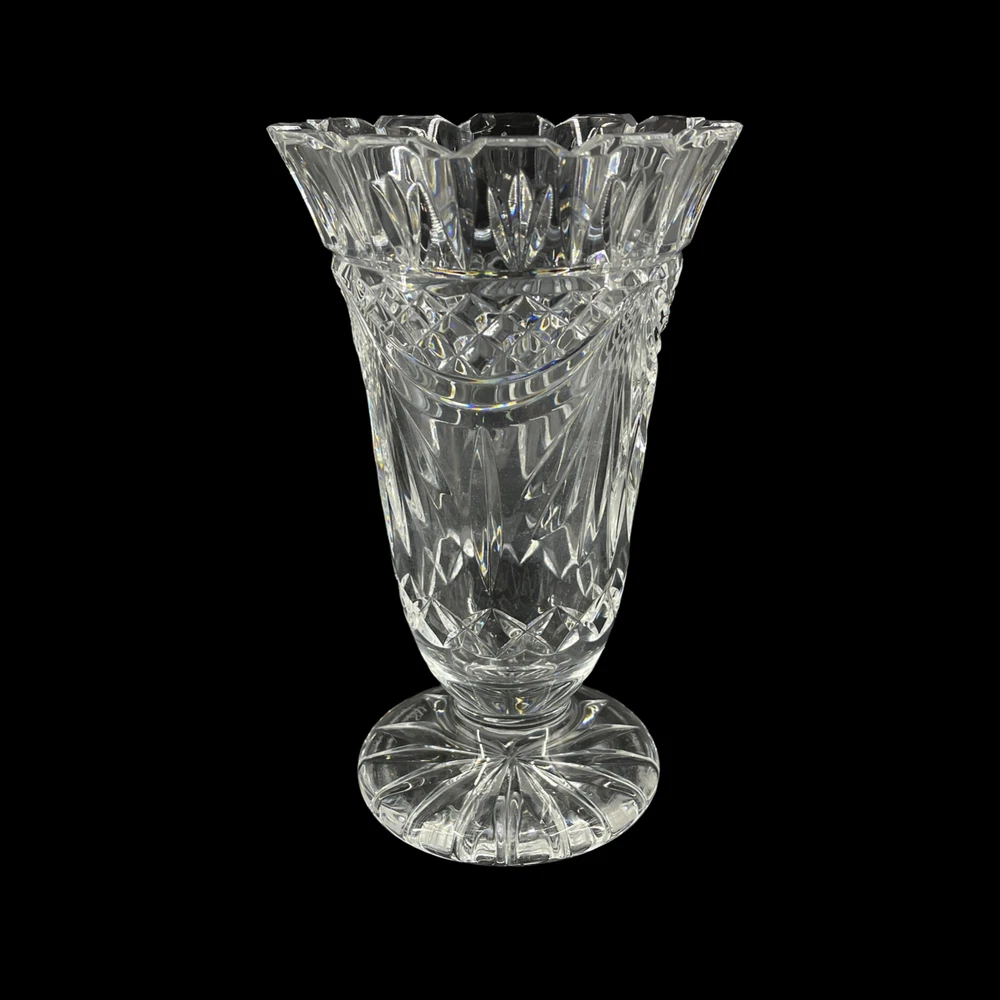 Vintage Waterford Crystal 1995 WS Waterford Society Footed Penrose Flower Vase Gorgeous WS Waterford Society vase with castle cut top rim. Acid etched on base. 8 1/2" tall and 5" diameter at top rim.