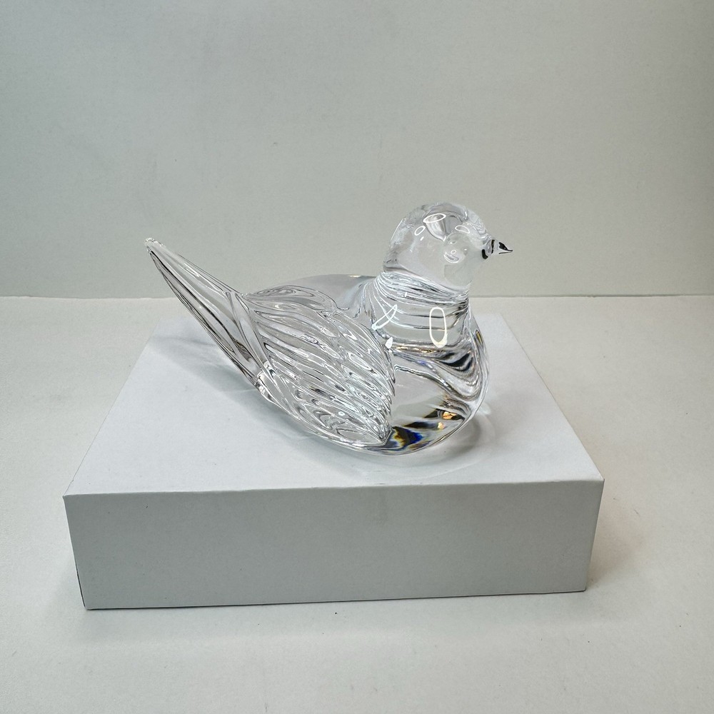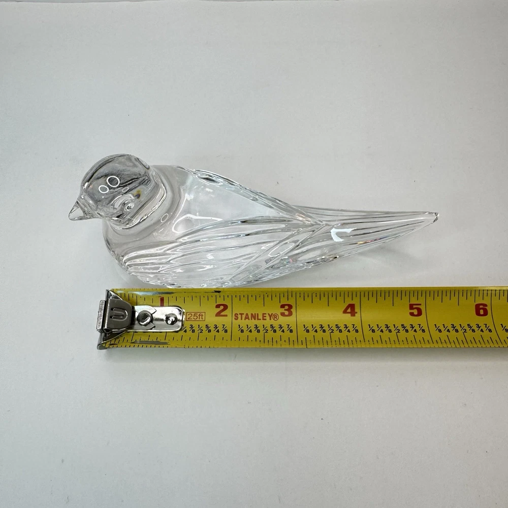 Add a touch of vintage elegance to your desk with this charming Waterford crystal bird paperweight. The intricate detailing and clear crystal material make it a beautiful addition to any collection. The tiny rough edge on the tail is the only flaw, but it doesn't detract from the overall beauty of the piece. This paperweight is perfect for collectors or as a unique gift for someone special. There is a small rough spot at the tip of the tail feather. To my eyes, I can’t see a chip, but can feel roughness when the rest is smooth. Please see photos for details.
