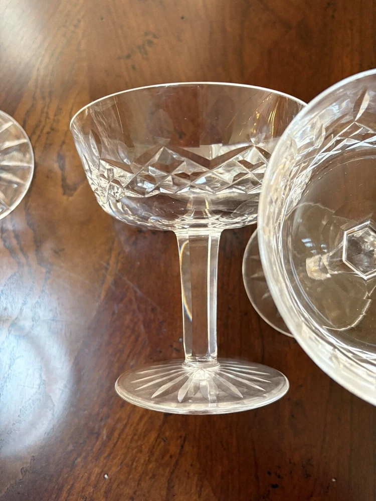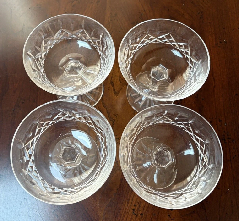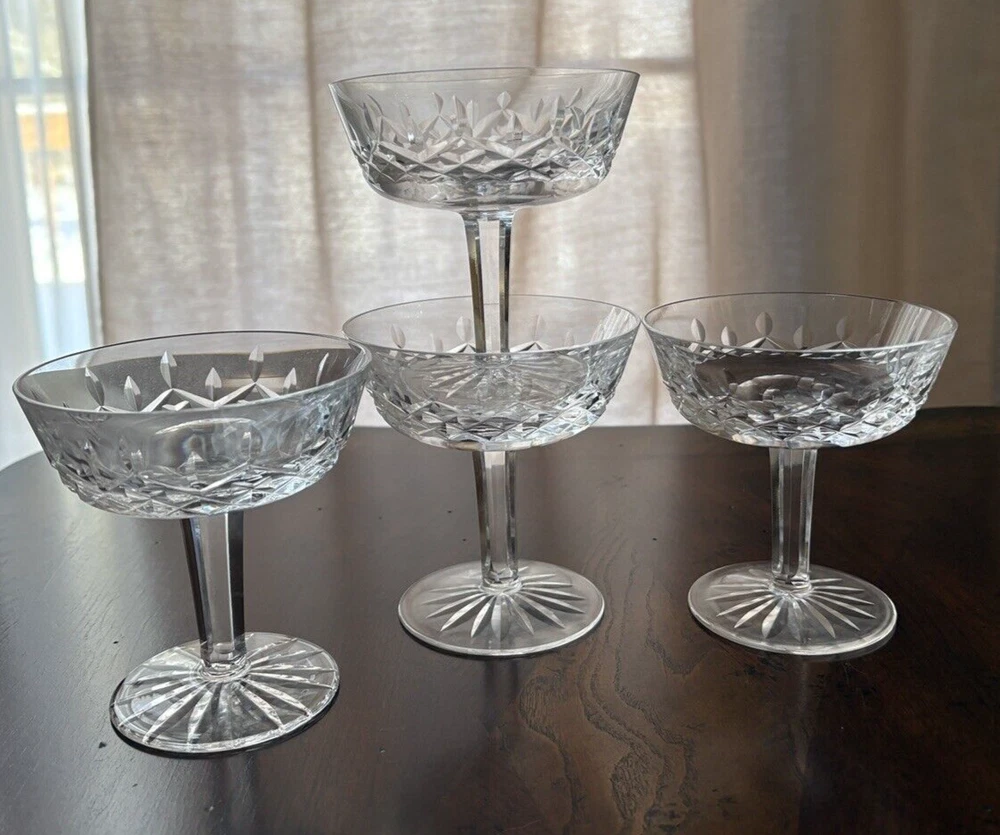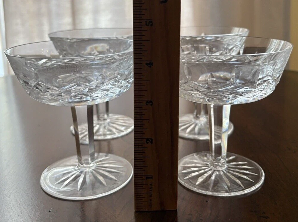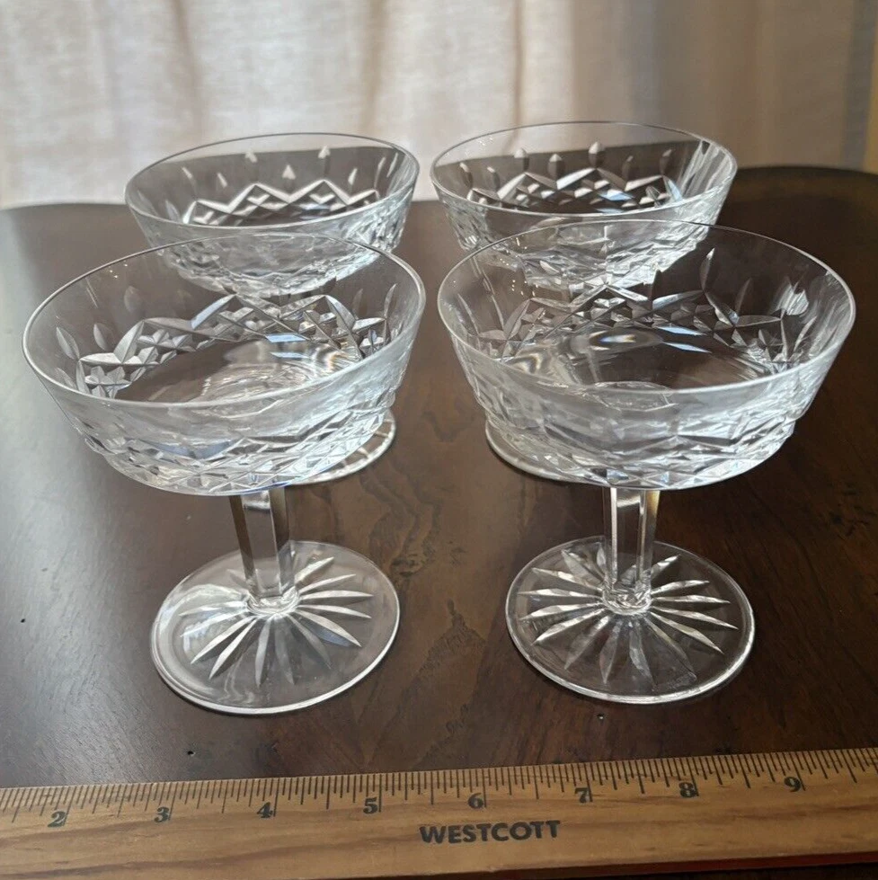 Set of 4 Waterford, Lismore pattern champaign glasses. They are in excellent condition. Measures ( approx.): 4" DIA rim, 4.25" H. They are etched marked. Please see photos for more details. Please note that the item is vintage and may show signs of wear. We have done our best to honestly and accurately describe and photograph the item, including possible flaws. What you see are the actual photos of the item being sold. If you have any questions regarding the item, please ask! We DO NOT SELL outside United States. SHIPPING The item will be shipped within three business days after receipt of payment. We ship via USPS to any location within the 48 continental United States, NO INTERNATIONAL SHIPPING. Shipping is calculated by EBAY based on the weight and size of the item plus packaging. We can combine shipping in case you buy multiple items that can be safely shipped together. Thanks for looking!