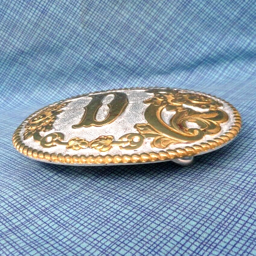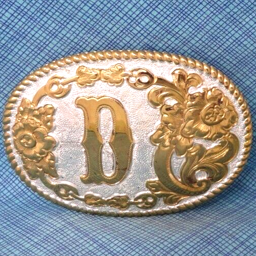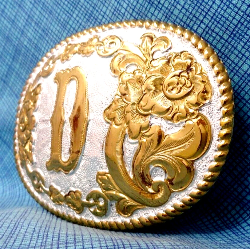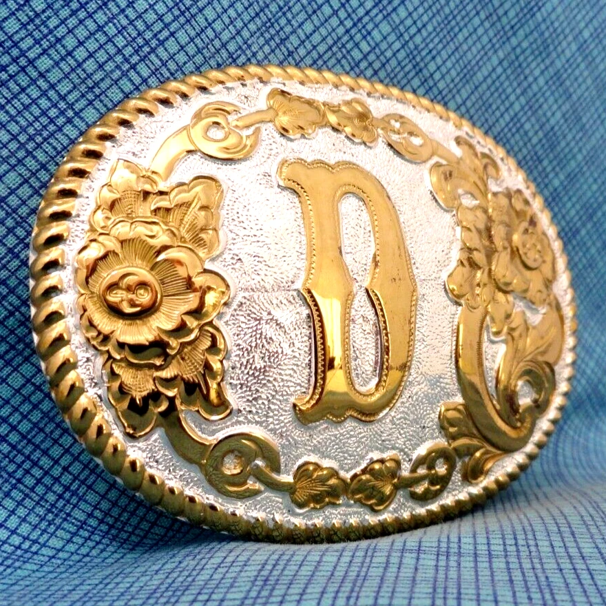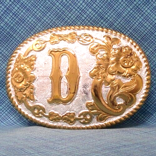 D Belt Buckle Western Initial D Monogram Vintage Crumrine USA HSPOJB ...an awesome old western style, initial "D" belt buckle. This is a bright silver and gold tone metal buckle with a classic scroll and flourish design, tagged: Heavy Silver Plate on Jewelers Bronze, made by Crumrine Mfg., back in the 1980s-90s. It is in pretty nice condition, as shown in the photos it does have some wear and tear from age and use. This buckle measures approximately 3-3/4" x 2-5/8", it fits a 1-1/2" wide belt and it weighs about 4 oz. Please ask any questions before you buy and look at all the photos. Thank you. * For 1000s of other vintage belt buckles, sorted by category, please check out my eBay shop: https://www.ebay.com/str/rockymountainpicker/Vintage-Belt-Buckles/_i.html?store_cat=3781848319 , I will combine shipping on multi-item purchases to help save you some money. Thank you.