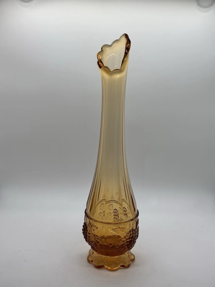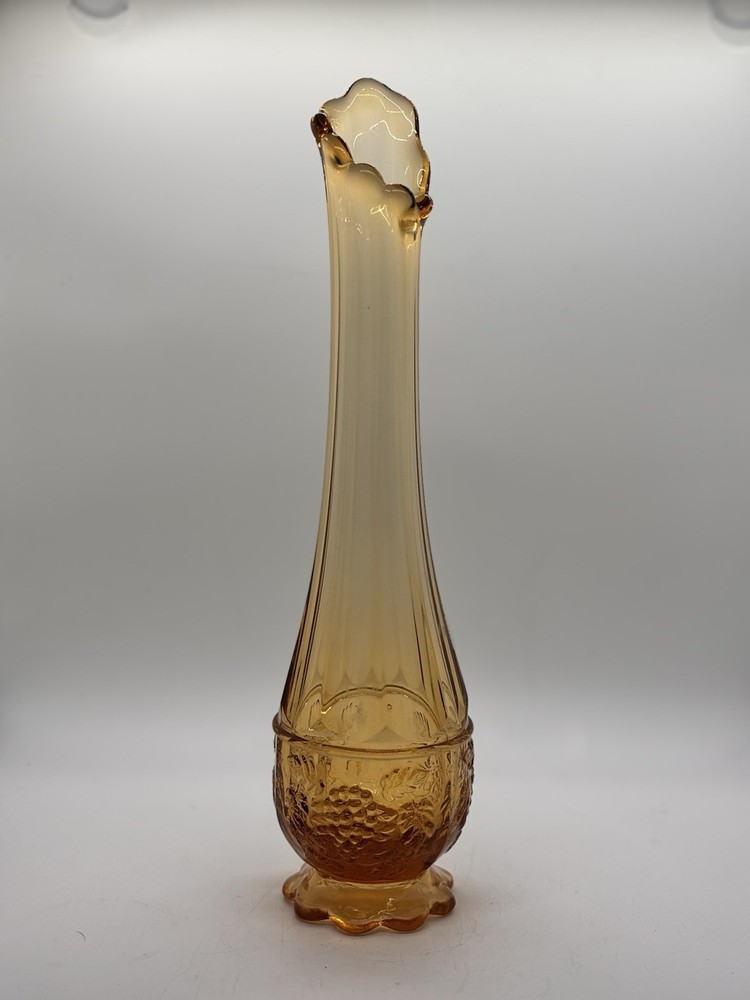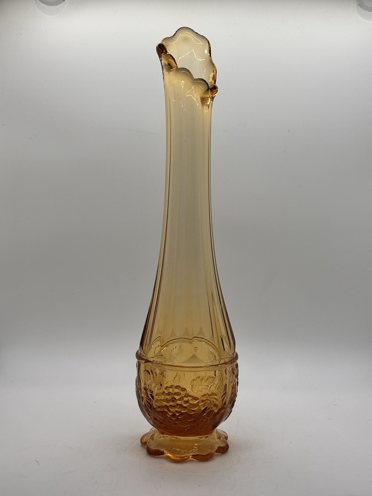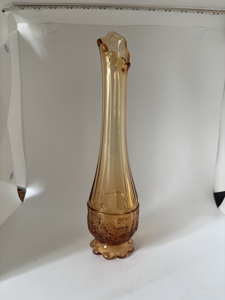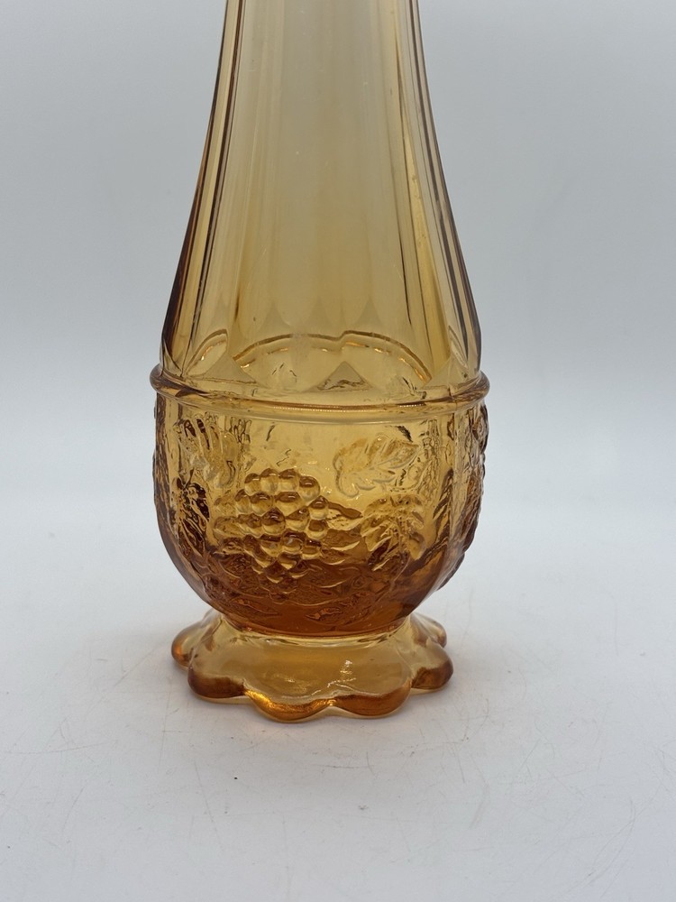 Westmoreland swung vase , paneled with grape leaves and bunches design Not a true amber , a little more to peach color 11.5” h base is 2.5” Perfect condition no glass sickness or chips Experienced packing and fast shipping