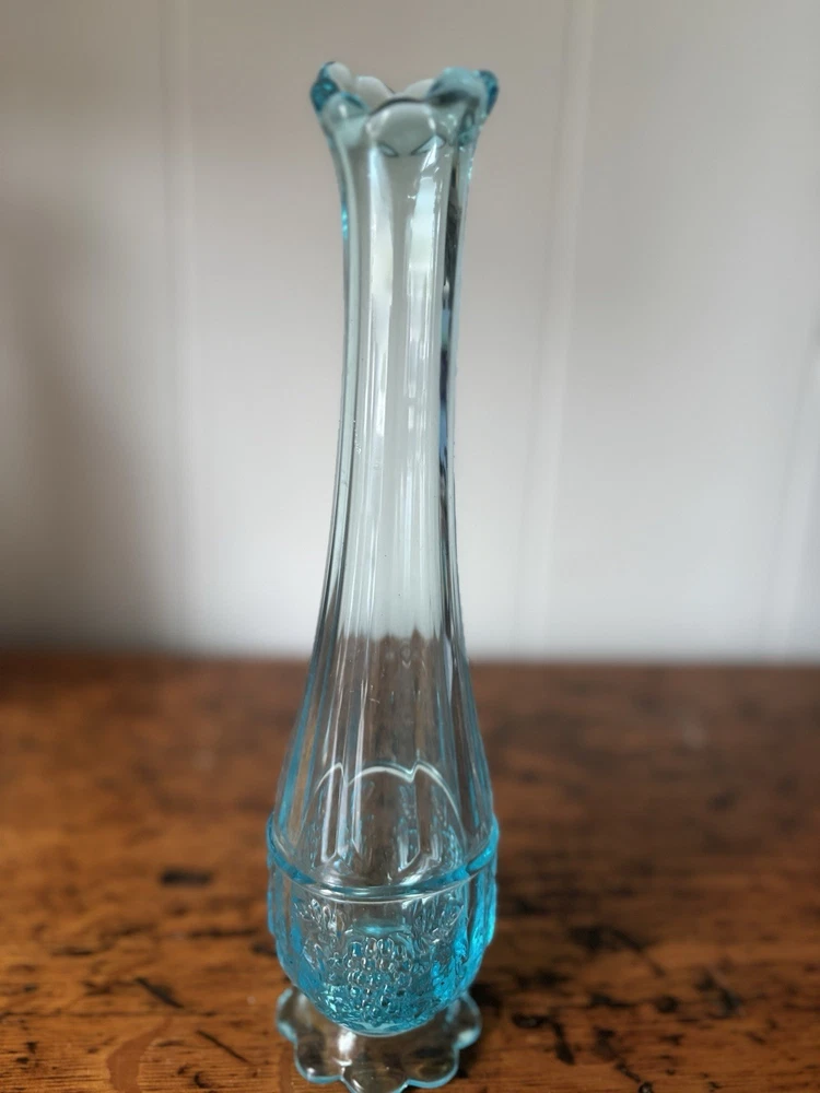 Westmoreland swung vase , paneled with grape leaves and bunches design Teal Aqua light blue 11.5” h base is 2.5” Perfect condition no glass sickness or chips Experienced packing and fast shipping