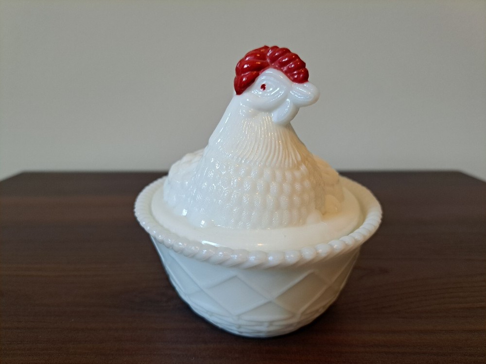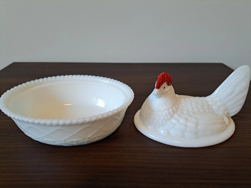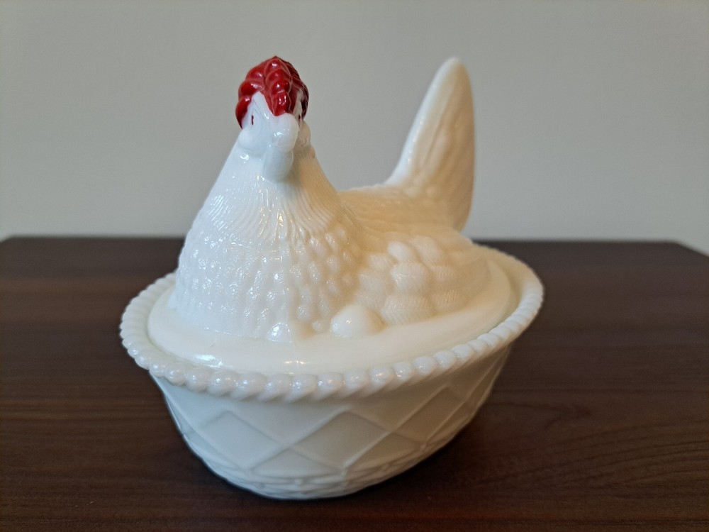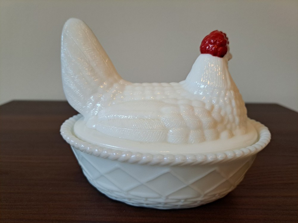 Vintage WESTMORELAND Nesting Hen Milk Glass Dish - 4 1/2 " Tall. The company stamp is on the inside of the top. There is a slight imperfection on the inside rim of the base piece. There is a picture that captures this. See all the pictures for the overall condition of the item. Let me know of any questions or if you need additional pictures. Thanks for your interest!