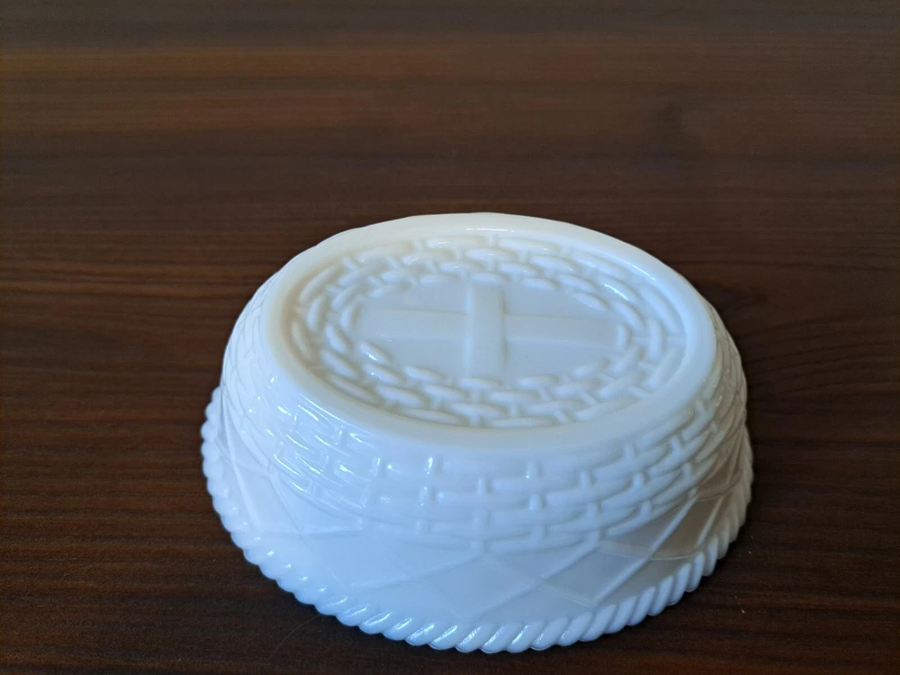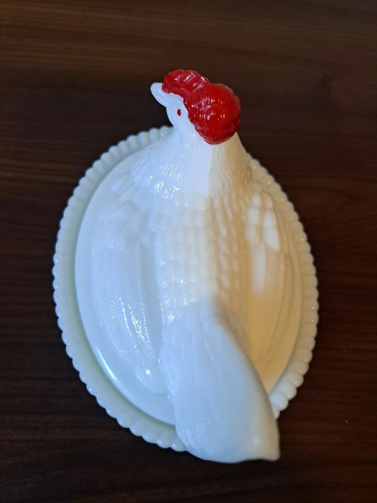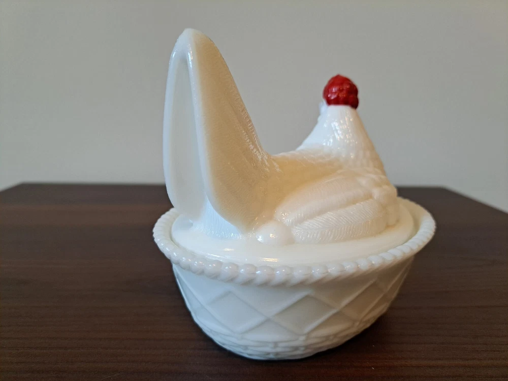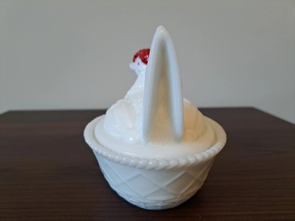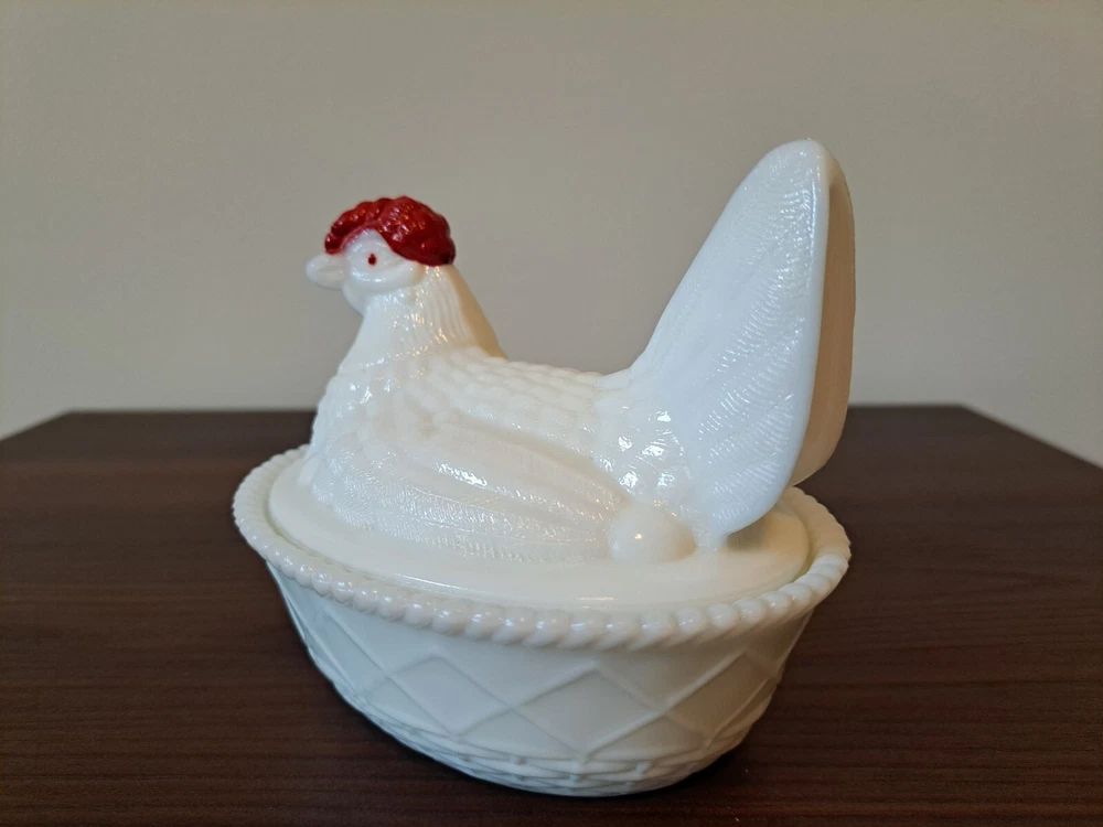 Vintage WESTMORELAND Nesting Hen Milk Glass Dish - 4 1/2 " Tall. The company stamp is on the inside of the top. There is a slight imperfection on the inside rim of the base piece. There is a picture that captures this. See all the pictures for the overall condition of the item. Let me know of any questions or if you need additional pictures. Thanks for your interest!