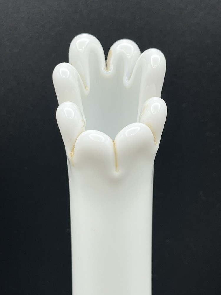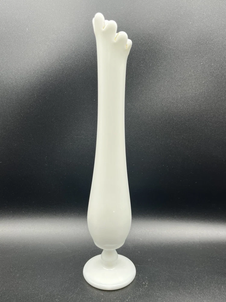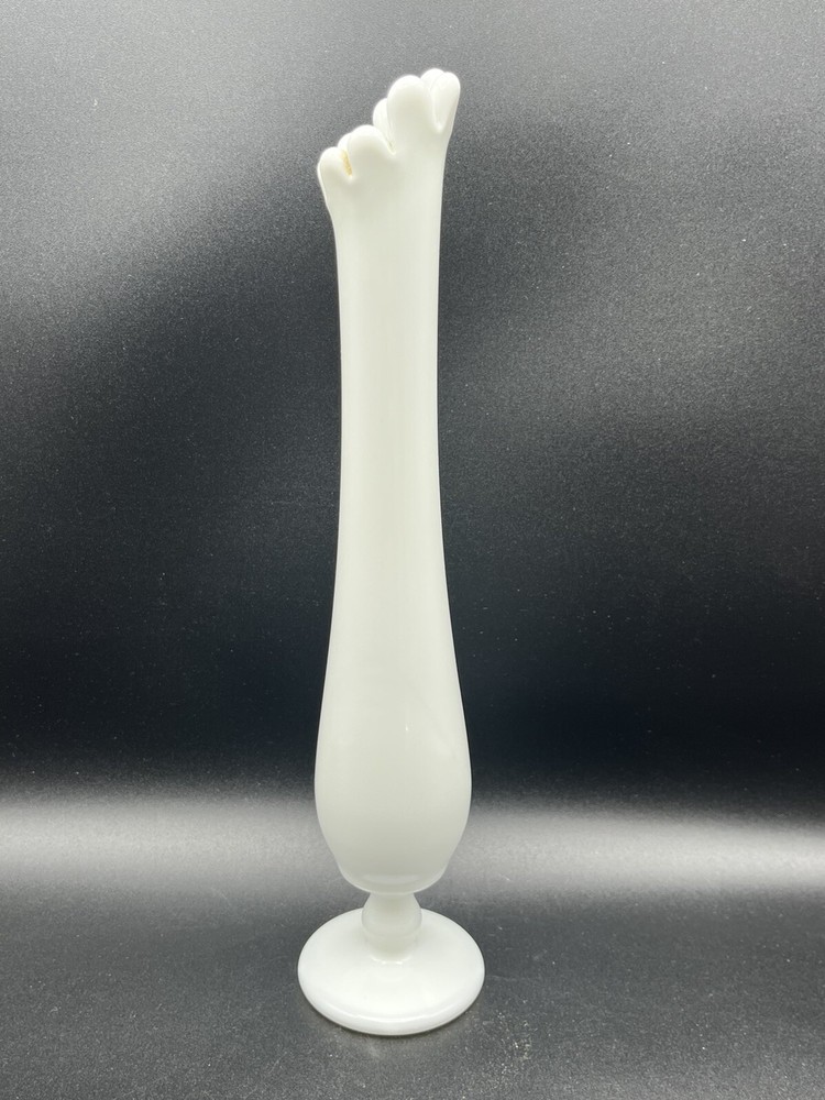 This vintage Westmoreland bud vase is a mid-century modern piece from the 1950s, originating from the United States. Handmade from white milk glass, it stands at 10.75 inches tall on a pedestal base. The vase features a hand-blown swung design with a glossy finish, making it a decorative and elegant addition to any space. Perfect for displaying flowers, this original piece embodies the charm and craftsmanship of mid-20th-century glassware.